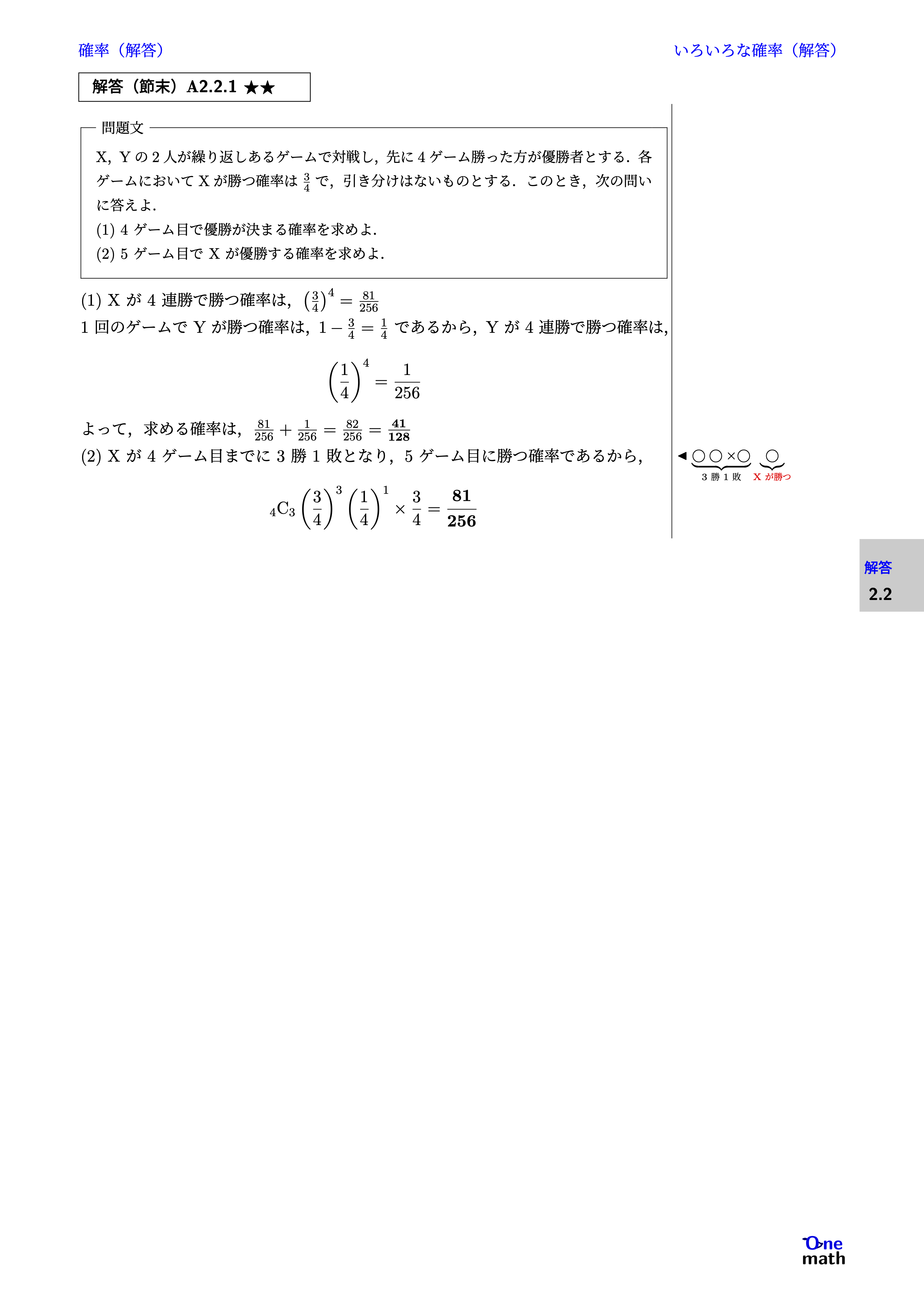 (1)Xが4連勝で勝つ確率は, $ \left(\frac{3}{4}\right)^4 = \frac{81}{256}$ 1回のゲームでYが勝つ確率は, $ 1 - \frac{3}{4} = \frac{1}{4}$ であるから,Yが4連勝で勝つ確率は, $$ \left(\frac{1}{4}\right)^4 = \frac{1}{256}$$ よって,求める確率は, $ \frac{81}{256} + \frac{1}{256} = \frac{82}{256} = \frac{41}{128}$ (2)Xが4ゲーム目までに3勝1敗となり,5ゲーム目に勝つ確率であるから, $$ { }_4 \mathrm{C}_3 \left(\frac{3}{4}\right)^3 \left(\frac{1}{4}\right)^1 \times \frac{3}{4}= \frac{81}{256} $$