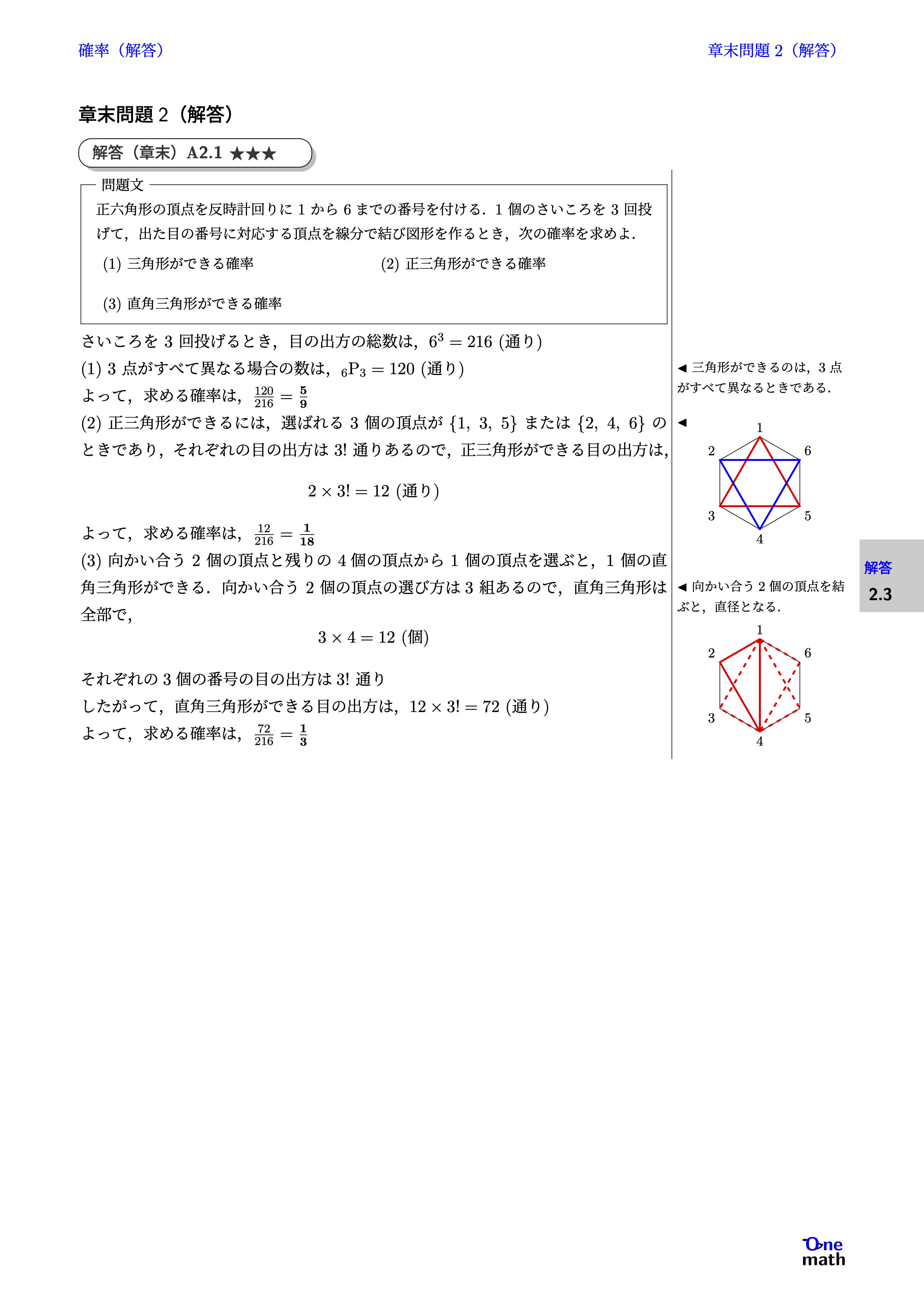 さいころを$3$回投げるとき,目の出方の総数は, $ 6^3 = 216 (\text{通り})$ (1)$3$点がすべて異なる場合の数は, $ {}_6\mathrm{P}_3 = 120 (\text{通り}) $ よって,求める確率は, $\frac{120}{216} = \frac{5}{9}$ (2)正三角形ができるには,選ばれる$3$個の頂点が$\{1,3,5\}$または$\{2,4,6\}$のときであり,それぞれの目の出方は$3!$通りあるので,正三角形ができる目の出方は, $$2 \times 3! = 12 (\text{通り})$$ よって,求める確率は, $ \frac{12}{216} = \frac{1}{18}$ (3)向かい合う$2$個の頂点と残りの$4$個の頂点から$1$個の頂点を選ぶと,$1$個の直角三角形ができる.向かい合う$2$個の頂点の選び方は$3$組あるので,直角三角形は全部で, $$ 3 \times 4 = 12 (\text{個}) $$ それぞれの3個の番号の目の出方は$3!$通り したがって,直角三角形ができる目の出方は, $12 \times 3! = 72 (\text{通り})$ よって,求める確率は, $ \frac{72}{216} = \frac{1}{3} $