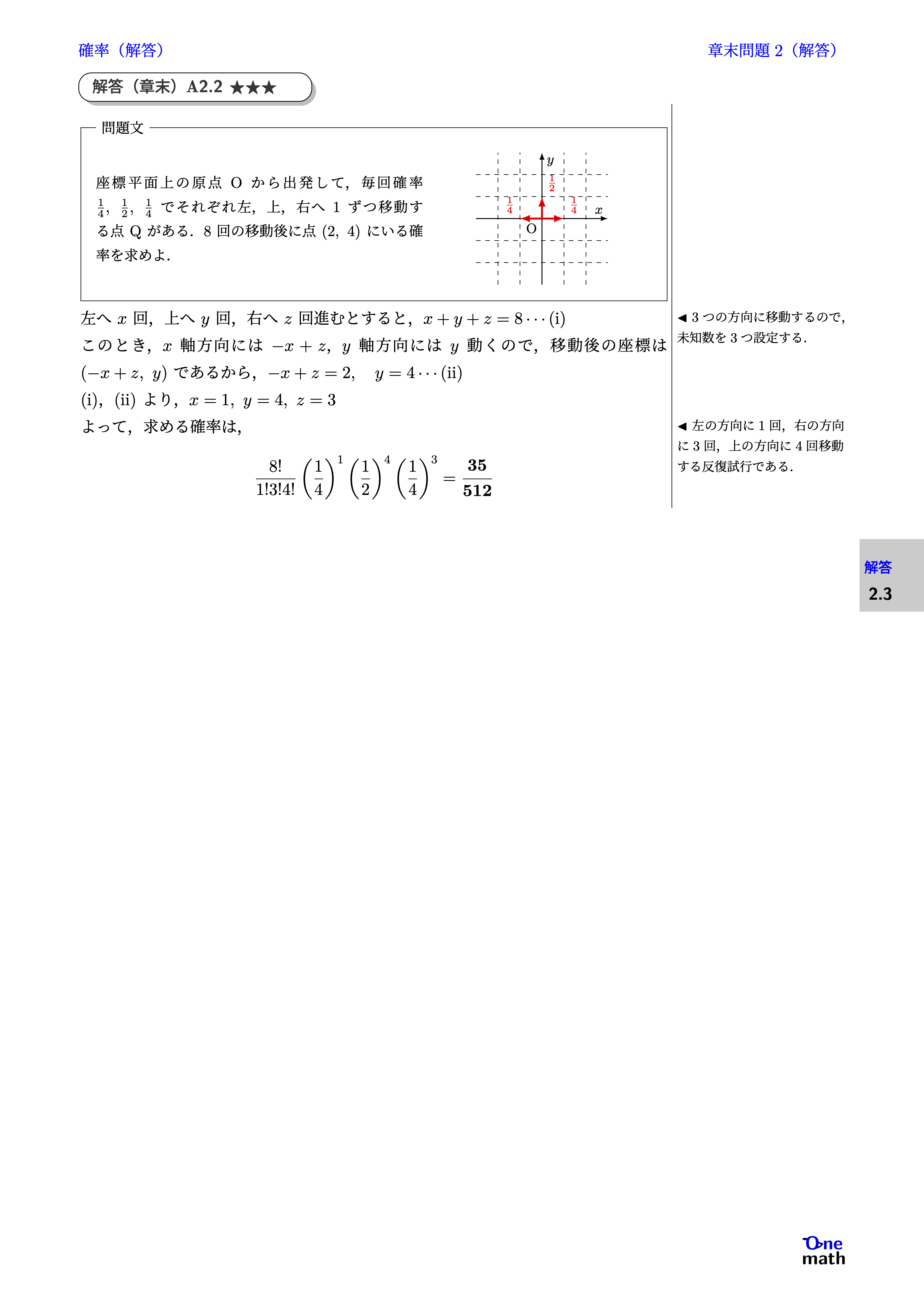左へ$x$回,上へ$y$回,右へ$z$回進むとすると, $ x+y+z=8\cdots(\mathrm{i}) $ このとき,$x$軸方向には$-x+z$,$y$軸方向には$y$動くので,移動後の座標は$(-x+z,y)$であるから, $ -x+z=2,y=4\cdots(\mathrm{ii}) $ (i),(ii)より,$x=1,y=4,z=3$ よって,求める確率は, $$ \frac{8!}{1!3!4!}\left(\frac{1}{4}\right)^1\left(\frac{1}{2}\right)^4\left(\frac{1}{4}\right)^3 = \frac{35}{512} $$