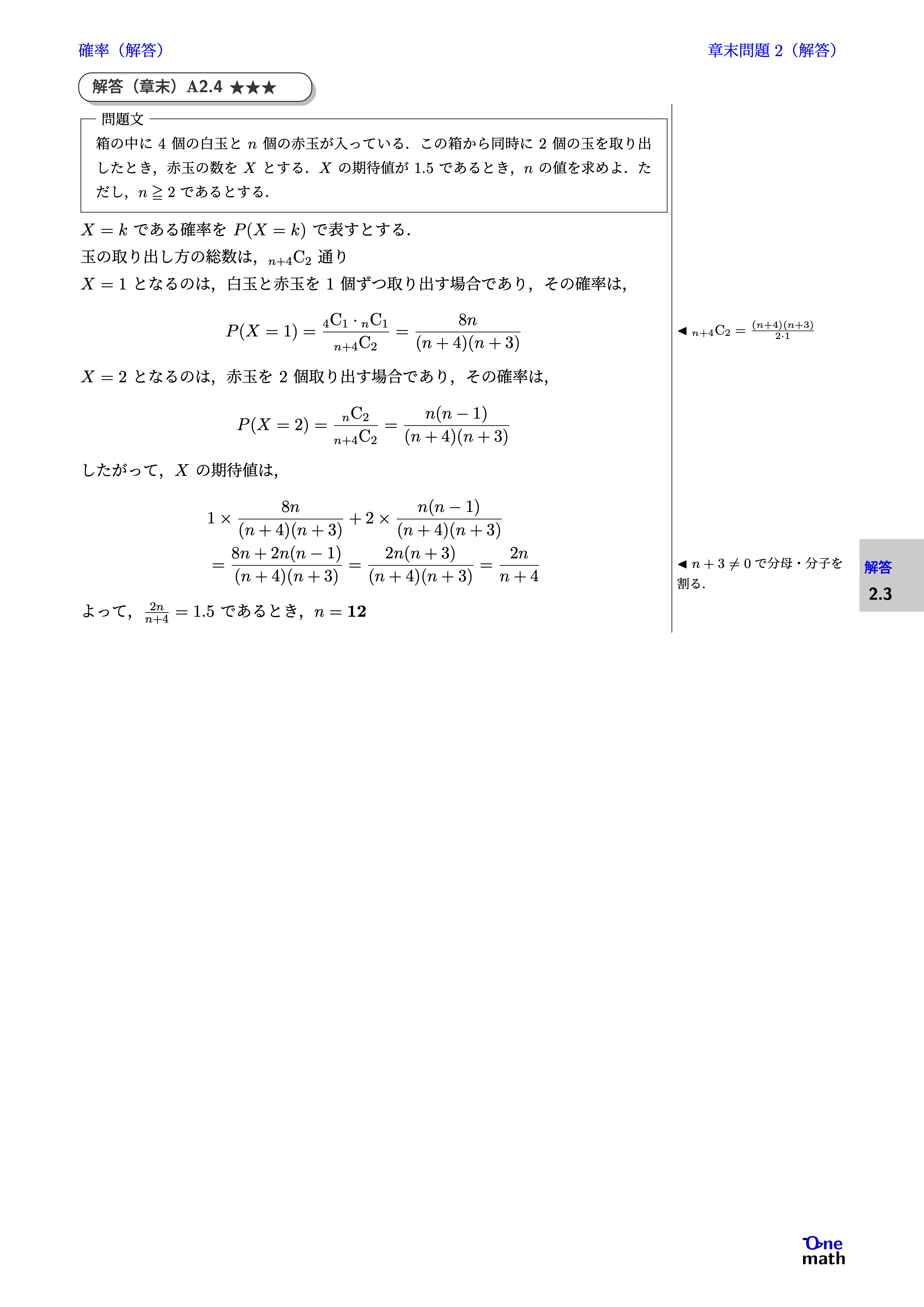 $X=k$である確率を$P(X=k)$で表すとする. 玉の取り出し方の総数は, ${}_{n+4}\mathrm{C}_2$ 通り $X=1$となるのは,白玉と赤玉を1個ずつ取り出す場合であり,その確率は, $$ P(X=1) = \frac{{}_4\mathrm{C}_1 \cdot {}_n\mathrm{C}_1}{{}_{n+4}\mathrm{C}_2} = \frac{8n}{(n+4)(n+3)} $$ $X=2$となるのは,赤玉を2個取り出す場合であり,その確率は, $$ P(X=2) = \frac{{}_n\mathrm{C}_2}{{}_{n+4}\mathrm{C}_2} = \frac{n(n-1)}{(n+4)(n+3)} $$ したがって,$X$の期待値は, $$ \begin{aligned} &1 \times \frac{8n}{(n+4)(n+3)} + 2 \times \frac{n(n-1)}{(n+4)(n+3)} \\ &= \frac{8n + 2n(n-1)}{(n+4)(n+3)} = \frac{2n(n+3)}{(n+4)(n+3)} = \frac{2n}{n+4} \end{aligned} $$ よって,$\frac{2n}{n+4} = 1 .5$であるとき, $n = 12$