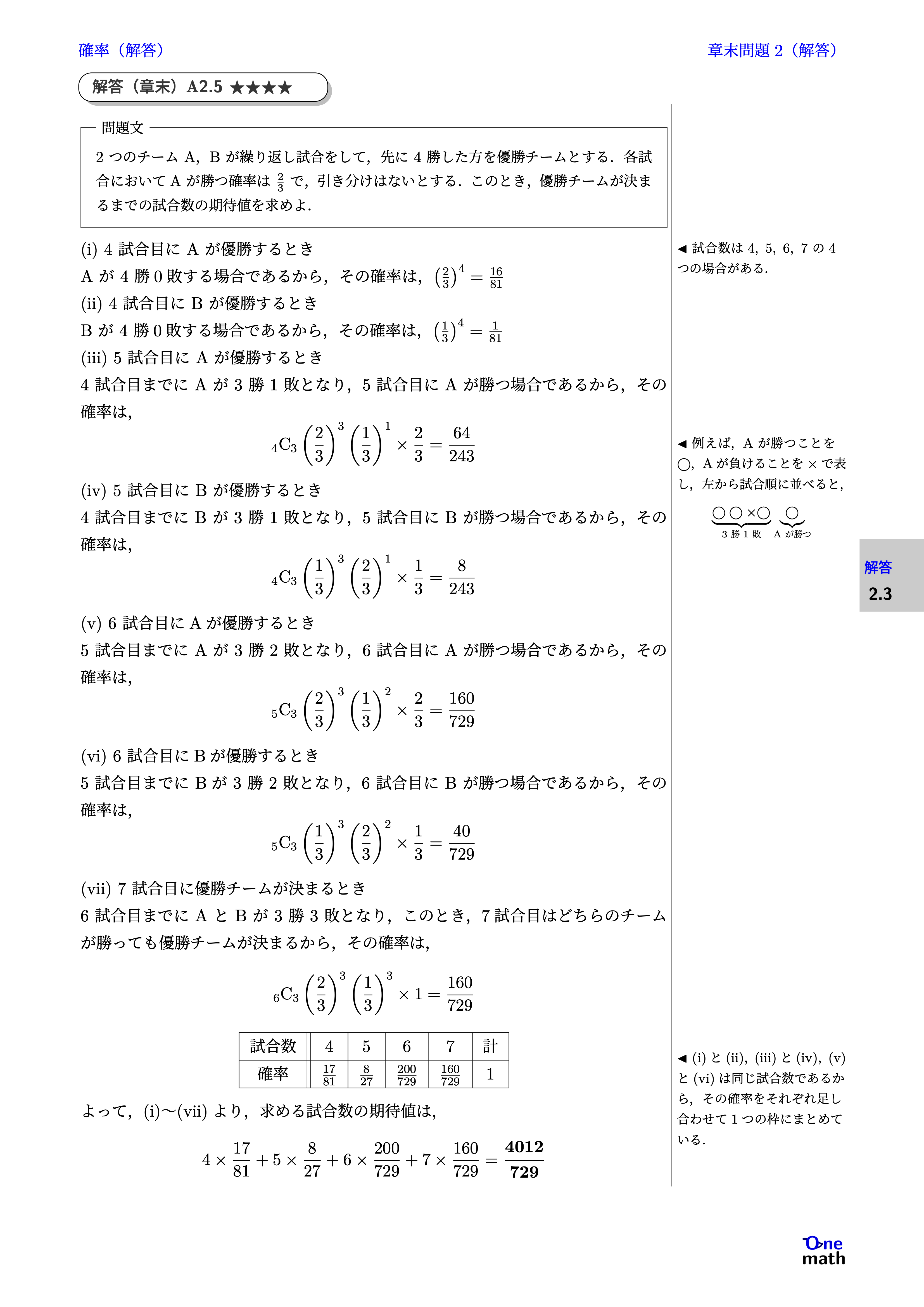 (i)4試合目にAが優勝するとき Aが4勝0敗する場合であるから,その確率は, $ \left(\frac{2}{3}\right)^4 = \frac{16}{81} $ (ii)4試合目にBが優勝するとき Bが4勝0敗する場合であるから,その確率は, $ \left(\frac{1}{3}\right)^4 = \frac{1}{81} $ (iii)5試合目にAが優勝するとき 4試合目までにAが3勝1敗となり,5試合目にAが勝つ場合であるから,その確率は, $$ { }_4 \mathrm{C}_3 \left(\frac{2}{3}\right)^3 \left(\frac{1}{3}\right)^1 \times \frac{2}{3} = \frac{64}{243} $$ (iv)5試合目にBが優勝するとき 4試合目までにBが3勝1敗となり,5試合目にBが勝つ場合であるから,その確率は, $$ { }_4 \mathrm{C}_3 \left(\frac{1}{3}\right)^3 \left(\frac{2}{3}\right)^1 \times \frac{1}{3} = \frac{8}{243} $$ (v)6試合目にAが優勝するとき 5試合目までにAが3勝2敗となり,6試合目にAが勝つ場合であるから,その確率は, $$ { }_5 \mathrm{C}_3 \left(\frac{2}{3}\right)^3 \left(\frac{1}{3}\right)^2 \times \frac{2}{3} = \frac{160}{729} $$ (vi)6試合目にBが優勝するとき 5試合目までにBが3勝2敗となり,6試合目にBが勝つ場合であるから,その確率は, $$ { }_5 \mathrm{C}_3 \left(\frac{1}{3}\right)^3 \left(\frac{2}{3}\right)^2 \times \frac{1}{3} = \frac{40}{729} $$ (vii)7試合目に優勝チームが決まるとき 6試合目までにAとBが3勝3敗となり,このとき,7試合目はどちらのチームが勝っても優勝チームが決まるから,その確率は, $$ { }_6 \mathrm{C}_3 \left(\frac{2}{3}\right)^3 \left(\frac{1}{3}\right)^3 \times 1 = \frac{160}{729} $$ \begin{tabular}{|c||c|c|c|c|c|} \hline 試合数&4&5&6&7&計\\ \hline 確率&$\frac{17}{81}$&$\frac{8}{27}$&$\frac{200}{729}$&$\frac{160}{729}$&1\\ \hline \end{tabular} よって,(i)〜(vii)より,求める試合数の期待値は, $$ 4 \times \frac{17}{81} + 5 \times \frac{8}{27} + 6 \times \frac{200}{729} + 7 \times \frac{160}{729} = \frac{4012}{729} $$