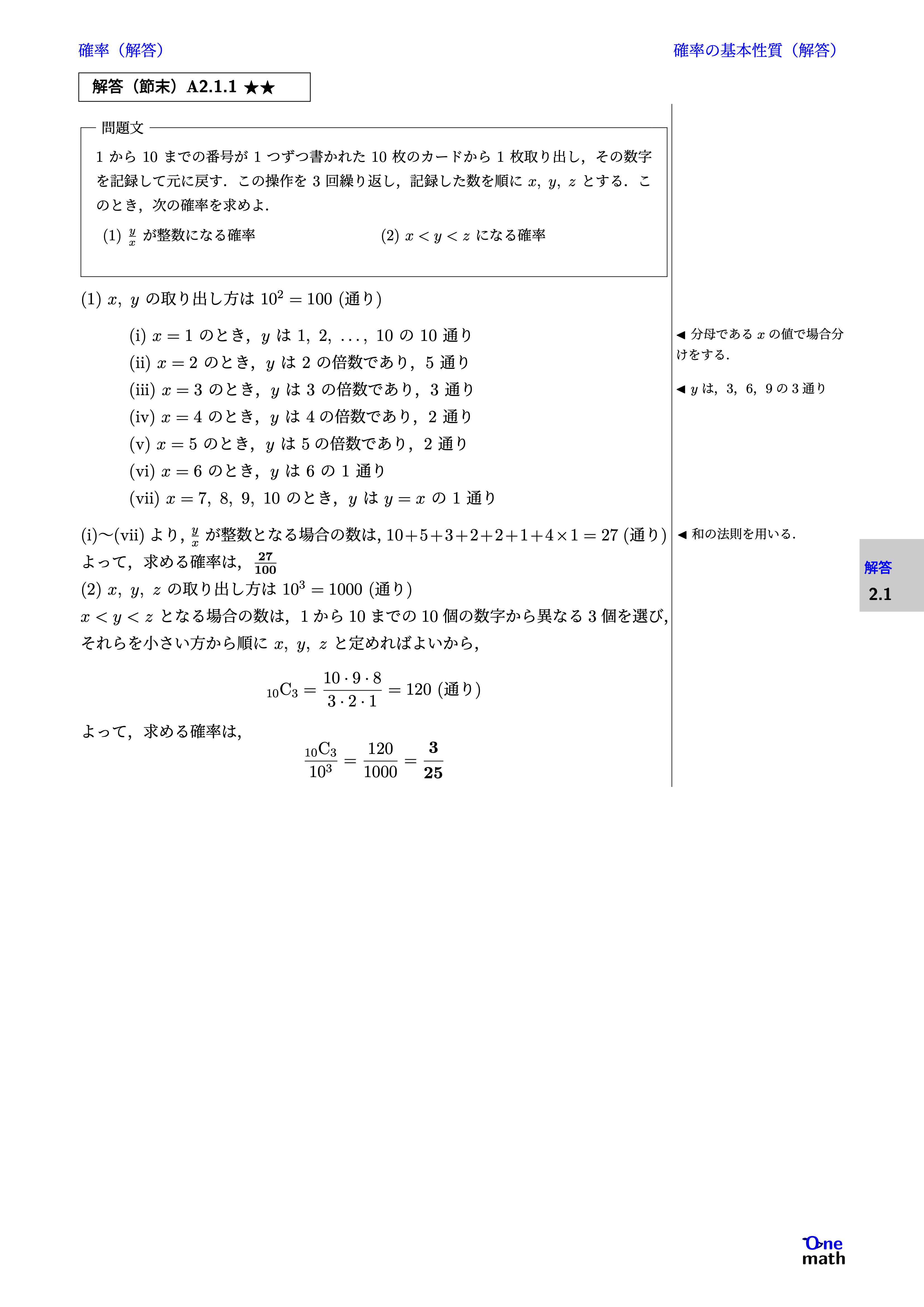 (1)$x,y$の取り出し方は$10^2 = 100 (\text{通り})$ (i)$x=1$のとき,$y$は$1,2,\ldots,10$の$10$通り (ii)$x=2$のとき,$y$は2の倍数であり,$5$通り (iii)$x=3$のとき,$y$は3の倍数であり,$3$通り (iv)$x=4$のとき,$y$は4の倍数であり,$2$通り (v)$x=5$のとき,$y$は5の倍数であり,$2$通り (vi)$x=6$のとき,$y$は6の$1$通り (vii)$x=7,8,9,10$のとき,$y$は$y=x$の$1$通り (i)〜(vii)より,$\frac{y}{x}$が整数となる場合の数は, $ 10 + 5 + 3 + 2 + 2 + 1 + 4 \times 1 = 27 (\text{通り})$ よって,求める確率は, $ \frac{27}{100}$ (2)$x,y,z$の取り出し方は$10^3 = 1000 (\text{通り})$ $x<y<z$となる場合の数は,1から10までの10個の数字から異なる3個を選び,それらを小さい方から順に$x,y,z$と定めればよいから, $$ {}_{10}\mathrm{C}_3 = \frac{10 \cdot 9 \cdot 8}{3 \cdot 2 \cdot 1} = 120 (\text{通り})$$ よって,求める確率は, $$ \frac{{}_{10}\mathrm{C}_3}{10^3} = \frac{120}{1000} = \frac{3}{25}$$