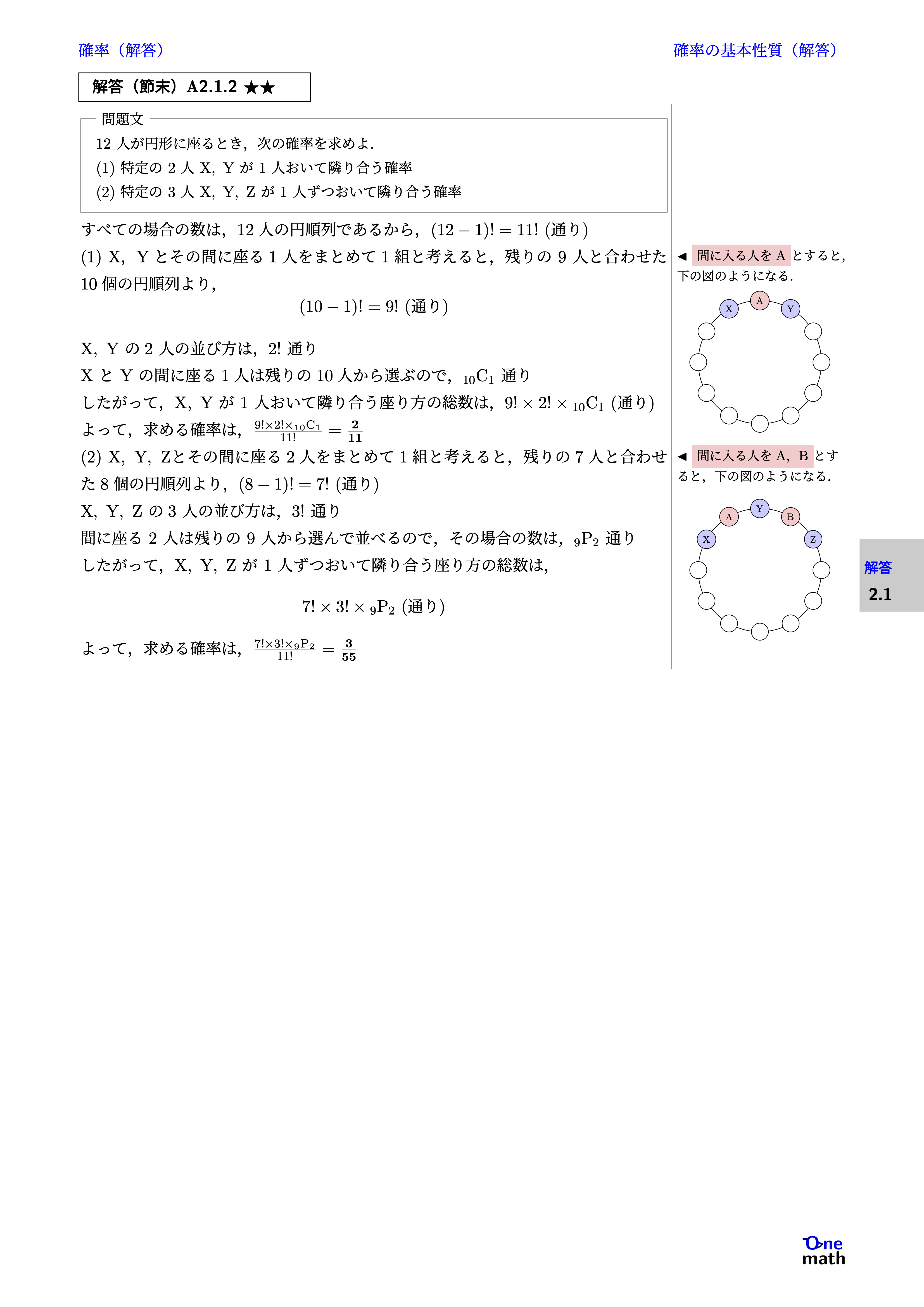 すべての場合の数は,12人の円順列であるから, $ (12-1)! = 11! (\text{通り})$ (1)X,Yとその間に座る1人をまとめて1組と考えると,残りの9人と合わせた10個の円順列より, $$ (10-1)! = 9! (\text{通り}) $$ $\mathrm{X},\mathrm{Y}$の2人の並び方は,$2!$通り $\mathrm{X}$と$\mathrm{Y}$の間に座る1人は残りの10人から選ぶので,${}_{10}\mathrm{C}_1$通り したがって,$\mathrm{X},\mathrm{Y}$が1人おいて隣り合う座り方の総数は, $ 9! \times 2! \times {}_{10}\mathrm{C}_1 (\text{通り})$ よって,求める確率は, $ \frac{9! \times 2! \times {}_{10}\mathrm{C}_1}{11!} = \frac{2}{11}$ (2)$\mathrm{X},\mathrm{Y},\mathrm{Z}$とその間に座る2人をまとめて1組と考えると,残りの7人と合わせた8個の円順列より, $ (8-1)! = 7! (\text{通り})$ $\mathrm{X},\mathrm{Y},\mathrm{Z}$の3人の並び方は,$3!$通り 間に座る2人は残りの9人から選んで並べるので,その場合の数は,${}_9\mathrm{P}_2$通り したがって,$\mathrm{X},\mathrm{Y},\mathrm{Z}$が1人ずつおいて隣り合う座り方の総数は, $$ 7! \times 3! \times {}_9\mathrm{P}_2 (\text{通り}) $$ よって,求める確率は, $ \frac{7! \times 3! \times {}_9\mathrm{P}_2}{11!} = \frac{3}{55}$