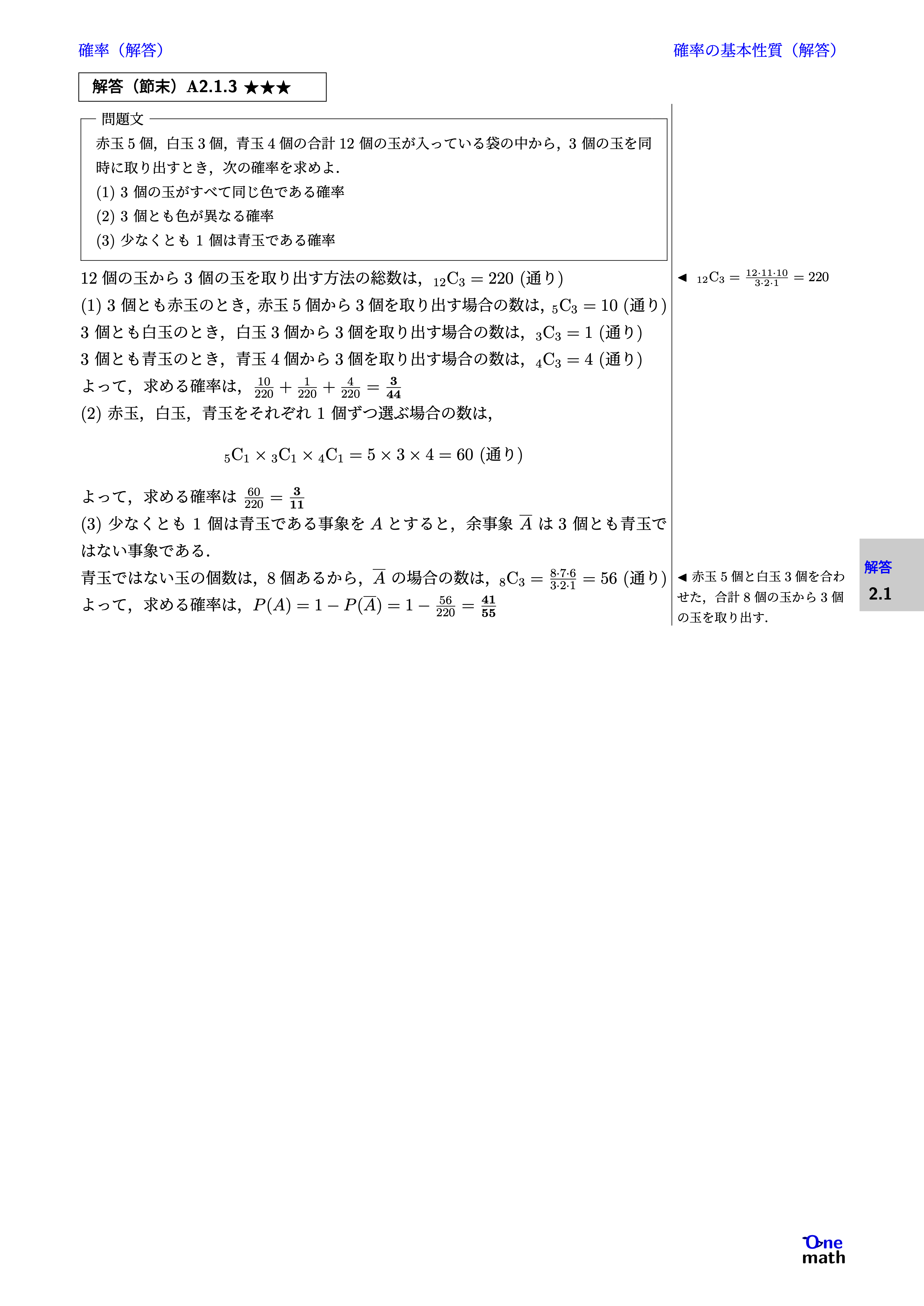 12個の玉から3個の玉を取り出す方法の総数は, $ {}_{12}\mathrm{C}_3 = 220 (\text{通り}) $ (1)3個とも赤玉のとき,赤玉5個から3個を取り出す場合の数は,${}_5\mathrm{C}_3=10 (\text{通り})$ 3個とも白玉のとき,白玉3個から3個を取り出す場合の数は,${}_3\mathrm{C}_3=1 (\text{通り})$ 3個とも青玉のとき,青玉4個から3個を取り出す場合の数は,${}_4\mathrm{C}_3=4 (\text{通り})$ よって,求める確率は, $ \frac{10}{220}+\frac{1}{220}+\frac{4}{220} = \frac{3}{44}$ (2)赤玉,白玉,青玉をそれぞれ1個ずつ選ぶ場合の数は, $$ {}_5\mathrm{C}_1 \times {}_3\mathrm{C}_1 \times {}_4\mathrm{C}_1 = 5 \times 3 \times 4 = 60 (\text{通り}) $$ よって,求める確率は $ \frac{60}{220} = \frac{3}{11}$ (3)少なくとも1個は青玉である事象を$A$とすると,余事象$\overline{A}$は3個とも青玉ではない事象である. 青玉ではない玉の個数は,8個あるから,$\overline{A}$の場合の数は, $ {}_8\mathrm{C}_3 = \frac{8 \cdot 7 \cdot 6}{3 \cdot 2 \cdot 1} = 56 (\text{通り})$ よって,求める確率は, $ P(A) = 1 - P(\overline{A}) = 1 - \frac{56}{220} = \frac{41}{55}$