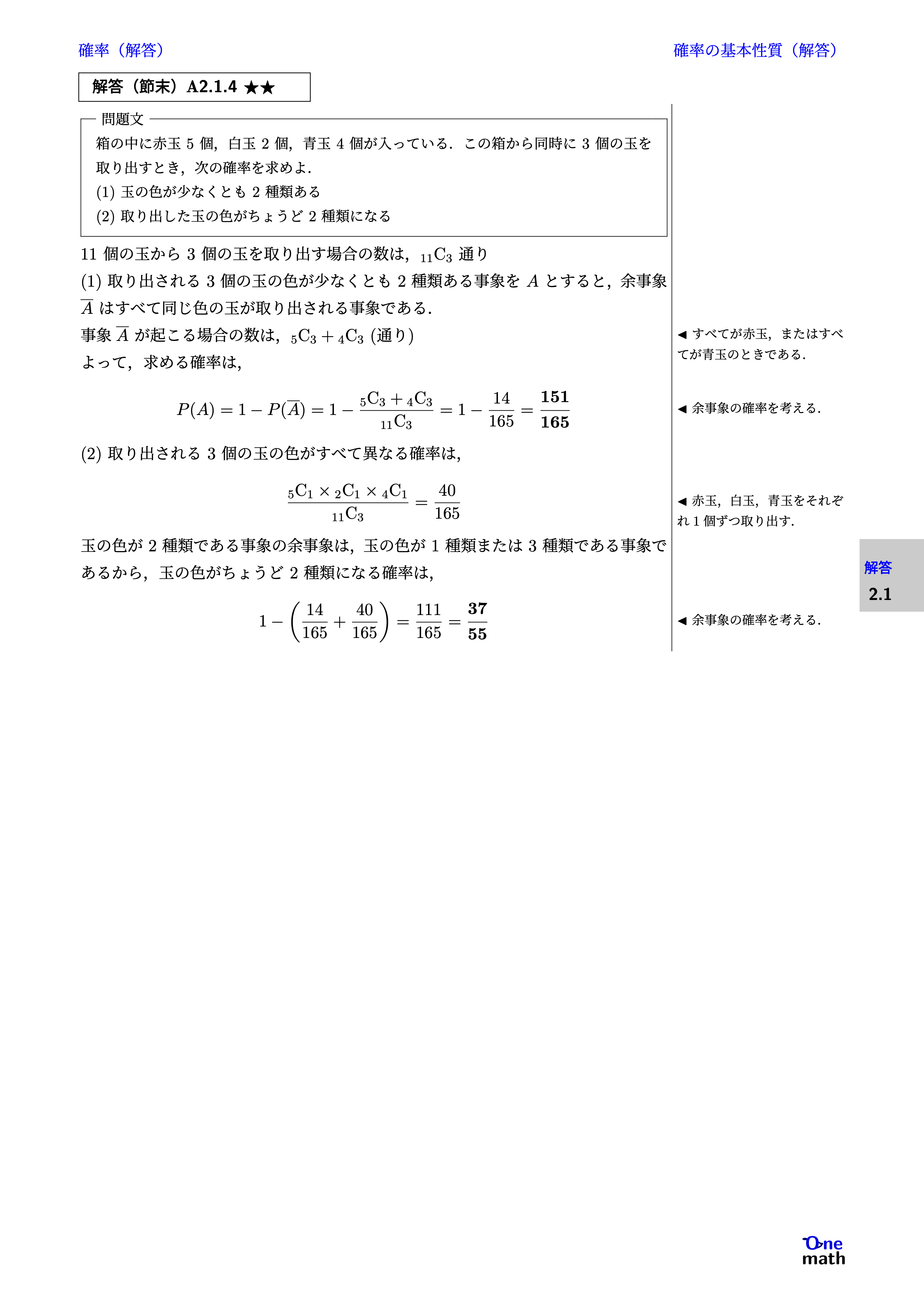 11個の玉から3個の玉を取り出す場合の数は,${ }_{11} \mathrm{C}_3$通り (1)取り出される3個の玉の色が少なくとも2種類ある事象を$A$とすると,余事象$\overline{A}$はすべて同じ色の玉が取り出される事象である. 事象$\overline{A}$が起こる場合の数は, $ { }_5 \mathrm{C}_3+{ }_4 \mathrm{C}_3 (\text{通り}) $ よって,求める確率は, $$ P(A) =1-P(\overline{A}) =1-\frac{{ }_5 \mathrm{C}_3+{ }_4 \mathrm{C}_3}{{ }_{11} \mathrm{C}_3}=1-\frac{14}{165}=\frac{151}{165} $$ (2)取り出される3個の玉の色がすべて異なる確率は, $$ \frac{{ }_5 \mathrm{C}_1 \times{ }_2 \mathrm{C}_1 \times{ }_4 \mathrm{C}_1}{{ }_{11} \mathrm{C}_3}=\frac{40}{165} $$ 玉の色が2種類である事象の余事象は,玉の色が1種類または3種類である事象であるから,玉の色がちょうど2種類になる確率は, $$ 1-\left(\frac{14}{165}+\frac{40}{165}\right)=\frac{111}{165}=\frac{37}{55} $$
