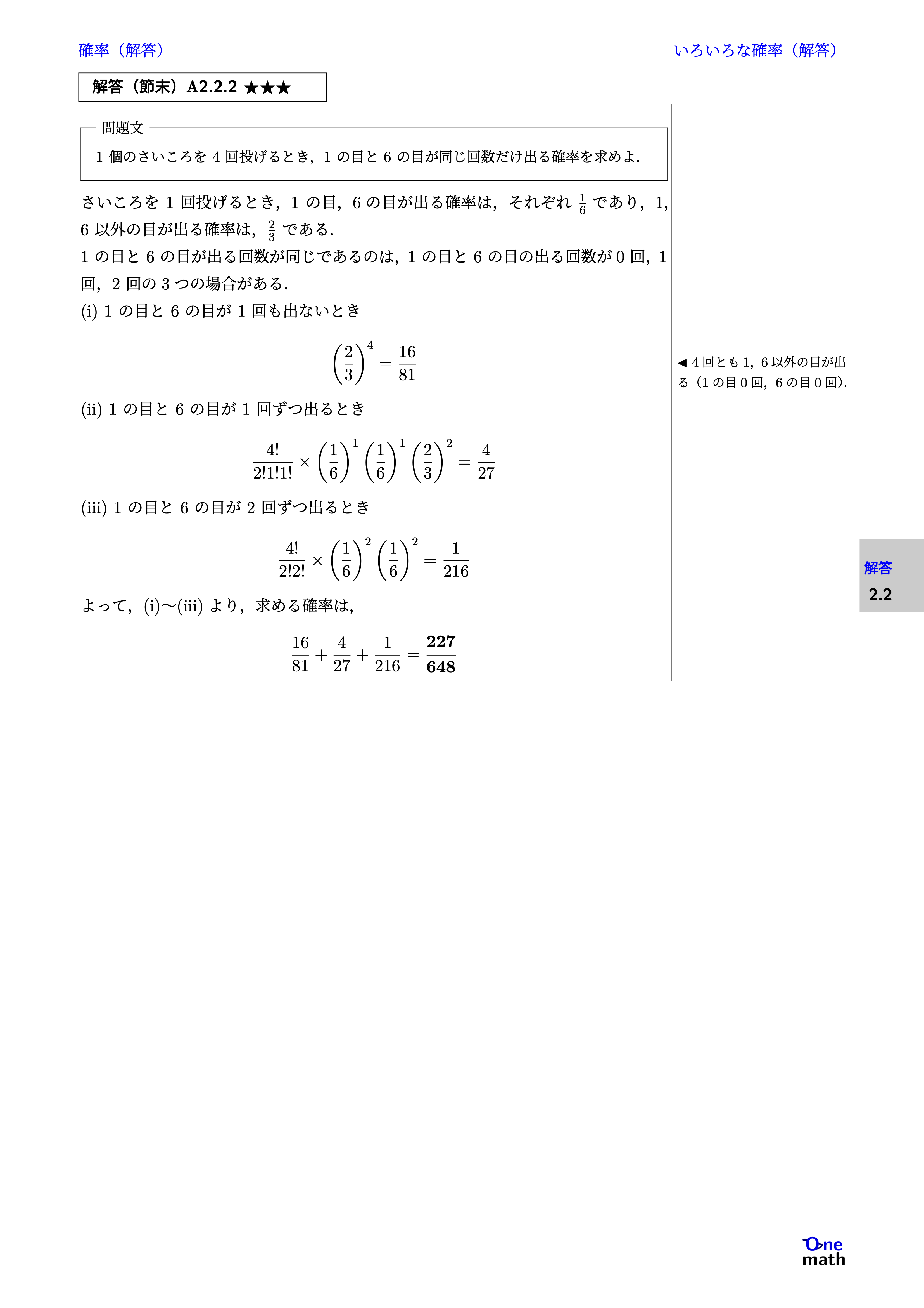 さいころを1回投げるとき,1の目,6の目が出る確率は,それぞれ$\frac{1}{6}$であり,1,6以外の目が出る確率は,$\frac{2}{3}$である. 1の目と6の目が出る回数が同じであるのは,1の目と6の目の出る回数が0回,1回,2回の3つの場合がある. (i)1の目と6の目が1回も出ないとき $$ \left(\frac{2}{3}\right)^4 = \frac{16}{81} $$ (ii)1の目と6の目が1回ずつ出るとき $$ \frac{4!}{2!1!1!} \times \left(\frac{1}{6}\right)^1\left(\frac{1}{6}\right)^1 \left(\frac{2}{3}\right)^2 = \frac{4}{27} $$ (iii)1の目と6の目が2回ずつ出るとき $$ \frac{4!}{2!2!} \times \left(\frac{1}{6}\right)^2 \left(\frac{1}{6}\right)^2 = \frac{1}{216} $$ よって,(i)〜(iii)より,求める確率は, $$ \frac{16}{81} + \frac{4}{27} + \frac{1}{216} = \frac{227}{648} $$