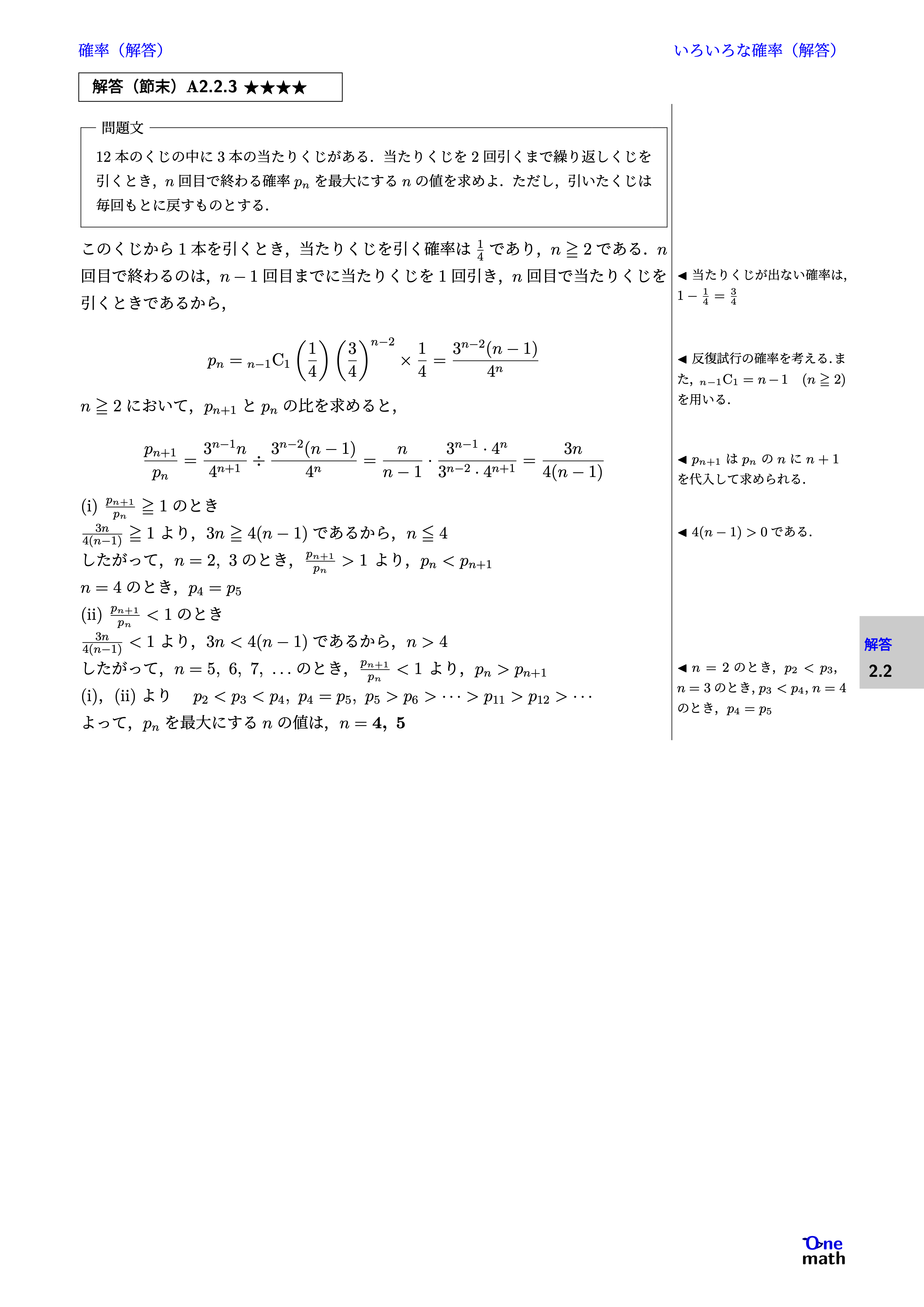 このくじから1本を引くとき,当たりくじを引く確率は$\frac{1}{4}$であり,$n \geqq 2$である. $n$回目で終わるのは,$n-1$回目までに当たりくじを1回引き,$n$回目で当たりくじを引くときであるから, $$ p_n={ }_{n-1} \mathrm{C}_1\left(\frac{1}{4}\right)\left(\frac{3}{4}\right)^{n-2} \times \frac{1}{4}=\frac{3^{n-2}(n-1)}{4^n} $$ $n\geqq 2$において,$p_{n+1}$と$p_n$の比を求めると, $$ \frac{p_{n+1}}{p_n} =\frac{3^{n-1} n}{4^{n+1}} \div \frac{3^{n-2}(n-1)}{4^n} =\frac{n}{n-1} \cdot \frac{3^{n-1} \cdot 4^n}{3^{n-2} \cdot 4^{n+1}}=\frac{3 n}{4(n-1)} $$ (i)$\frac{p_{n+1}}{p_n} \geqq 1$のとき $\frac{3 n}{4(n-1)} \geqq 1$より,$3 n \geqq 4(n-1)$であるから,$n \leqq 4$ したがって,$n=2,3$のとき,$\frac{p_{n+1}}{p_n}>1$より,$p_n<p_{n+1}$ $n=4$のとき,$p_4=p_5$ (ii)$\frac{p_{n+1}}{p_n}<1$のとき $\frac{3 n}{4(n-1)} < 1$より,$3 n < 4(n-1)$であるから,$n > 4$ したがって,$n=5,6,7,\ldots$のとき,$\frac{p_{n+1}}{p_n}<1$より,$p_n>p_{n+1}$ (i),(ii)より$ p_2<p_3<p_4,p_4=p_5,p_5>p_6>\cdots >p_{11}>p_{12}>\cdots$ よって,$p_n$を最大にする$n$の値は,$n=4,5$