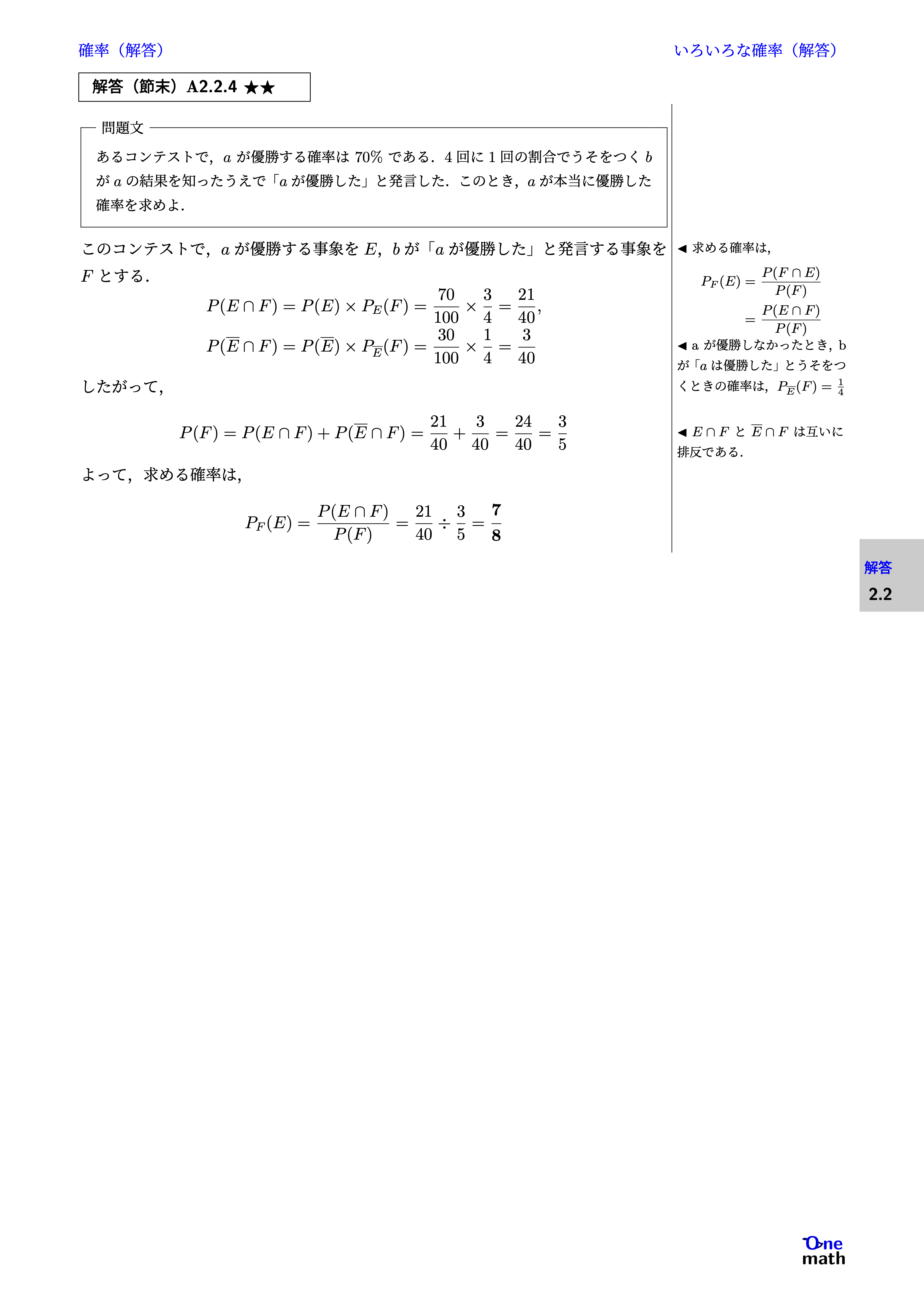 このコンテストで,$a$が優勝する事象を$E$,$b$が「$a$が優勝した」と発言する事象を$F$とする. $$ \begin{aligned} & P(E \cap F)=P(E) \times P_E(F)=\frac{70}{100} \times \frac{3}{4}=\frac{21}{40},\\ & P(\overline{E} \cap F)=P(\overline{E}) \times P_{\overline{E}}(F)=\frac{30}{100} \times \frac{1}{4}=\frac{3}{40} \end{aligned} $$ したがって, $$ P(F)=P(E \cap F)+P(\overline{E} \cap F)=\frac{21}{40}+\frac{3}{40}=\frac{24}{40}=\frac{3}{5} $$ よって,求める確率は, $$ P_F(E)=\frac{P(E \cap F)}{P(F)}={\frac{21}{40}} \div {\frac{3}{5}}=\frac{7}{8} $$