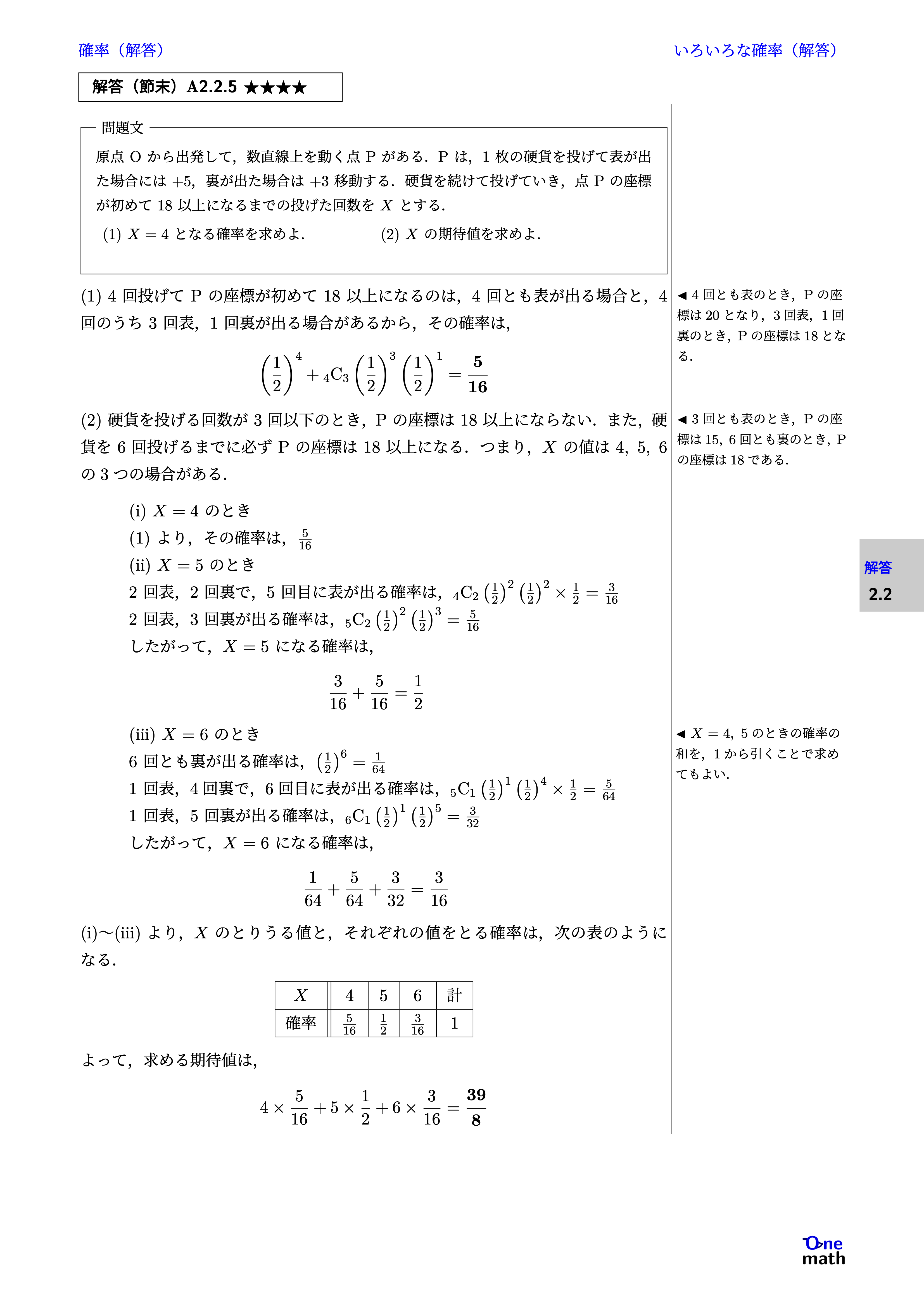 (1)4回投げて$\mathrm{P}$の座標が初めて$18$以上になるのは,4回とも表が出る場合と,4回のうち3回表,1回裏が出る場合があるから,その確率は, $$ \left(\frac{1}{2}\right)^4 + { }_4 \mathrm{C}_3\left(\frac{1}{2}\right)^3\left(\frac{1}{2}\right)^1 = \frac{5}{16} $$ (2)硬貨を投げる回数が3回以下のとき,$\mathrm{P}$の座標は$18$以上にならない.また,硬貨を6回投げるまでに必ず$\mathrm{P}$の座標は$18$以上になる.つまり,$X$の値は$4,5,6$の3つの場合がある. (i)$X=4$のとき (1)より,その確率は,$\frac{5}{16}$ (ii)$X=5$のとき 2回表,2回裏で,5回目に表が出る確率は, $ { }_4 \mathrm{C}_2 \left(\frac{1}{2}\right)^2 \left(\frac{1}{2}\right)^2 \times \frac{1}{2} = \frac{3}{16} $ 2回表,3回裏が出る確率は, $ { }_5 \mathrm{C}_2 \left(\frac{1}{2}\right)^2 \left(\frac{1}{2}\right)^3 = \frac{5}{16} $ したがって,$X=5$になる確率は, $$ \frac{3}{16} + \frac{5}{16}= \frac{1}{2} $$ (iii)$X=6$のとき 6回とも裏が出る確率は, $ \left(\frac{1}{2}\right)^6 = \frac{1}{64} $ 1回表,4回裏で,6回目に表が出る確率は, $ { }_5 \mathrm{C}_1 \left(\frac{1}{2}\right)^1 \left(\frac{1}{2}\right)^4\times\frac{1}{2} = \frac{5}{64} $ 1回表,5回裏が出る確率は, $ { }_6 \mathrm{C}_1 \left(\frac{1}{2}\right)^1 \left(\frac{1}{2}\right)^5 = \frac{3}{32} $ したがって,$X=6$になる確率は, $$ \frac{1}{64} +\frac{5}{64}+ \frac{3}{32}= \frac{3}{16} $$ (i)〜(iii)より,$X$のとりうる値と,それぞれの値をとる確率は,次の表のようになる. \begin{tabular}{|c||c|c|c|c|} \hline $X$&4&5&6&計\\ \hline 確率&$\frac{5}{16}$&$\frac{1}{2}$&$\frac{3}{16}$&1\\ \hline \end{tabular} よって,求める期待値は, $$ 4 \times \frac{5}{16} + 5 \times \frac{1}{2}+6\times\frac{3}{16}= \frac{39}{8} $$