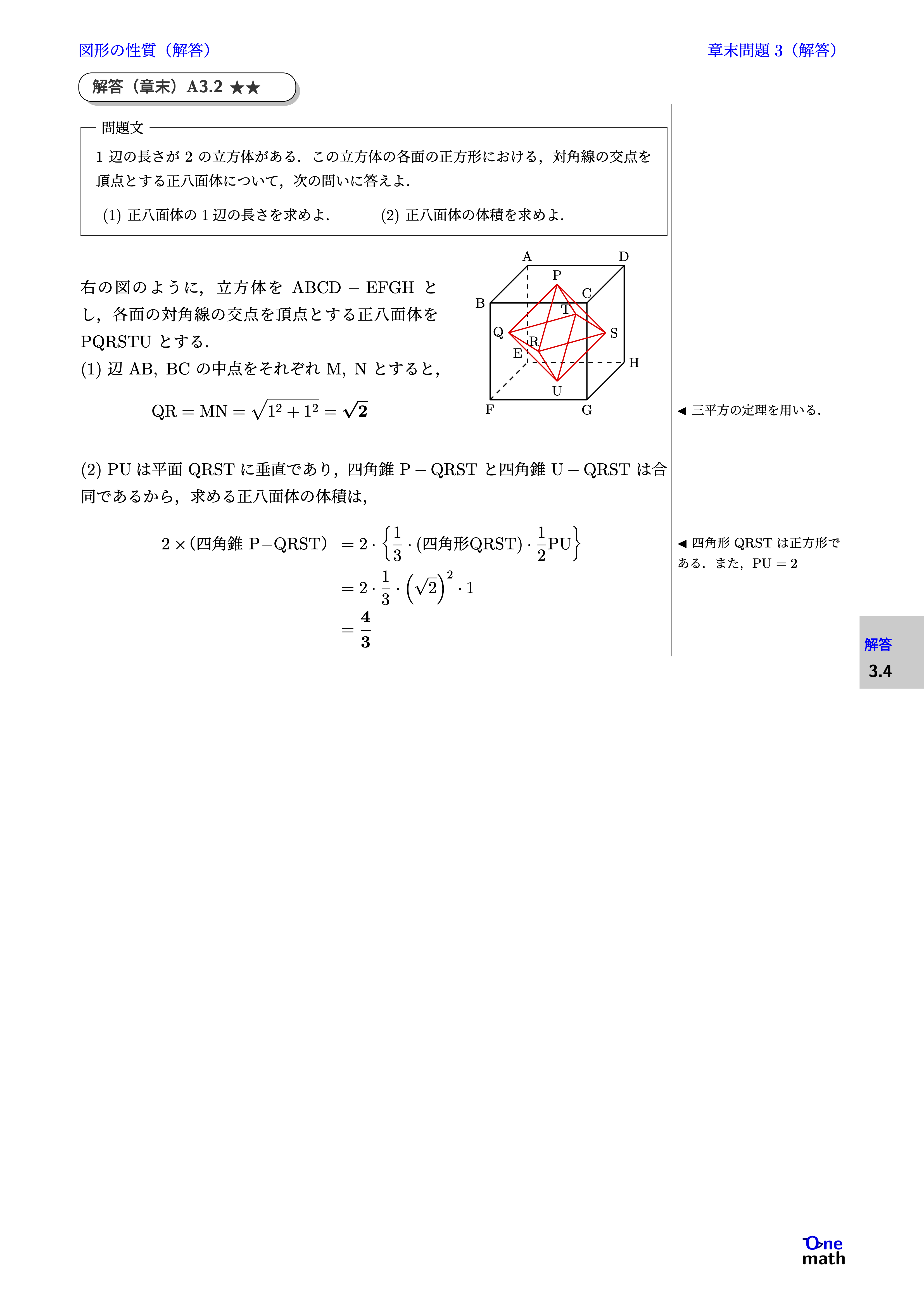 右の図のように,立方体を$\mathrm{ABCD}-\mathrm{EFGH}$とし,各面の対角線の交点を頂点とする正八面体をPQRSTUとする. (1)辺$\mathrm{AB},\mathrm{BC}$の中点をそれぞれ$\mathrm{M},\mathrm{N}$とすると, $$ \mathrm{QR}=\mathrm{MN} =\sqrt{1^2+1^2} =\sqrt{2} $$ (2)PUは平面QRSTに垂直であり,四角錐$\mathrm{P}-\mathrm{QRST}$と四角錐$\mathrm{U}-\mathrm{QRST}$は合同であるから,求める正八面体の体積は, $$ \begin{aligned} 2 \times (\text{四角錐 P$-$QRST})& =2 \cdot\left\{\frac{1}{3} \cdot(\text {四角形 } \mathrm{QRST}) \cdot \frac{1}{2} \mathrm{PU}\right\} \\ & =2 \cdot \frac{1}{3} \cdot\left(\sqrt{2}\right)^2 \cdot 1 \\ & =\frac{4}{3} \end{aligned} $$