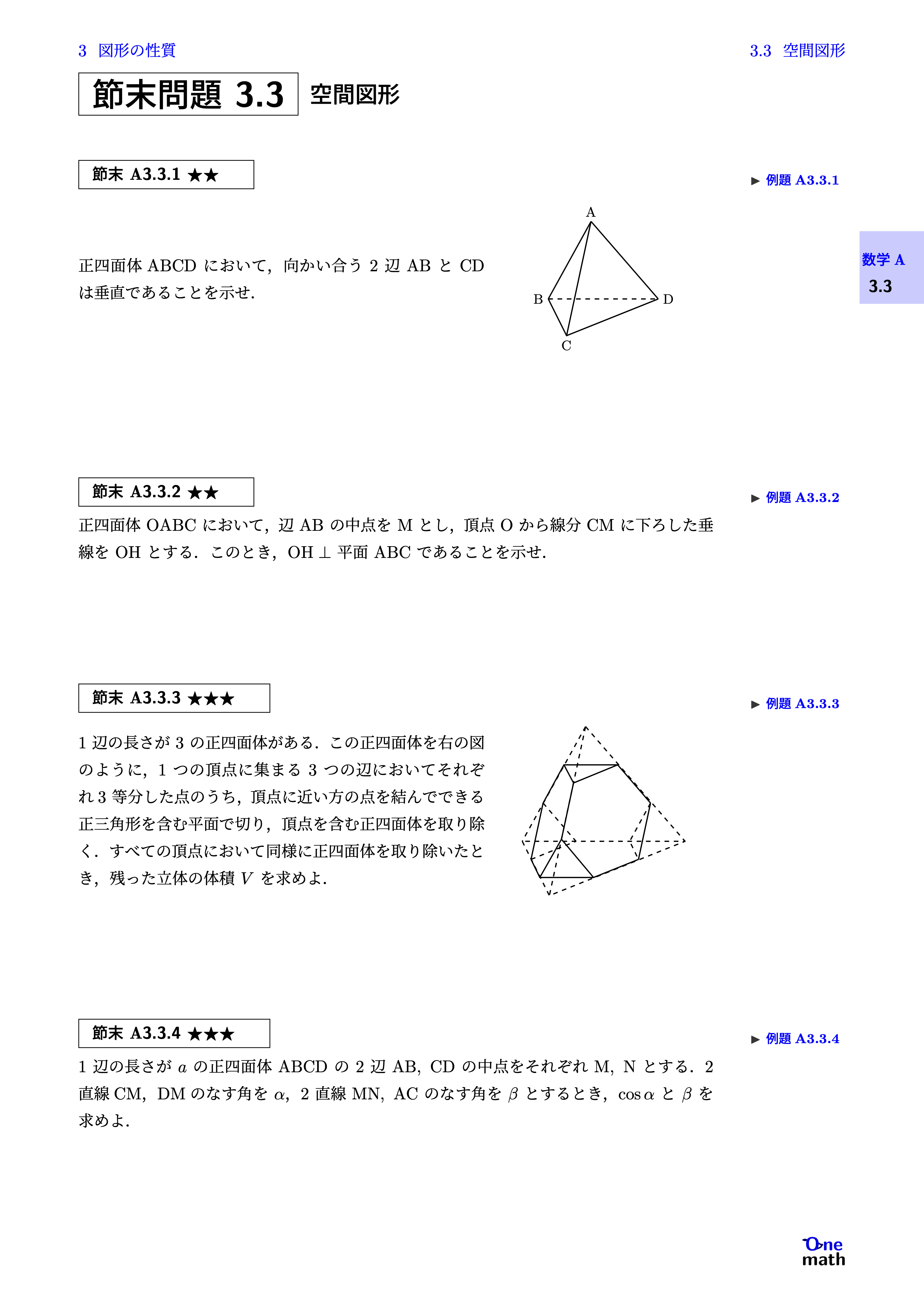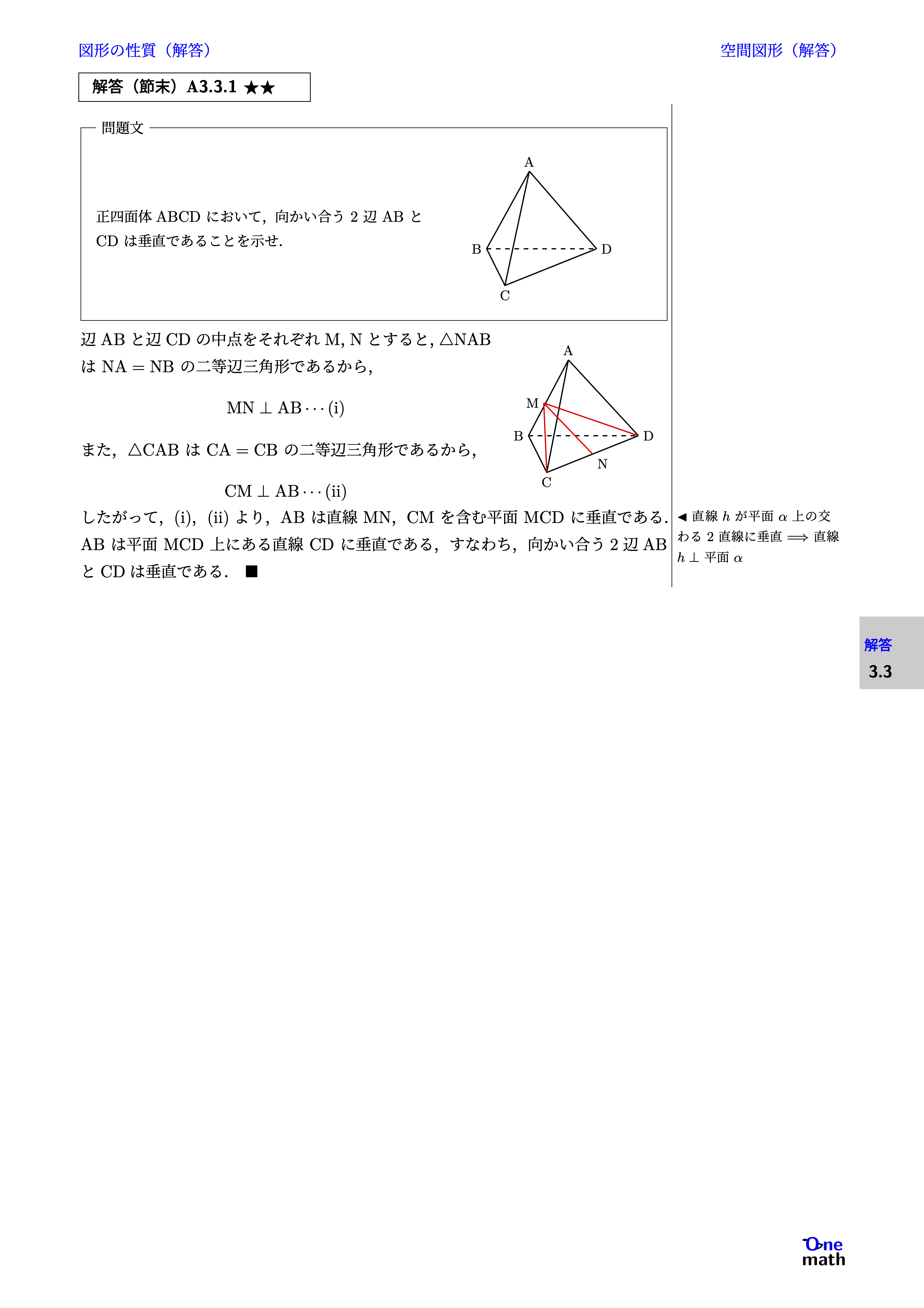 https://www.youtube.com/watch?v=AU91EtVZm34 問題の解答 検索用コード(LaTeX) % 例題A3.3.1:直線と平面の垂直 (One More)★★ 正四面体ABCDについて,次のことを示...