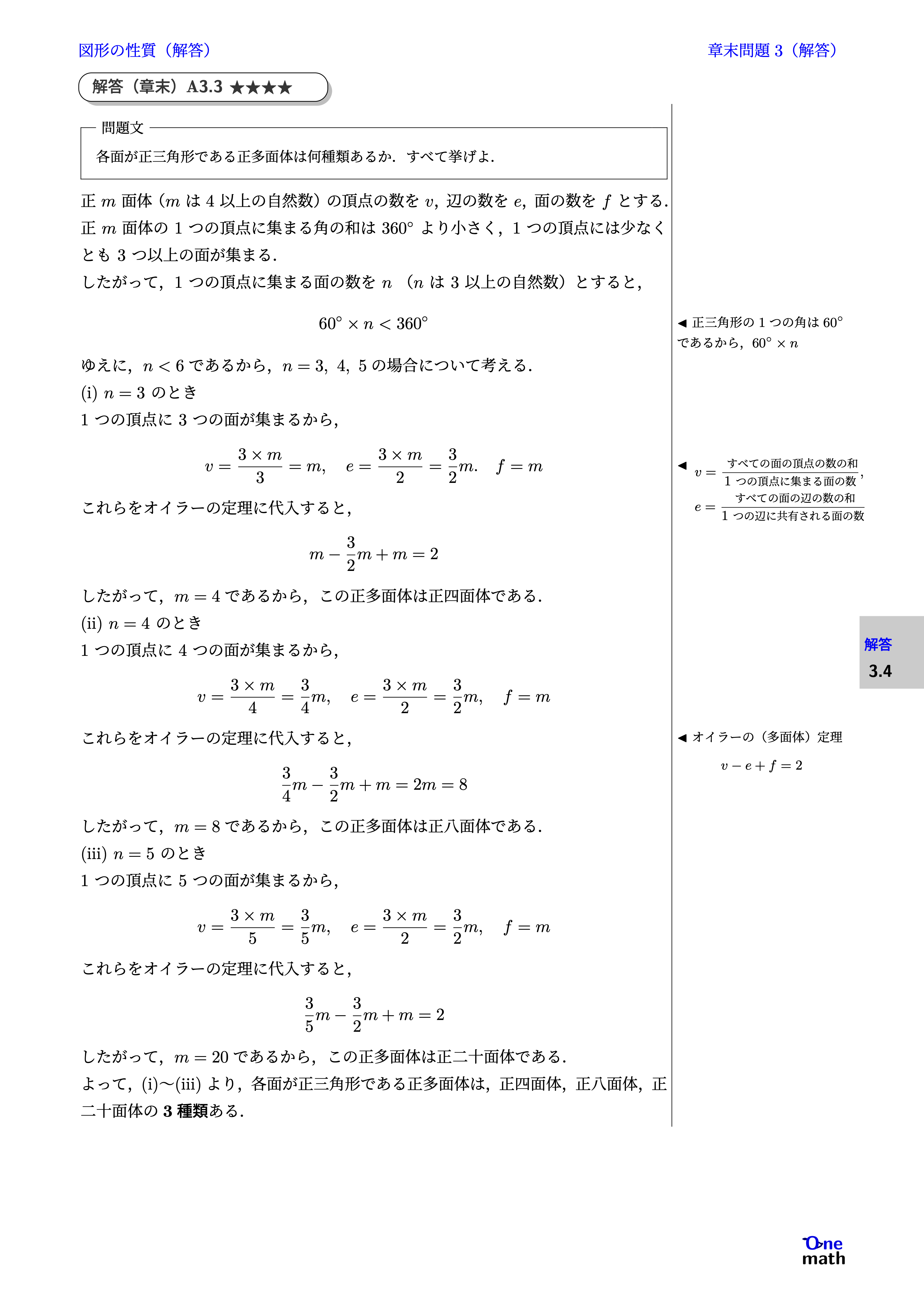 正$m$面体($m$は$4$以上の自然数)の頂点の数を$v$,辺の数を$e$,面の数を$f$とする. 正$m$面体の1つの頂点に集まる角の和は$360^\circ$より小さく,1つの頂点には少なくとも3つ以上の面が集まる. したがって,1つの頂点に集まる面の数を$n$($n$は3以上の自然数)とすると, $$ 60^\circ \times n < 360^\circ $$ ゆえに,$n<6$であるから,$n = 3,4,5$の場合について考える. (i)$n = 3$のとき 1つの頂点に3つの面が集まるから, $$ v = \frac{3 \times m}{3} = m,e = \frac{3 \times m}{2} = \frac{3}{2} m,f = m $$ これらをオイラーの定理に代入すると, $$ m - \frac{3}{2} m + m = 2 $$ したがって,$m=4$であるから,この正多面体は正四面体である. (ii)$n = 4$のとき 1つの頂点に4つの面が集まるから, $$ v = \frac{3 \times m}{4} = \frac{3}{4} m,e = \frac{3 \times m}{2} = \frac{3}{2} m,f = m $$ これらをオイラーの定理に代入すると, $$ \frac{3}{4} m - \frac{3}{2} m + m = 2 m = 8 $$ したがって,$m=8$であるから,この正多面体は正八面体である. (iii)$n = 5$のとき 1つの頂点に5つの面が集まるから, $$ v = \frac{3 \times m}{5} = \frac{3}{5} m,e = \frac{3 \times m}{2} = \frac{3}{2} m,f = m $$ これらをオイラーの定理に代入すると, $$ \frac{3}{5} m - \frac{3}{2} m + m = 2 $$ したがって,$m=20$であるから,この正多面体は正二十面体である. よって,(i)〜(iii)より,各面が正三角形である正多面体は, 正四面体,正八面体,正二十面体の3種類ある.