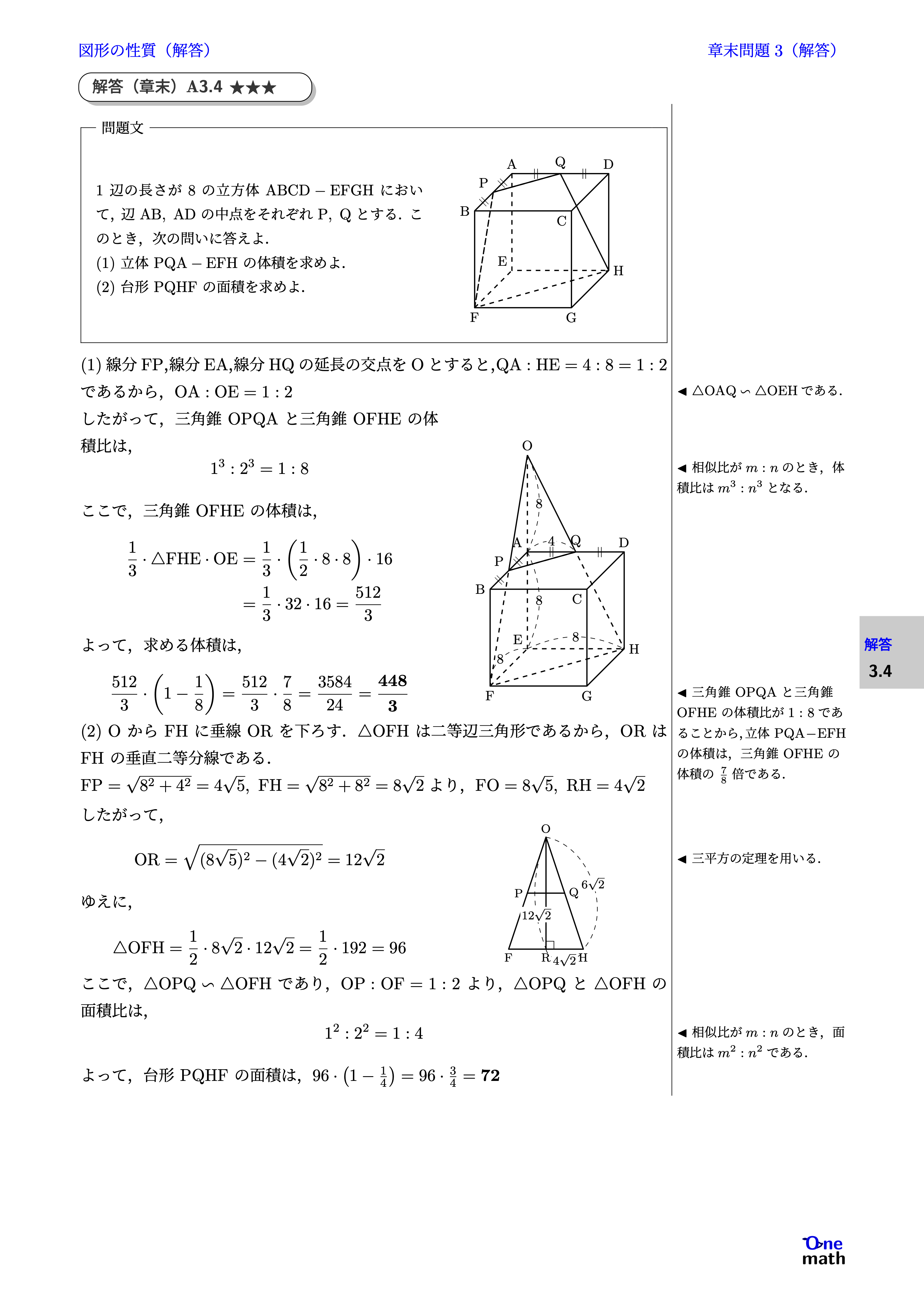 (1)線分$\mathrm{FP}$,線分$\mathrm{EA}$,線分$\mathrm{HQ}$の延長の交点をOとすると,$\mathrm{QA}:\mathrm{HE}=4:8=1:2$であるから, $\mathrm{OA}:\mathrm{OE}=1:2$ したがって,三角錐$\mathrm{OPQA}$と三角錐$\mathrm{OFHE}$の体積比は, $$ 1^3:2^3=1:8 $$ ここで,三角錐$\mathrm{OFHE}$の体積は, $$ \begin{aligned} \frac{1}{3} \cdot \triangle \mathrm{FHE} \cdot \mathrm{OE} & = \frac{1}{3} \cdot \left( \frac{1}{2} \cdot 8 \cdot 8 \right) \cdot 16 \\ & = \frac{1}{3} \cdot 32 \cdot 16 = \frac{512}{3} \end{aligned} $$ よって,求める体積は, $$ \frac{512}{3} \cdot \left( 1 - \frac{1}{8} \right) = \frac{512}{3} \cdot \frac{7}{8} = \frac{3584}{24} = \frac{448}{3} $$ (2)Oから$\mathrm{FH}$に垂線ORを下ろす.$\triangle \mathrm{OFH}$は二等辺三角形であるから,ORは$\mathrm{FH}$の垂直二等分線である. $\mathrm{FP} = \sqrt{8^2 + 4^2} = 4 \sqrt{5},\mathrm{FH} = \sqrt{8^2 + 8^2} = 8 \sqrt{2}$より,$\mathrm{FO} = 8 \sqrt{5},\mathrm{RH} = 4 \sqrt{2}$ したがって, $$ \mathrm{OR} = \sqrt{(8 \sqrt{5})^2 - (4 \sqrt{2})^2} = 12 \sqrt{2} $$ ゆえに, $$\triangle \mathrm{OFH} = \frac{1}{2} \cdot 8 \sqrt{2} \cdot 12 \sqrt{2} = \frac{1}{2} \cdot 192 = 96$$ ここで,$\triangle \mathrm{OPQ} \backsim \triangle \mathrm{OFH}$であり,$\mathrm{OP}:\mathrm{OF} = 1:2$より,$\triangle \mathrm{OPQ}$と$\triangle \mathrm{OFH}$の面積比は, $$ 1^2:2^2 = 1:4 $$ よって,台形$\mathrm{PQHF}$の面積は, $ 96 \cdot \left(1-\frac{1}{4} \right) = 96 \cdot \frac{3}{4} = 72$