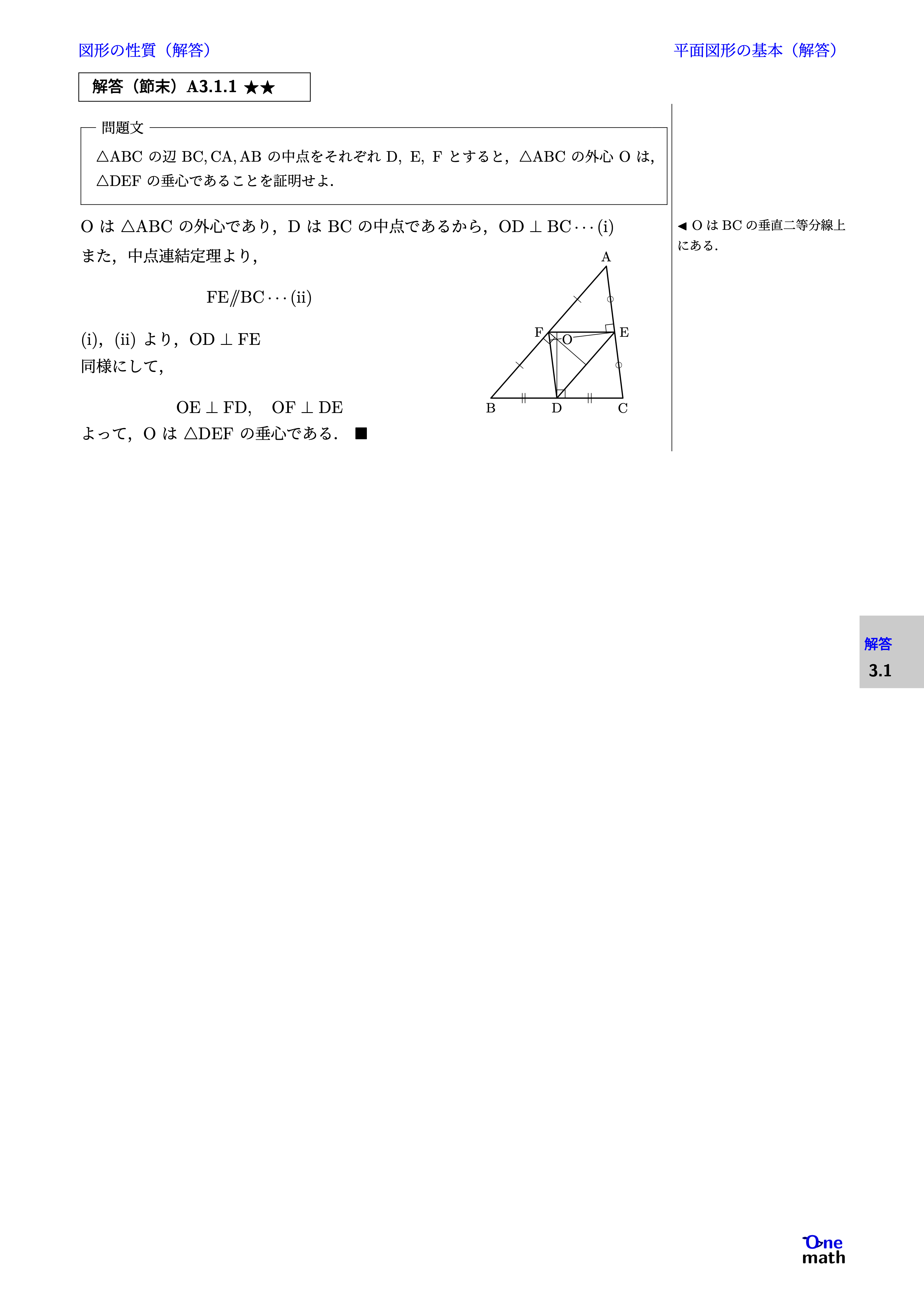 Oは$\triangle \mathrm{ABC}$の外心であり,DはBCの中点であるから, $\mathrm{OD} \perp \mathrm{BC}\cdots(\mathrm{i})$ また,中点連結定理より, $$ \mathrm{FE} \parallel \mathrm{BC}\cdots(\mathrm{ii}) $$ (i),(ii)より,$\mathrm{OD} \perp \mathrm{FE}$ 同様にして, $$ \mathrm{OE} \perp \mathrm{FD}, \mathrm{OF} \perp \mathrm{DE} $$ よって,Oは$\triangle \mathrm{DEF}$の垂心である.$ \blacksquare$