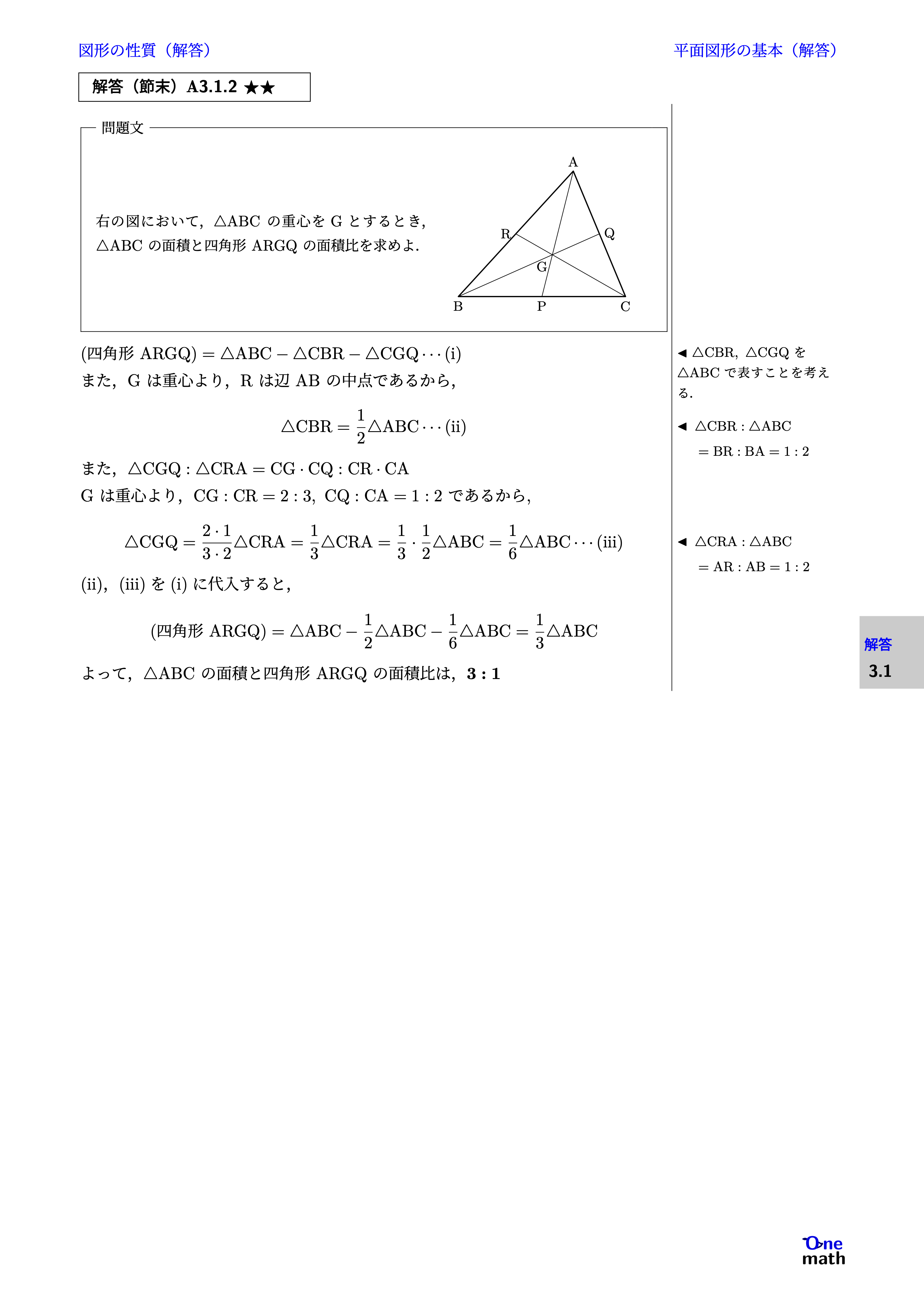 $(\text{四角形 ARGQ})=\triangle \mathrm{ABC}-\triangle \mathrm{CBR}-\triangle \mathrm{CGQ} \cdots(\mathrm{i})$ また,Gは重心より,Rは辺ABの中点であるから, $$ \triangle \mathrm{CBR}=\frac{1}{2} \triangle \mathrm{ABC}\cdots(\mathrm{ii}) $$ また,$\triangle \mathrm{CGQ}: \triangle \mathrm{CRA}=\mathrm{CG} \cdot \mathrm{CQ}: \mathrm{CR} \cdot \mathrm{CA}$ Gは重心より,$\mathrm{CG}: \mathrm{CR}=2: 3,\mathrm{CQ}: \mathrm{CA}=1: 2$であるから, $$ \triangle \mathrm{CGQ} =\frac{2 \cdot 1}{3 \cdot 2} \triangle \mathrm{CRA}=\frac{1}{3} \triangle \mathrm{CRA} =\frac{1}{3} \cdot \frac{1}{2} \triangle \mathrm{ABC}=\frac{1}{6} \triangle \mathrm{ABC}\cdots(\mathrm{iii}) $$ (ii),(iii)を(i)に代入すると, $$(\text{四角形 ARGQ})=\triangle \mathrm{ABC}-\frac{1}{2} \triangle \mathrm{ABC}-\frac{1}{6} \triangle \mathrm{ABC} =\frac{1}{3} \triangle \mathrm{ABC} $$ よって,$\triangle \mathrm{ABC}$の面積と四角形ARGQの面積比は,$3: 1$