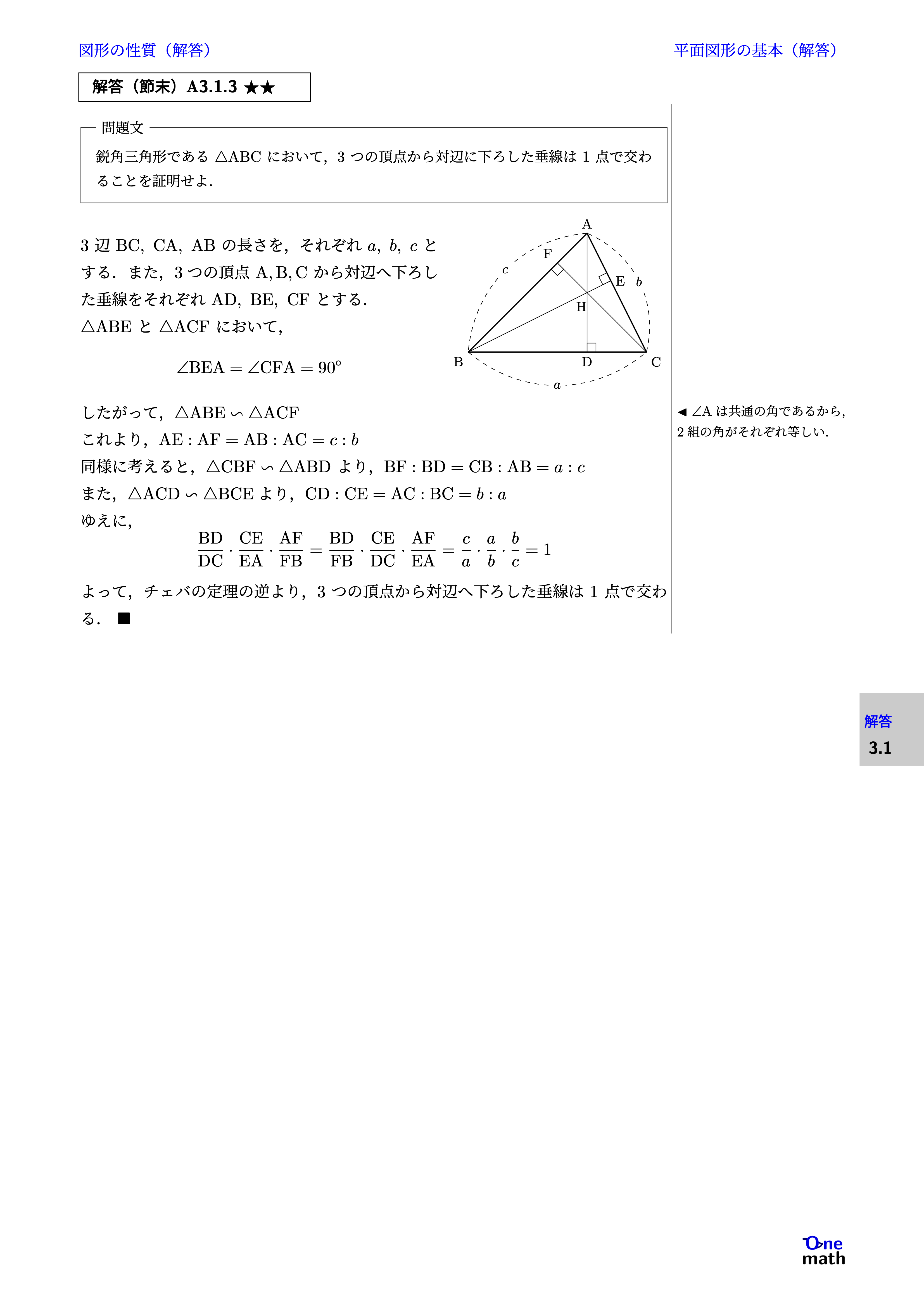 3辺$\mathrm{BC},\mathrm{CA},\mathrm{AB}$の長さを,それぞれ$a,b,c$とする.また,3つの頂点$\mathrm{A,B,C}$から対辺へ下ろした垂線をそれぞれ$\mathrm{AD,BE,CF}$とする. $\triangle \mathrm{ABE}$と$\triangle \mathrm{ACF}$において, $$\angle \mathrm{BEA}=\angle \mathrm{CFA}=90^{\circ}$$ したがって,$\triangle \mathrm{ABE} \backsim \triangle \mathrm{ACF}$ これより,$\mathrm{AE}:\mathrm{AF}=\mathrm{AB}:\mathrm{AC}=c:b$ 同様に考えると,$\triangle \mathrm{CBF} \backsim \triangle \mathrm{ABD}$より,$\mathrm{BF}:\mathrm{BD}=\mathrm{CB}:\mathrm{AB}=a:c$ また,$ \triangle \mathrm{ACD} \backsim \triangle \mathrm{BCE}$より,$\mathrm{CD}:\mathrm{CE}=\mathrm{AC}:\mathrm{BC}=b:a $ ゆえに, $$ \frac{\mathrm{BD}}{\mathrm{DC}} \cdot \frac{\mathrm{CE}}{\mathrm{EA}} \cdot \frac{\mathrm{AF}}{\mathrm{FB}} = \frac{\mathrm{BD}}{\mathrm{FB}} \cdot \frac{\mathrm{CE}}{\mathrm{DC}} \cdot \frac{\mathrm{AF}}{\mathrm{EA}} = \frac{c}{a} \cdot \frac{a}{b} \cdot \frac{b}{c}=1 $$ よって,チェバの定理の逆より, 3つの頂点から対辺へ下ろした垂線は1点で交わる.$ \blacksquare$