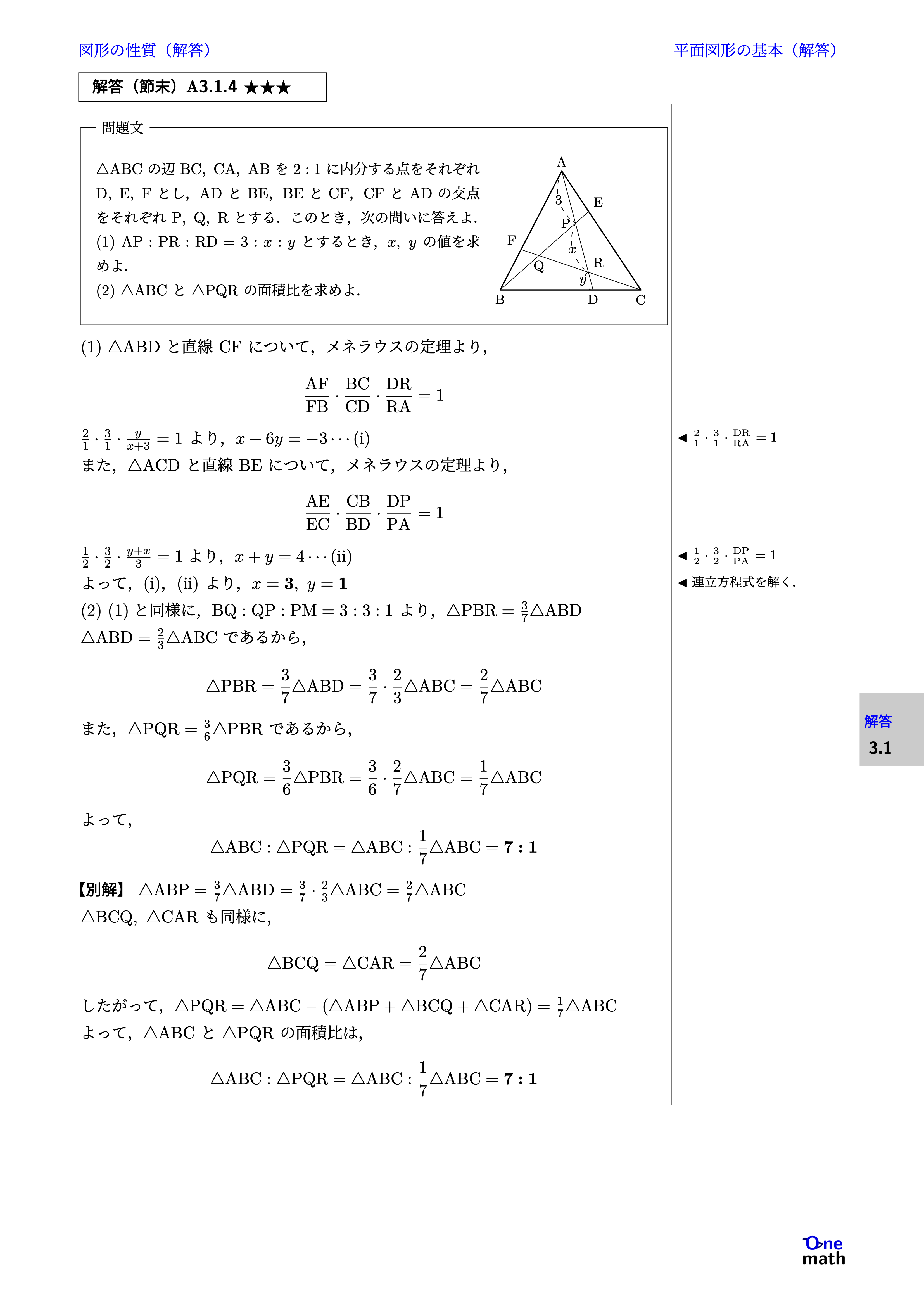 (1)$\triangle \mathrm{ABD}$と直線CFについて,メネラウスの定理より, $$ \frac{\mathrm{AF}}{\mathrm{FB}} \cdot \frac{\mathrm{BC}}{\mathrm{CD}} \cdot \frac{\mathrm{DR}}{\mathrm{RA}}=1 $$ $ \frac{2}{1} \cdot \frac{3}{1} \cdot \frac{y}{x+3}=1 $ より,$x-6y=-3 \cdots(\mathrm{i})$ また,$\triangle \mathrm{ACD}$と直線BEについて,メネラウスの定理より, $$ \frac{\mathrm{AE}}{\mathrm{EC}} \cdot \frac{\mathrm{CB}}{\mathrm{BD}} \cdot \frac{\mathrm{DP}}{\mathrm{PA}}=1 $$ $ \frac{1}{2} \cdot \frac{3}{2} \cdot \frac{y+x}{3}=1 $より,$x+y=4 \cdots(\mathrm{ii})$ よって,(i),(ii)より,$x=3,y=1$ (2)(1)と同様に,$\mathrm{BQ}:\mathrm{QP}:\mathrm{PM}=3:3:1$より,$\triangle \mathrm{PBR}=\frac{3}{7} \triangle \mathrm{ABD}$ $\triangle \mathrm{ABD}=\frac{2}{3} \triangle \mathrm{ABC}$であるから, $$ \triangle \mathrm{PBR}=\frac{3}{7}\triangle \mathrm{ABD}=\frac{3}{7} \cdot \frac{2}{3}\triangle \mathrm{ABC}=\frac{2}{7} \triangle \mathrm{ABC} $$ また,$\triangle \mathrm{PQR}=\frac{3}{6} \triangle \mathrm{PBR}$であるから, $$ \triangle \mathrm{PQR}=\frac{3}{6} \triangle \mathrm{PBR}=\frac{3}{6} \cdot \frac{2}{7}\triangle \mathrm{ABC}=\frac{1}{7} \triangle \mathrm{ABC} $$ よって, $$ \triangle \mathrm{ABC}:\triangle \mathrm{PQR}=\triangle \mathrm{ABC}:\frac{1}{7} \triangle \mathrm{ABC}=7:1 $$ 別解: $\triangle \mathrm{ABP}=\frac{3}{7} \triangle \mathrm{ABD}=\frac{3}{7} \cdot \frac{2}{3} \triangle \mathrm{ABC}=\frac{2}{7} \triangle \mathrm{ABC}$ $\triangle \mathrm{BCQ},\triangle \mathrm{CAR}$も同様に, $$\triangle \mathrm{BCQ}=\triangle \mathrm{CAR}=\frac{2}{7} \triangle \mathrm{ABC}$$ したがって, $\triangle \mathrm{PQR} =\triangle \mathrm{ABC}-(\triangle \mathrm{ABP}+\triangle \mathrm{BCQ}+\triangle \mathrm{CAR}) =\frac{1}{7}\triangle \mathrm{ABC}$ よって,$\triangle \mathrm{ABC}$と$\triangle \mathrm{PQR}$の面積比は, $$ \triangle \mathrm{ABC}:\triangle \mathrm{PQR}=\triangle \mathrm{ABC}:\frac{1}{7} \triangle \mathrm{ABC}=7:1 $$