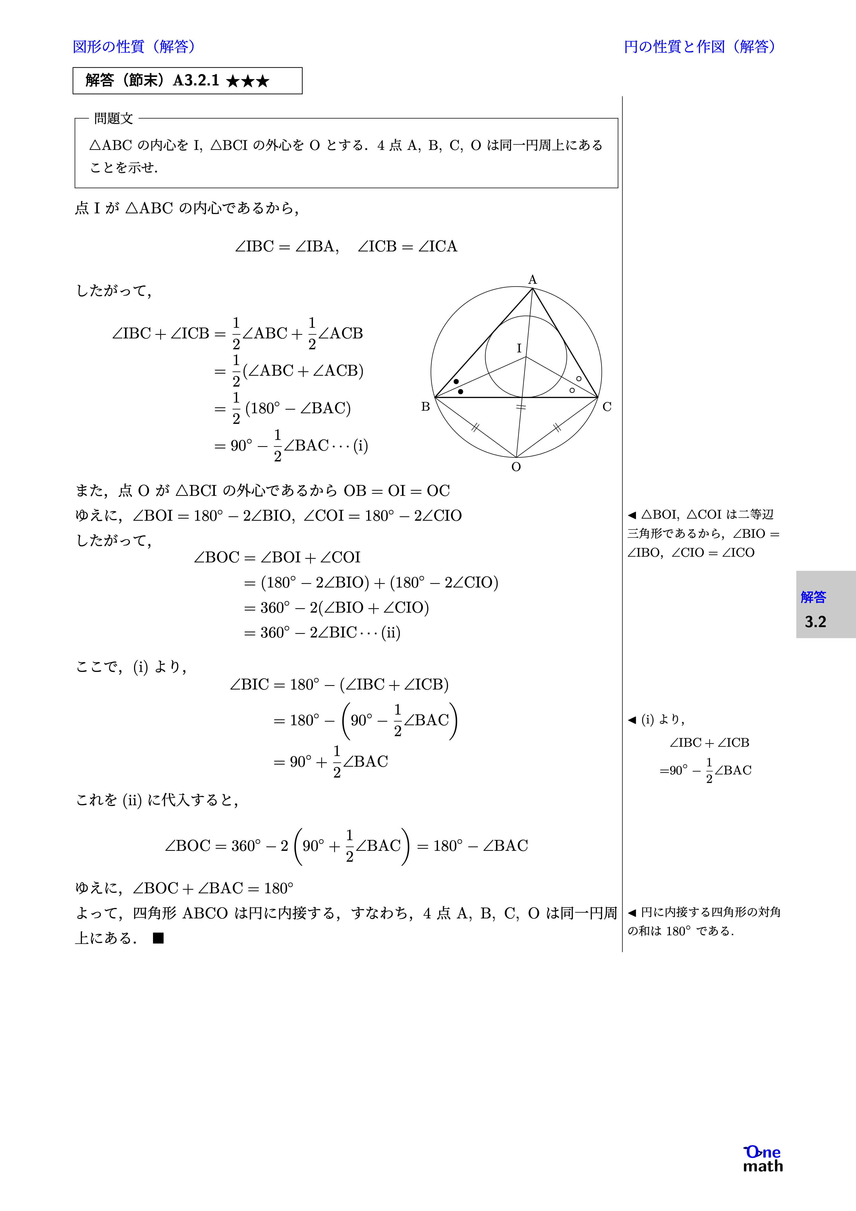 点$\mathrm{I}$が$\triangle \mathrm{ABC}$の内心であるから, $$ \angle \mathrm{IBC}=\angle \mathrm{IBA},\angle \mathrm{ICB}=\angle \mathrm{ICA} $$ したがって, $$ \begin{aligned} \angle \mathrm{IBC}+\angle \mathrm{ICB} & =\frac{1}{2} \angle \mathrm{ABC}+\frac{1}{2} \angle \mathrm{ACB} \\ & =\frac{1}{2}(\angle \mathrm{ABC}+\angle \mathrm{ACB}) \\ & =\frac{1}{2}\left(180^{\circ}-\angle \mathrm{BAC}\right)\\ &=90^{\circ}-\frac{1}{2} \angle \mathrm{BAC} \cdots(\mathrm{i}) \end{aligned} $$ また,点$\mathrm{O}$が$\triangle \mathrm{BCI}$の外心であるから$\mathrm{OB}=\mathrm{OI}=\mathrm{OC}$ ゆえに,$\angle \mathrm{BOI}=180^{\circ}-2 \angle \mathrm{BIO},\angle \mathrm{COI}=180^{\circ}-2 \angle \mathrm{CIO}$ したがって, $$ \begin{aligned} \angle \mathrm{BOC} & =\angle \mathrm{BOI}+\angle \mathrm{COI} \\ & =\left(180^{\circ}-2 \angle \mathrm{BIO}\right)+\left(180^{\circ}-2 \angle \mathrm{CIO}\right) \\ & =360^{\circ}-2(\angle \mathrm{BIO}+\angle \mathrm{CIO})\\ &=360^{\circ}-2 \angle \mathrm{BIC} \cdots(\mathrm{ii}) \end{aligned} $$ ここで,(i)より, $$ \begin{aligned} \angle \mathrm{BIC} & =180^{\circ}-(\angle \mathrm{IBC}+\angle \mathrm{ICB}) \\ & =180^{\circ}-\left(90^{\circ}-\frac{1}{2} \angle \mathrm{BAC}\right)\\ &=90^{\circ}+\frac{1}{2} \angle \mathrm{BAC} \end{aligned} $$ これを(ii)に代入すると, $$ \angle \mathrm{BOC}=360^{\circ}-2\left(90^{\circ}+\frac{1}{2} \angle \mathrm{BAC}\right)=180^{\circ}-\angle \mathrm{BAC} $$ ゆえに,$\angle \mathrm{BOC}+\angle \mathrm{BAC}=180^{\circ}$ よって,四角形$\mathrm{ABCO}$は円に内接する, すなわち,4点$\mathrm{A},\mathrm{B},\mathrm{C},\mathrm{O}$は同一円周上にある.$ \blacksquare$