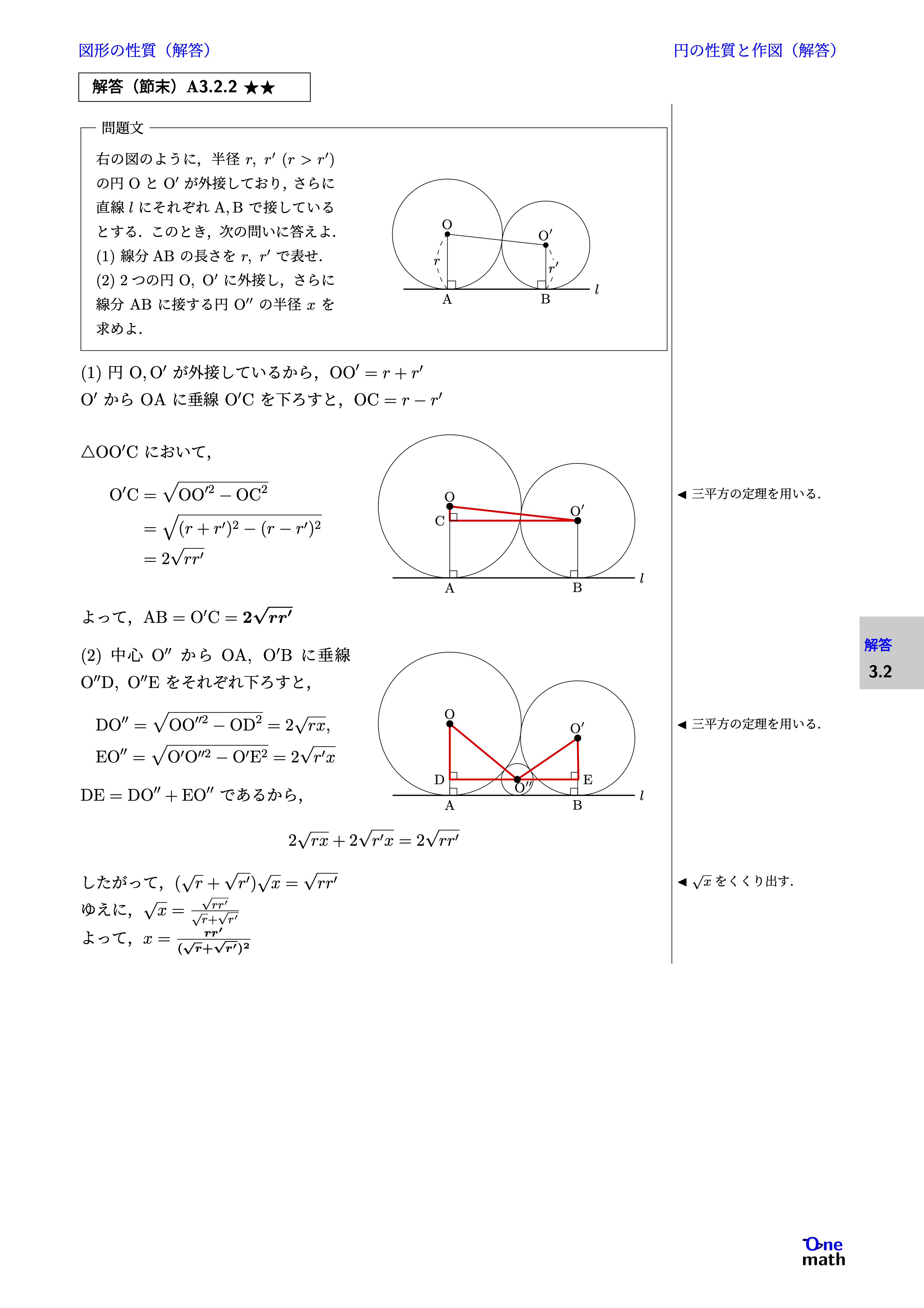 (1)円$\mathrm{O},\mathrm{O}^{\prime}$が外接しているから, $ \mathrm{OO}^{\prime}=r+r^{\prime} $ $\mathrm{O}^{\prime}$から$\mathrm{OA}$に垂線$\mathrm{O}^{\prime} \mathrm{C}$を下ろすと, $ \mathrm{OC}=r-r^{\prime} $ $\triangle \mathrm{O}\mathrm{O}^{\prime} \mathrm{C}$において, $$ \begin{aligned} \mathrm{O}^{\prime} \mathrm{C} & =\sqrt{\mathrm{OO}^{\prime 2}-\mathrm{OC}^2} \\ & =\sqrt{(r+r^{\prime})^2-(r-r^{\prime})^2}\\ &=2 \sqrt{r r^{\prime}} \end{aligned} $$ よって,$\mathrm{AB}=\mathrm{O}^{\prime} \mathrm{C}={2} \sqrt{{r} {r}^{\prime}}$ (2)中心$\mathrm{O}^{\prime \prime}$から$\mathrm{OA},\mathrm{O}^{\prime} \mathrm{B}$に垂線$\mathrm{O}^{\prime \prime} \mathrm{D},\mathrm{O}^{\prime \prime} \mathrm{E}$をそれぞれ下ろすと, $$ \begin{aligned} & \mathrm{DO}^{\prime \prime}=\sqrt{\mathrm{OO}^{\prime\prime 2}-\mathrm{OD}^2}=2 \sqrt{r x},\\ & \mathrm{EO}^{\prime \prime}=\sqrt{\mathrm{O}^{\prime} \mathrm{O}^{\prime\prime 2}-\mathrm{O}^{\prime} \mathrm{E}^2}=2 \sqrt{r^{\prime} x} \end{aligned} $$ $\mathrm{DE}=\mathrm{DO}^{\prime \prime}+\mathrm{EO}^{\prime \prime}$であるから, $$ 2 \sqrt{r x}+2 \sqrt{r^{\prime} x}=2 \sqrt{r r^{\prime}} $$ したがって, $(\sqrt{r}+\sqrt{r^{\prime}}) \sqrt{x}=\sqrt{r r^{\prime}}$ ゆえに,$\sqrt{x}=\frac{\sqrt{r r^{\prime}}}{\sqrt{r}+\sqrt{r^{\prime}}}$ よって,$x=\frac{r r^{\prime}}{(\sqrt{r}+\sqrt{r^{\prime}})^2}$