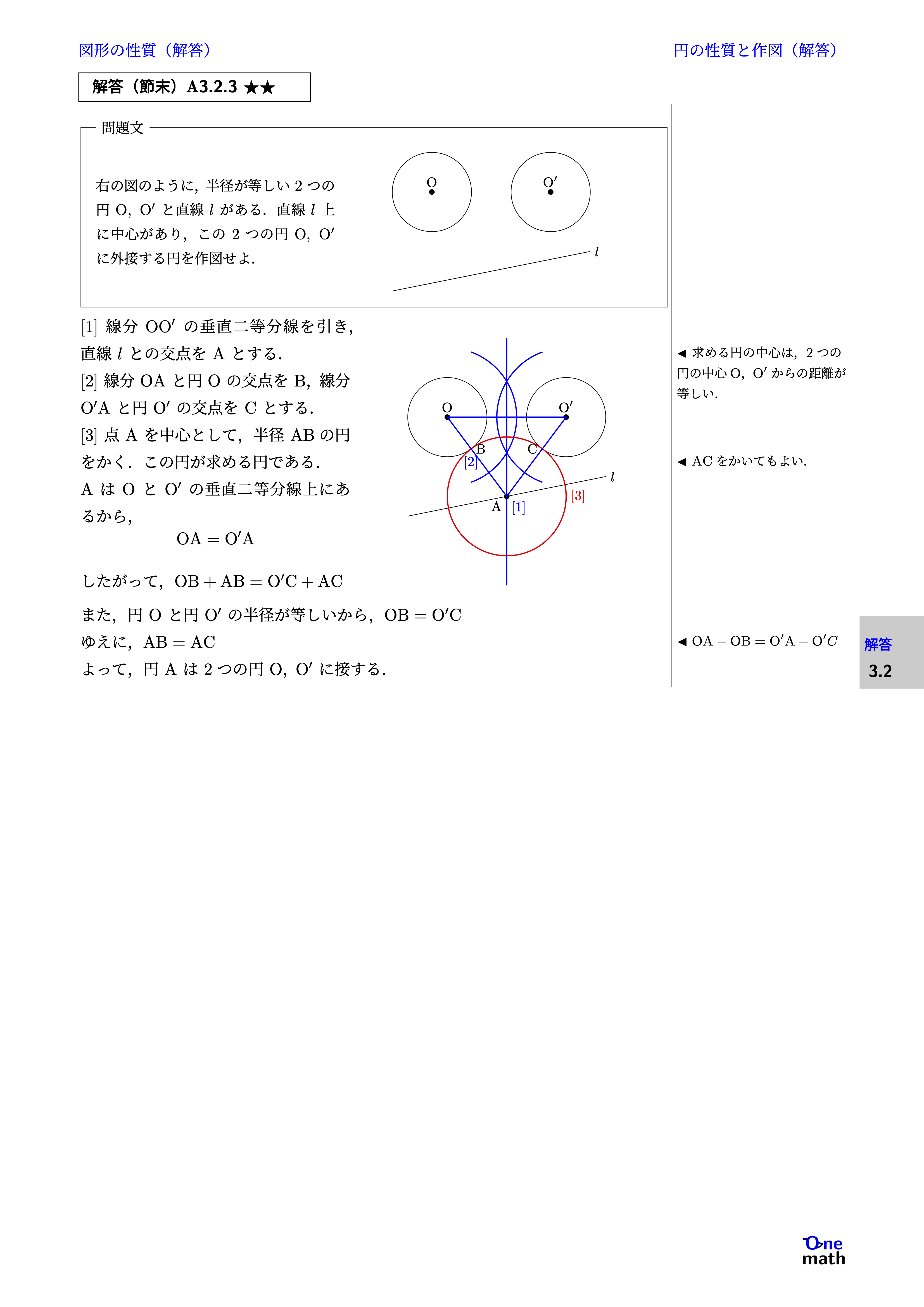 [1]線分$\mathrm{OO}^{\prime}$の垂直二等分線を引き, 直線$l$との交点を$\mathrm{A}$とする. [2]線分$\mathrm{OA}$と円$\mathrm{O}$の交点を$\mathrm{B}$,線分$\mathrm{O}^{\prime}\mathrm{A}$と円$\mathrm{O}^{\prime}$の交点を$\mathrm{C}$とする. [3]点$\mathrm{A}$を中心として,半径$\mathrm{AB}$の円をかく.この円が求める円である. $\mathrm{A}$は$\mathrm{O}$と$\mathrm{O}^{\prime}$の垂直二等分線上にあるから,$$\mathrm{OA}=\mathrm{O}^{\prime}\mathrm{A}$$ したがって, $ \mathrm{OB}+\mathrm{AB}=\mathrm{O}^{\prime}\mathrm{C}+\mathrm{AC} $ また,円$\mathrm{O}$と円$\mathrm{O}^{\prime}$の半径が等しいから, $ \mathrm{OB}=\mathrm{O}^{\prime}\mathrm{C} $ ゆえに, $ \mathrm{AB}=\mathrm{AC} $ よって,円$\mathrm{A}$は2つの円$\mathrm{O},\mathrm{O}^{\prime}$に接する.