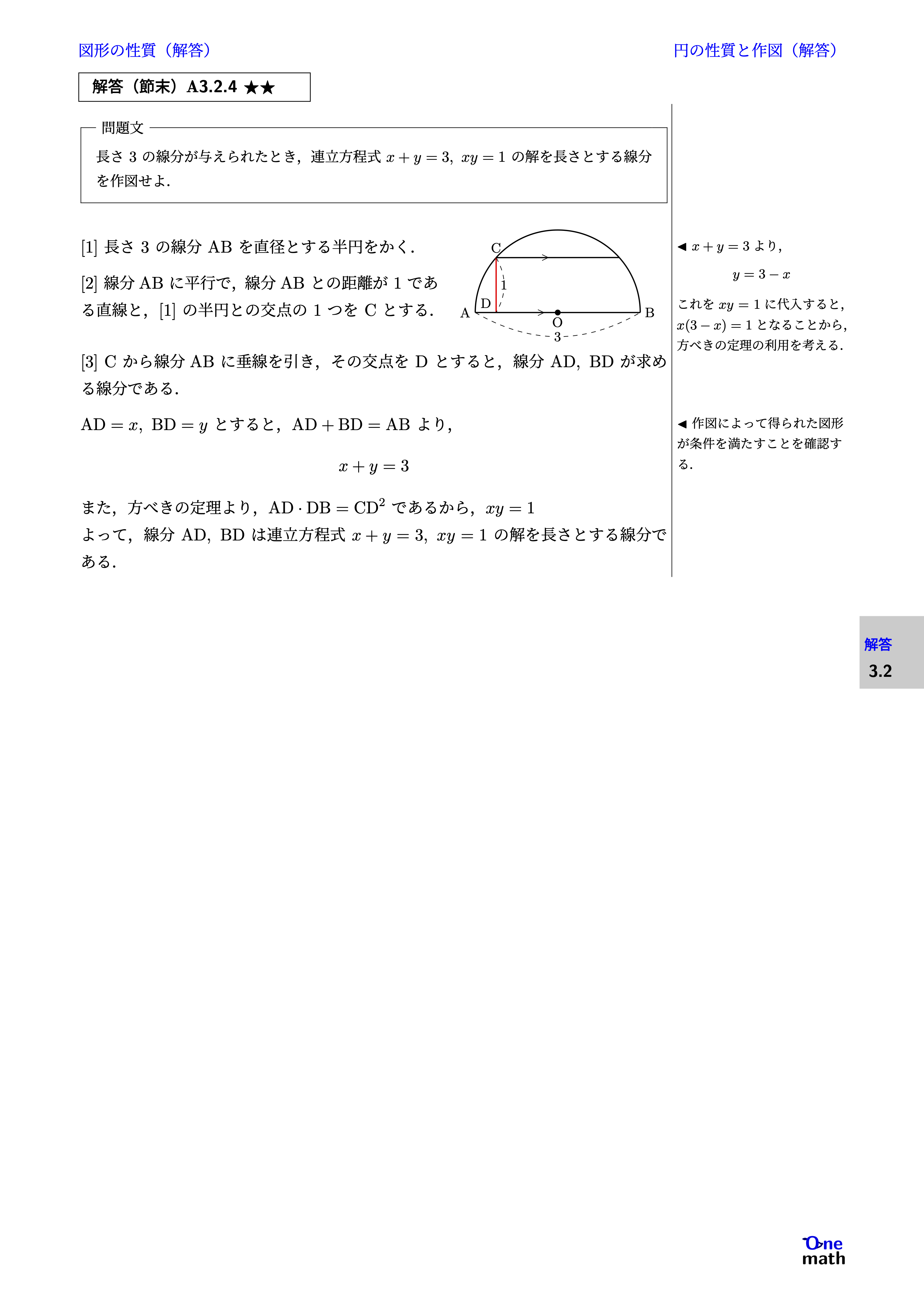 長さ3の線分が与えられたとき,連立方程式$x+y=3,x y=1$の解を長さとする線分を作図せよ.