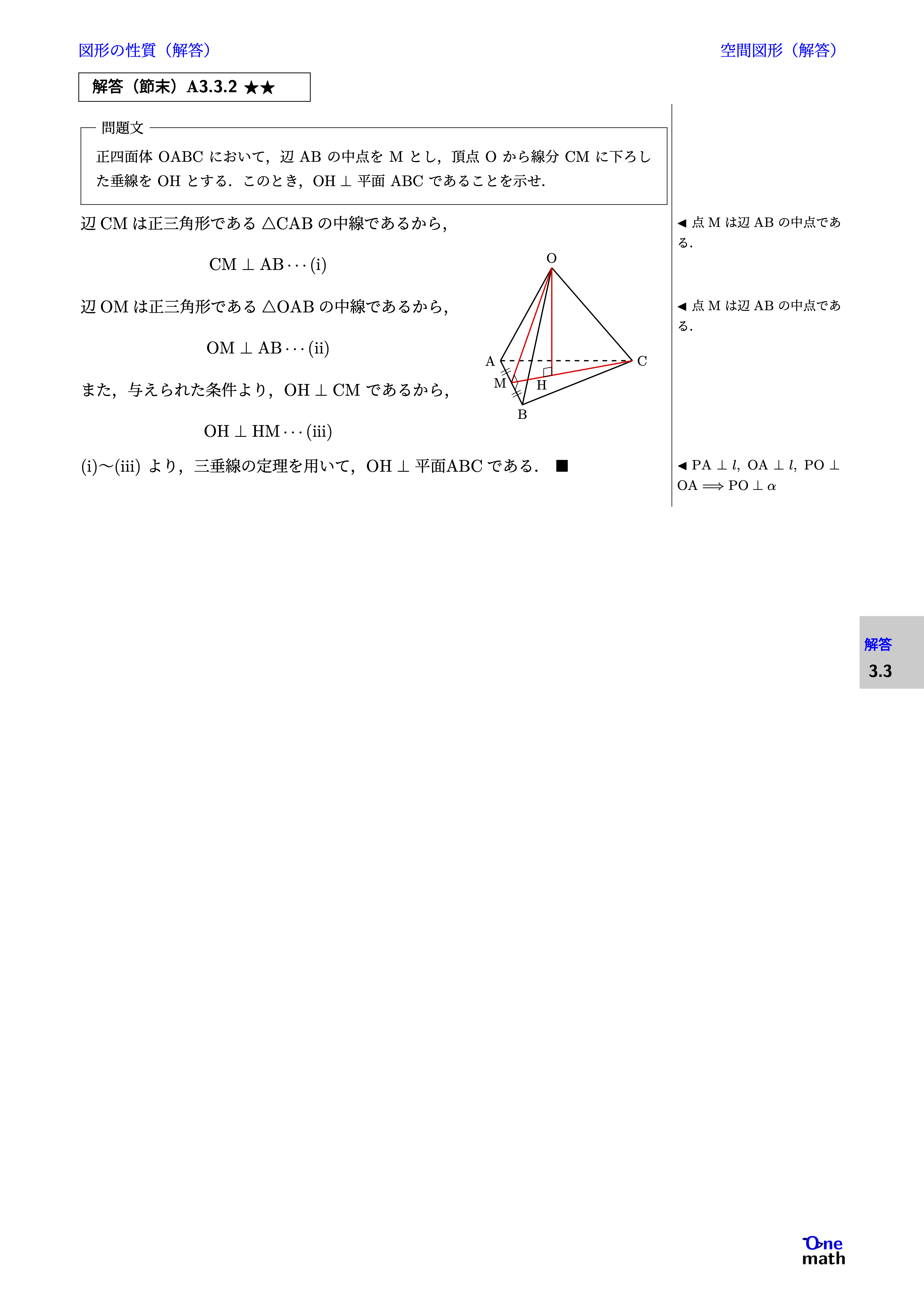 正四面体$\mathrm{OABC}$において,辺$\mathrm{AB}$の中点を$\mathrm{M}$とし,頂点$\mathrm{O}$から線分$\mathrm{CM}$に下ろした垂線を$\mathrm{OH}$とする.このとき,$\mathrm{OH} \perp$平面$\mathrm{ABC}$であることを示せ.