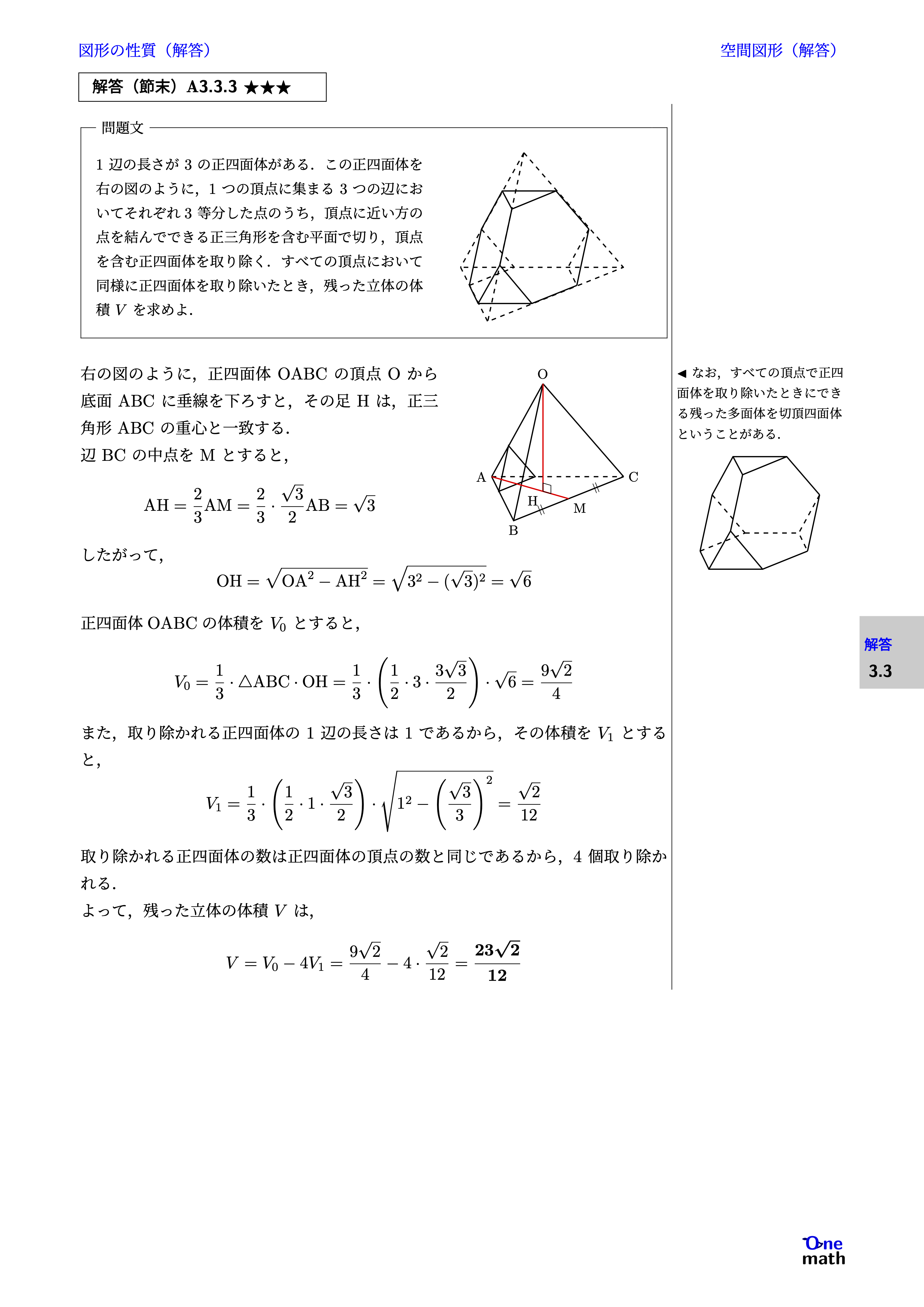 \index{せっちょうしめんたい@切頂四面体} 右の図のように,正四面体$\mathrm{OABC}$の頂点$\mathrm{O}$から底面$\mathrm{ABC}$に垂線を下ろすと,その足$\mathrm{H}$は,正三角形$\mathrm{ABC}$の重心と一致する. 辺$\mathrm{BC}$の中点を$\mathrm{M}$とすると, $$ \mathrm{AH} = \frac{2}{3} \mathrm{AM} = \frac{2}{3} \cdot \frac{\sqrt{3}}{2} \mathrm{AB} = \sqrt{3} $$ したがって, $$ \mathrm{OH} = \sqrt{\mathrm{OA}^2 - \mathrm{AH}^2} = \sqrt{3^2 - (\sqrt{3})^2} = \sqrt{6} $$ 正四面体$\mathrm{OABC}$の体積を$V_0$とすると, $$ V_0 = \frac{1}{3} \cdot \triangle \mathrm{ABC} \cdot \mathrm{OH} = \frac{1}{3} \cdot \left(\frac{1}{2} \cdot 3 \cdot \frac{3 \sqrt{3}}{2}\right) \cdot \sqrt{6} = \frac{9 \sqrt{2}}{4} $$ また,取り除かれる正四面体の1辺の長さは1であるから,その体積を$V_1$とすると, $$ V_1 = \frac{1}{3} \cdot \left(\frac{1}{2} \cdot 1 \cdot \frac{\sqrt{3}}{2}\right) \cdot \sqrt{1^2 - \left(\frac{\sqrt{3}}{3}\right)^2} = \frac{\sqrt{2}}{12} $$ 取り除かれる正四面体の数は正四面体の頂点の数と同じであるから,4個取り除かれる. よって,残った立体の体積$V$は, $$ V = V_0 - 4 V_1 = \frac{9 \sqrt{2}}{4} - 4 \cdot \frac{\sqrt{2}}{12} = \frac{23 \sqrt{2}}{12} $$