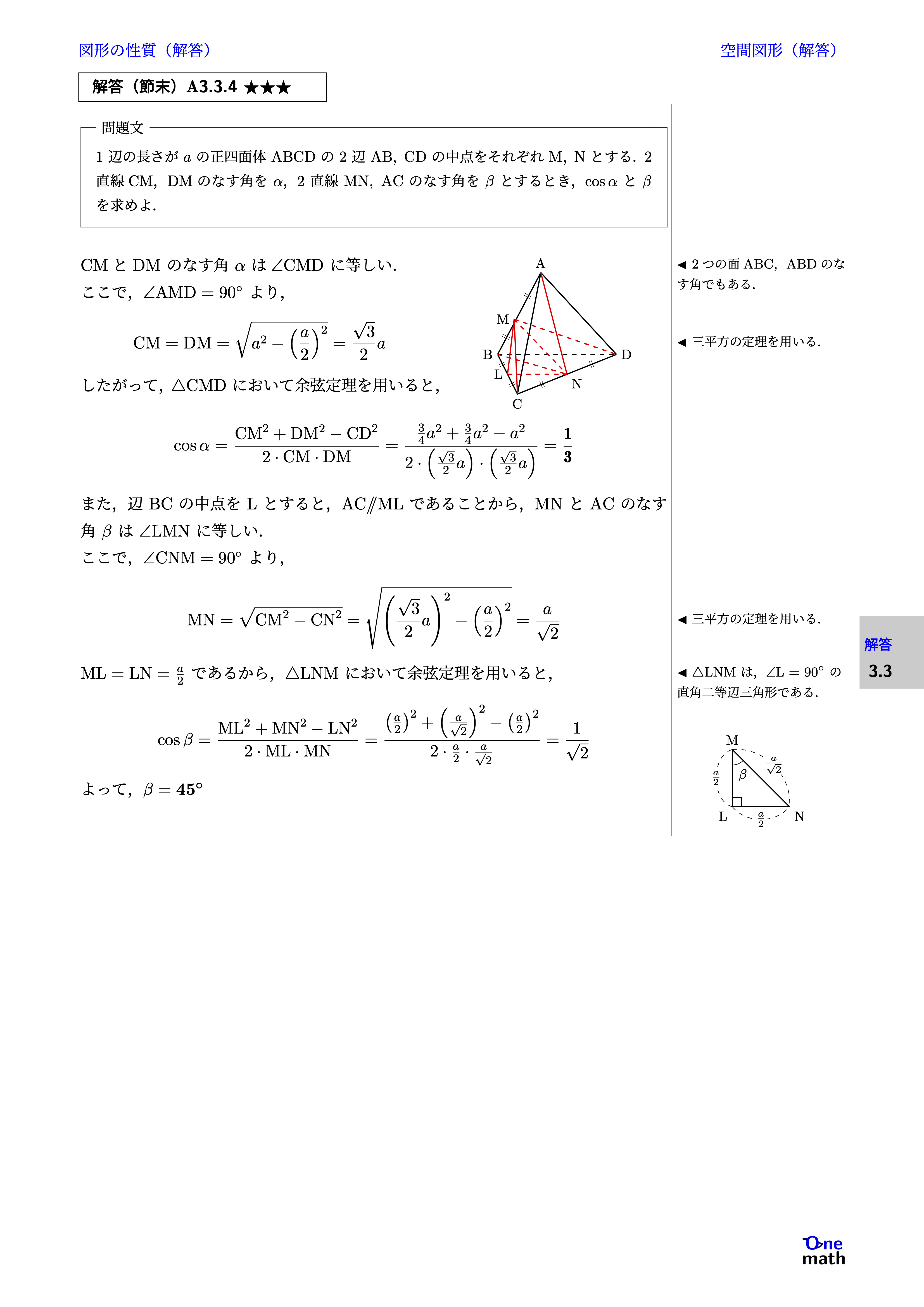 CMとDMのなす角$\alpha$は$\angle \mathrm{CMD}$に等しい. ここで,$\angle \mathrm{AMD} = 90^\circ$より, $$ \mathrm{CM} = \mathrm{DM} = \sqrt{a^2 - \left(\frac{a}{2}\right)^2} = \frac{\sqrt{3}}{2} a $$ したがって,$\triangle \mathrm{CMD}$において余弦定理を用いると, $$ \cos \alpha = \frac{\mathrm{CM}^2 + \mathrm{DM}^2 - \mathrm{CD}^2}{2 \cdot \mathrm{CM} \cdot \mathrm{DM}} = \frac{\frac{3}{4} a^2+\frac{3}{4} a^2 - a^2}{2 \cdot \left(\frac{\sqrt{3}}{2} a\right)\cdot \left(\frac{\sqrt{3}}{2} a\right)} = \frac{1}{3} $$ また, 辺$\mathrm{BC}$の中点を$\mathrm{L}$とすると,$\mathrm{AC} \parallel \mathrm{ML}$であることから,$\mathrm{MN}$と$\mathrm{AC}$のなす角$\beta$は$\angle \mathrm{LMN}$に等しい. ここで,$\angle \mathrm{CNM} = 90^\circ$より, $$ \mathrm{MN} = \sqrt{\mathrm{CM}^2 - \mathrm{CN}^2} = \sqrt{\left(\frac{\sqrt{3}}{2} a\right)^2 - \left(\frac{a}{2}\right)^2} = \frac{a}{\sqrt{2}} $$ $\mathrm{ML} = \mathrm{LN} = \frac{a}{2}$であるから,$\triangle \mathrm{LNM}$において余弦定理を用いると, $$ \cos \beta = \frac{\mathrm{ML}^2 + \mathrm{MN}^2 - \mathrm{LN}^2}{2 \cdot \mathrm{ML} \cdot \mathrm{MN}} = \frac{\left(\frac{a}{{2}}\right)^2+\left(\frac{a}{\sqrt{2}}\right)^2-\left(\frac{a}{{2}}\right)^2}{2 \cdot \frac{a}{2} \cdot \frac{a}{\sqrt{2}}} = \frac{1}{\sqrt{2}} $$ よって,$\beta = 45^\circ$