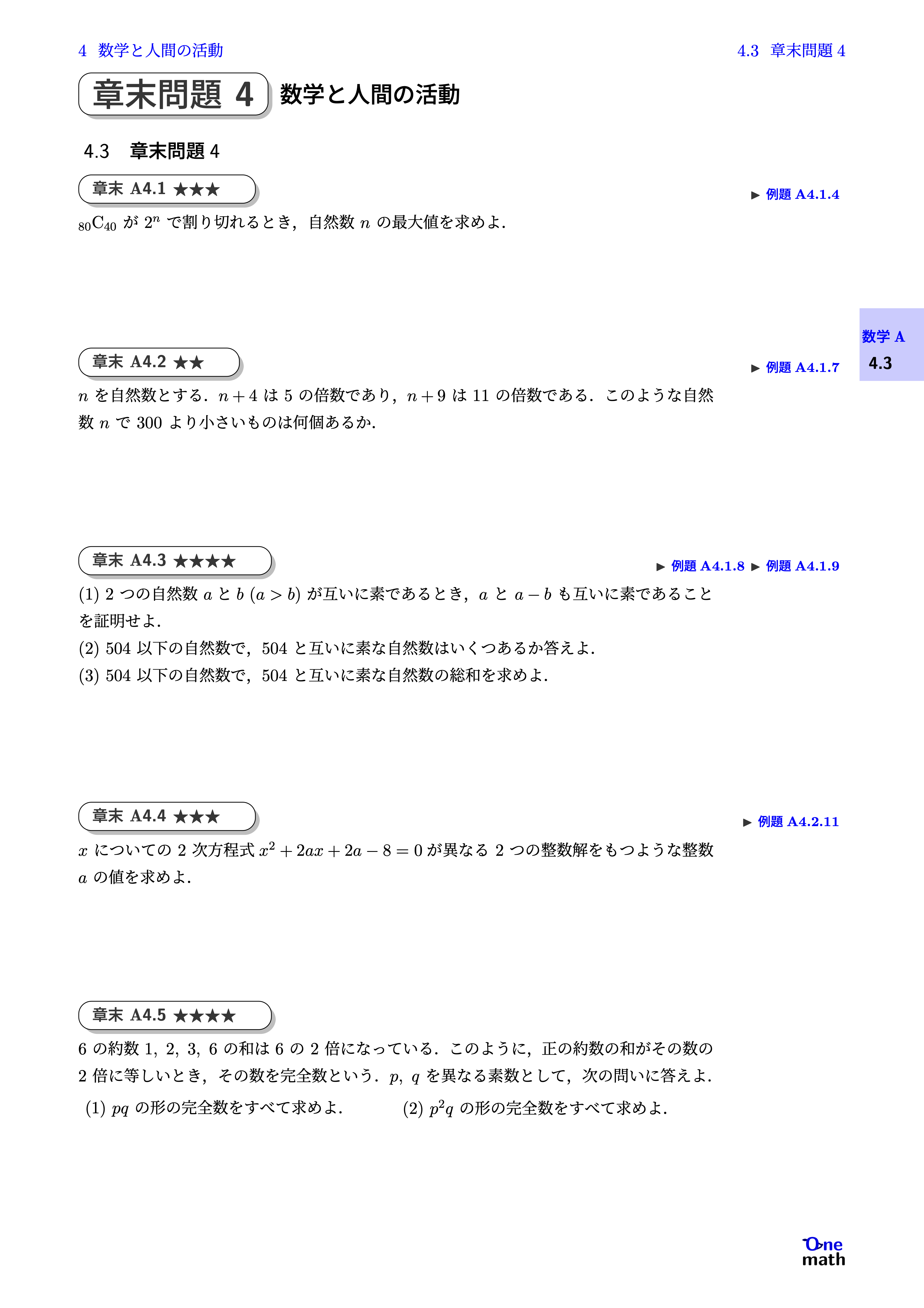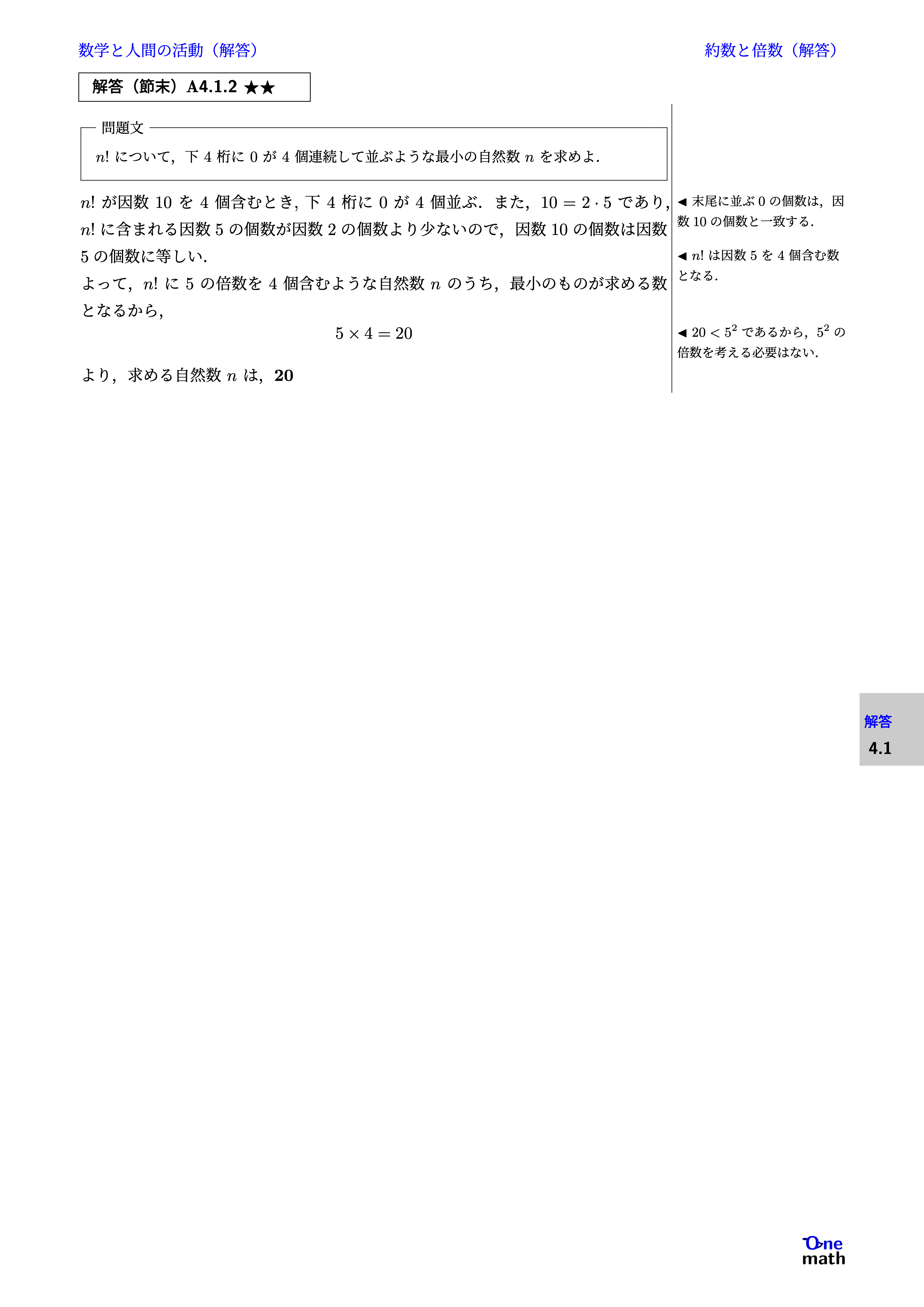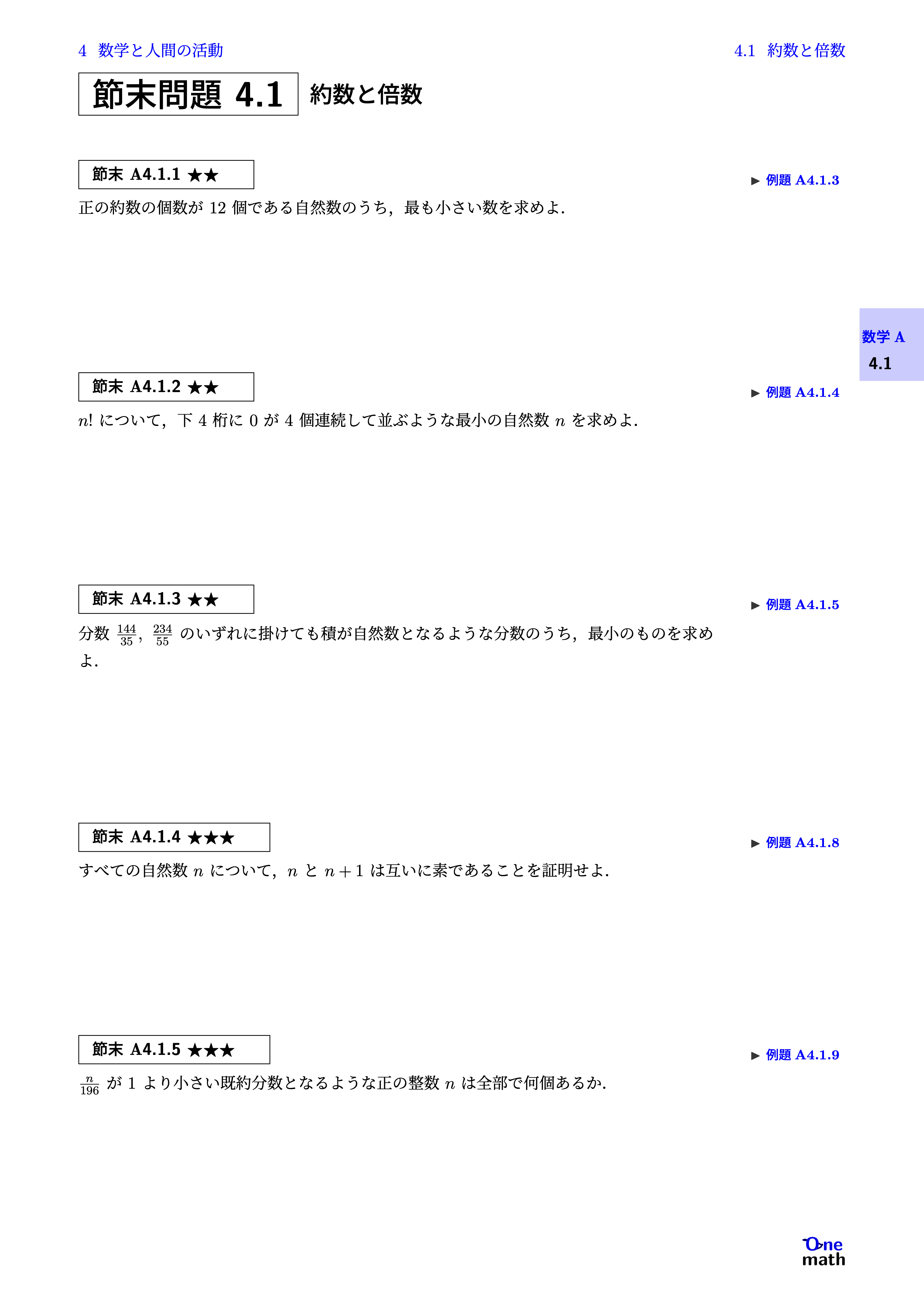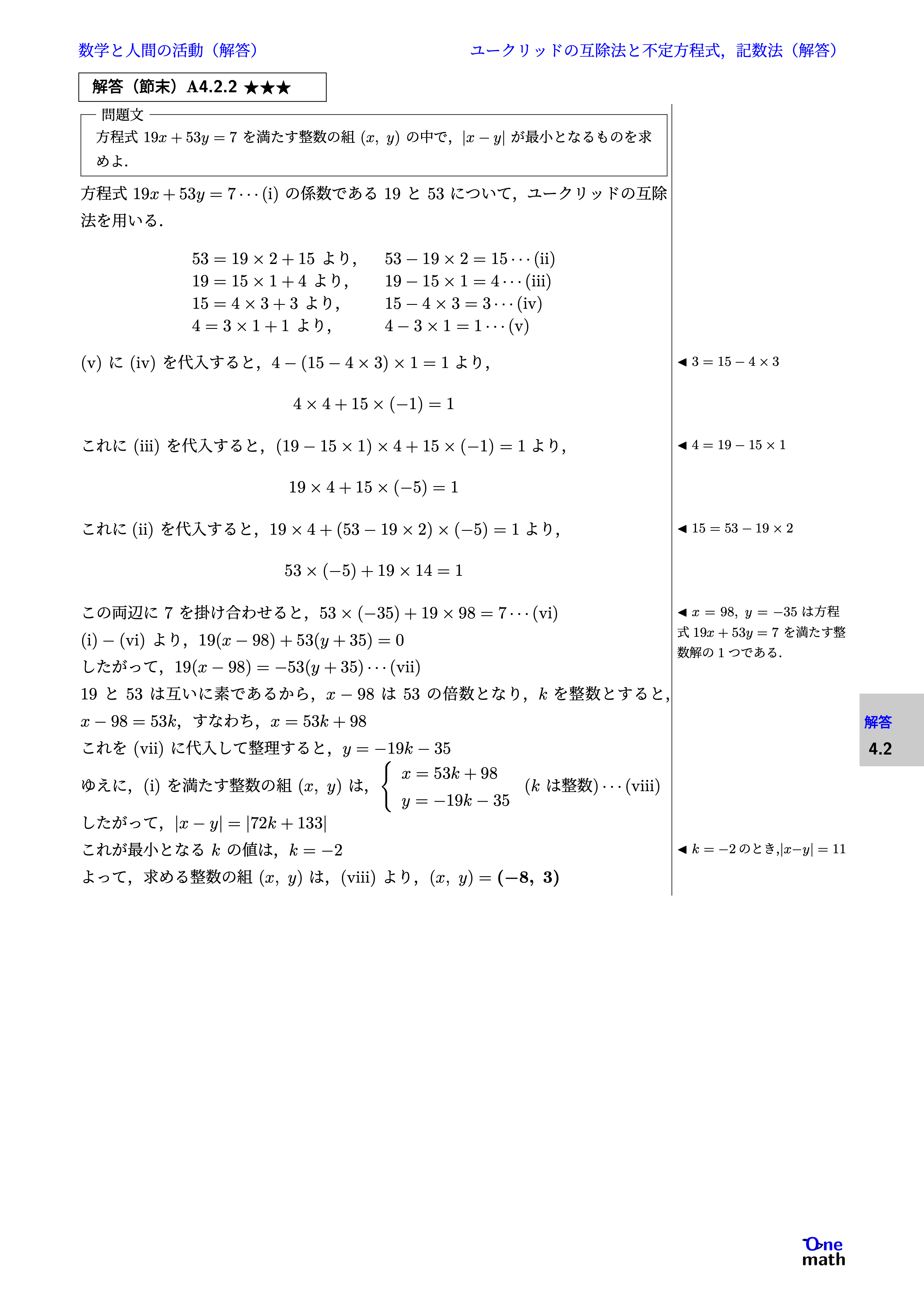 https://www.youtube.com/watch?v=T8pmwMS3QdI 問題の解答 検索用コード(LaTeX) % 例題A4.1.5:最大公約数・最小公倍数1 (One More)★ (1)次の各組の最大公約数と最...