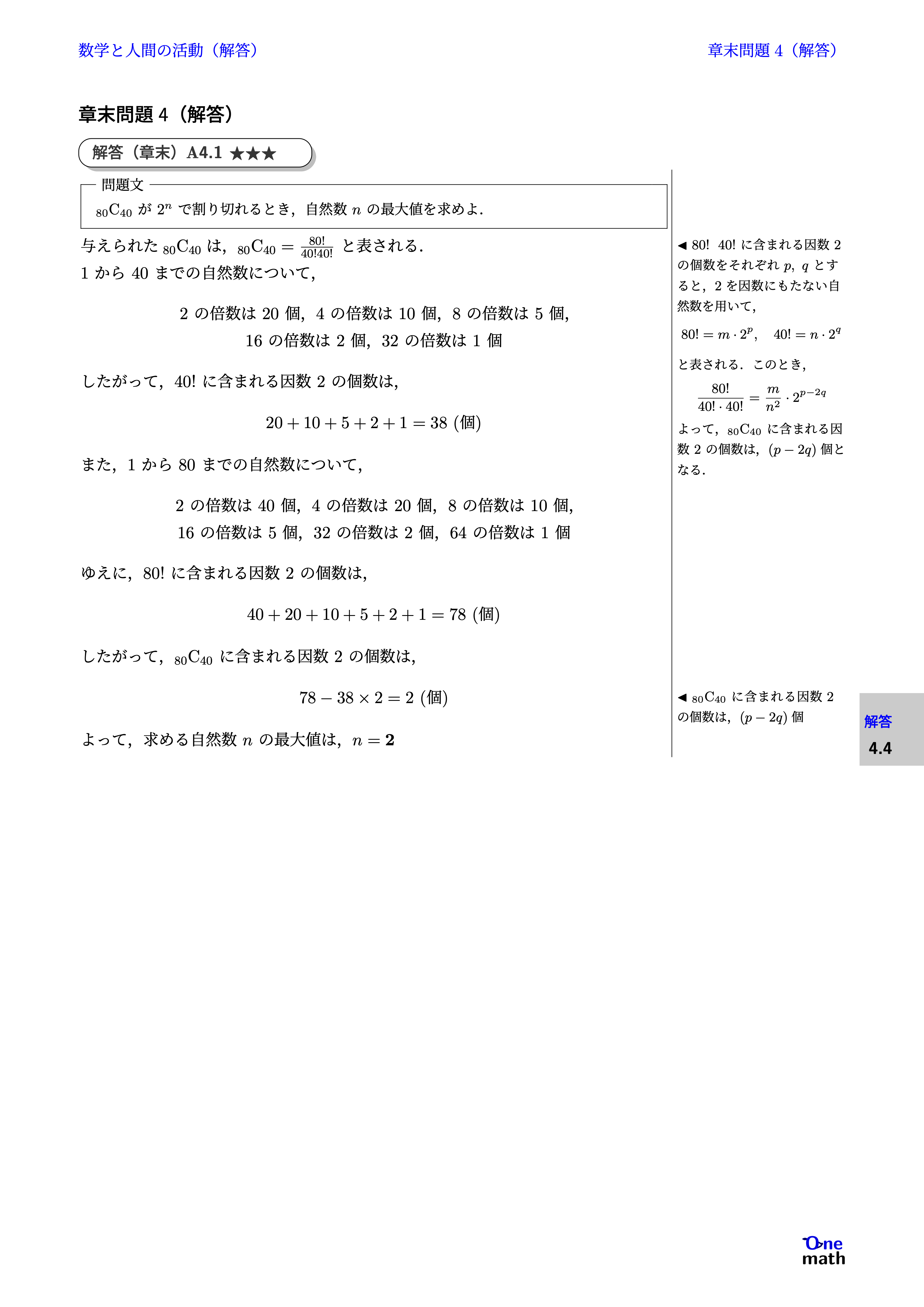 https://www.youtube.com/watch?v=zQWlLI6jS6E 問題の解答 検索用コード(LaTeX) % 例題A4.1.4:素因数の個数 (One More)★★ (1)$13!$が$2^k$で割り切れるとき,自然数...