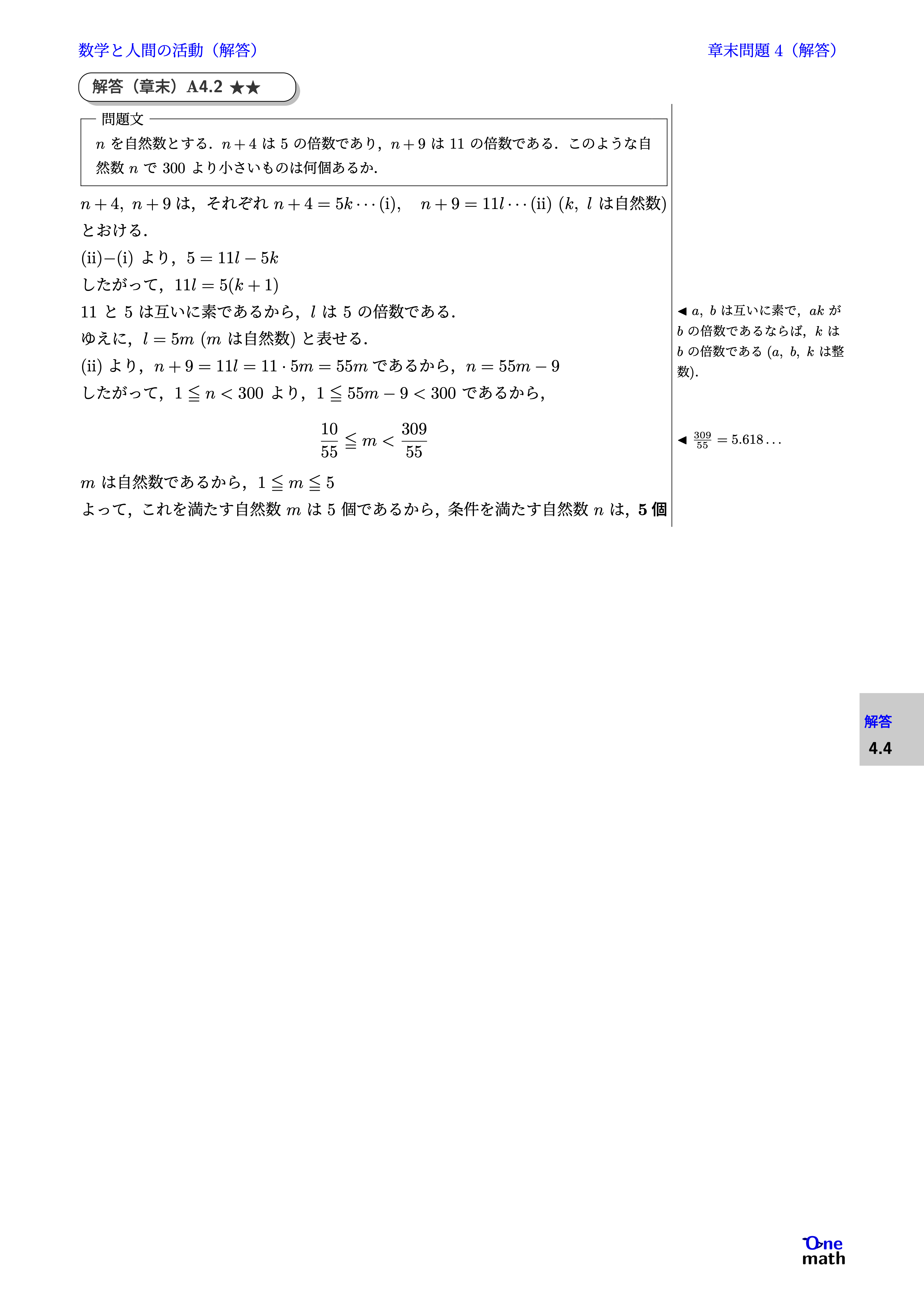 $n+4,n+9$は,それぞれ $ n+4 = 5k\cdots(\mathrm{i}), n+9 = 11l\cdots(\mathrm{ii}) (k,l \text{ は自然数 }) $ とおける. (ii)$-$(i)より, $ 5 = 11l - 5k $ したがって, $ 11l = 5(k+1) $ 11と5は互いに素であるから,$l$は5の倍数である. ゆえに,$l = 5m (m \text{ は自然数})$と表せる. (ii)より,$n+9 = 11l=11 \cdot 5m=55m$であるから, $ n = 55m - 9 $ したがって,$1 \leqq n < 300$より, $ 1 \leqq 55m - 9 < 300 $ であるから, $$ \frac{10}{55} \leqq m < \frac{309}{55} $$ $m$は自然数であるから,$1 \leqq m \leqq 5$ よって,これを満たす自然数$m$は5個であるから,条件を満たす自然数$n$は,5個
