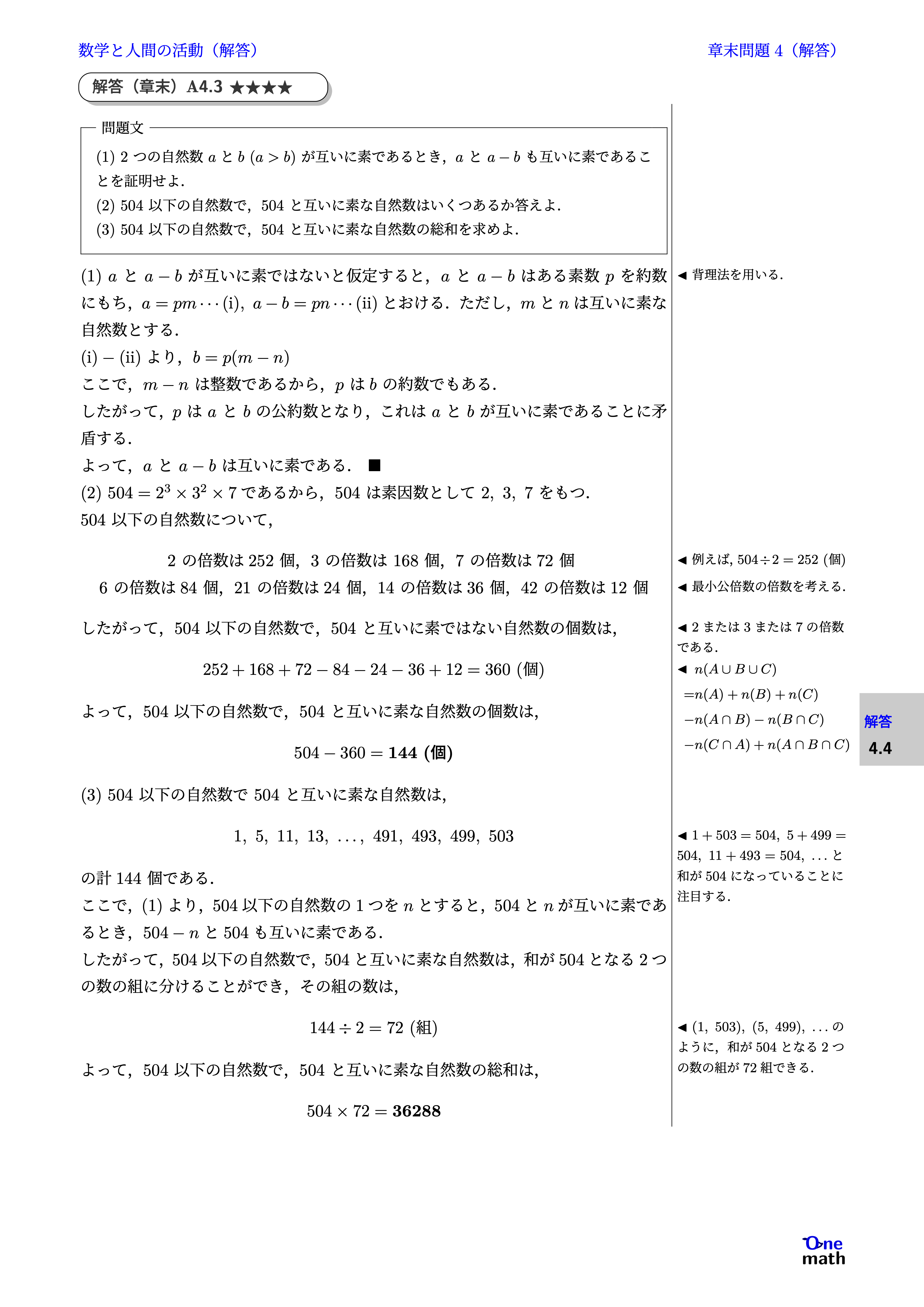 (1)$a$と$a-b$が互いに素ではないと仮定すると,$a$と$a-b$はある素数$p$を約数にもち, $ a = pm \cdots (\text{i}),a-b = pn \cdots (\text{ii}) $とおける.ただし,$m$と$n$は互いに素な自然数とする. $(\mathrm{i})-(\mathrm{ii})$より, $ b = p(m-n) $ ここで,$m-n$は整数であるから,$p$は$b$の約数でもある. したがって,$p$は$a$と$b$の公約数となり,これは$a$と$b$が互いに素であることに矛盾する. よって,$a$と$a-b$は互いに素である.$ \blacksquare$ (2)$504=2^3 \times 3^2 \times 7$であるから,504は素因数として$2,3,7$をもつ. 504以下の自然数について, 2の倍数は$252$個, 3の倍数は$168$個, 7の倍数は$72$個 6の倍数は$84$個, 21の倍数は$24$個, 14の倍数は$36$個, 42の倍数は$12$個 したがって,504以下の自然数で,504と互いに素ではない自然数の個数は, $$ 252 + 168 + 72 - 84 - 24 - 36 + 12 = 360 (\text{個}) $$ よって,504以下の自然数で,504と互いに素な自然数の個数は, $$ 504 - 360 = 144 (\text{個}) $$ (3)504以下の自然数で504と互いに素な自然数は, $$ 1,5,11,13,\ldots,491,493,499,503 $$ の計144個である. ここで,(1)より,504以下の自然数の1つを$n$とすると,504と$n$が互いに素であるとき,$504-n$と504も互いに素である. したがって,504以下の自然数で,504と互いに素な自然数は,和が504となる2つの数の組に分けることができ,その組の数は, $$ 144\div 2 = 72 (\text{組}) $$ よって,504以下の自然数で,504と互いに素な自然数の総和は, $$ 504 \times 72 = 36288 $$