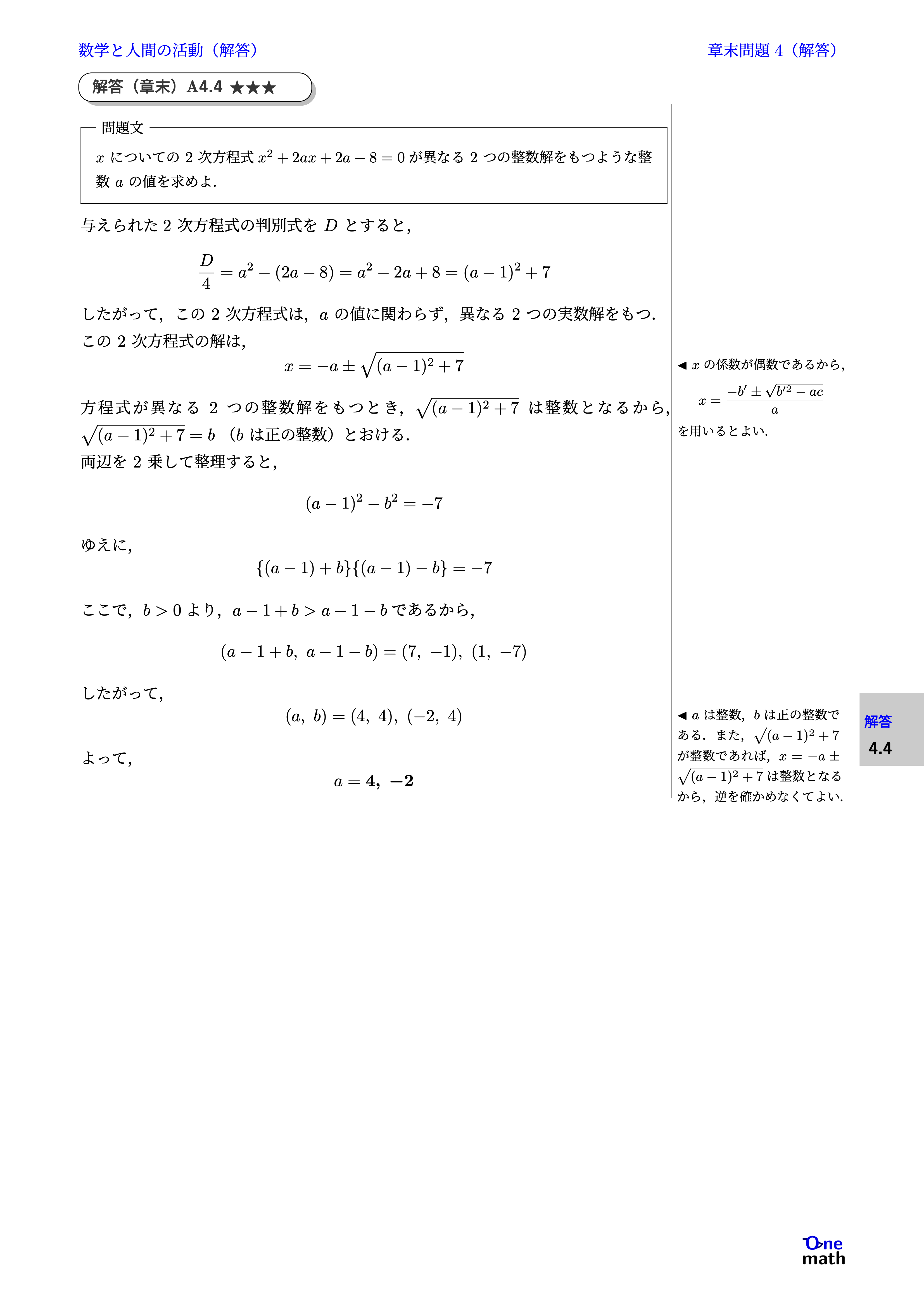 与えられた2次方程式の判別式を$D$とすると, $$ \frac{D}{4} = a^2 - (2a - 8) = a^2 - 2a + 8 = (a-1)^2 + 7 $$ したがって,この2次方程式は,$a$の値に関わらず,異なる$2$つの実数解をもつ. この2次方程式の解は,$$ x = -a \pm \sqrt{(a-1)^2+7} $$ 方程式が異なる2つの整数解をもつとき,$\sqrt{(a-1)^2+7}$は整数となるから,$\sqrt{(a-1)^2+7}=b$($b$は正の整数)とおける. 両辺を2乗して整理すると,$$(a-1)^2 - b^2 = -7$$ ゆえに,$$\{(a-1)+b\}\{(a-1)-b\} = -7$$ ここで,$b > 0$より,$a-1+b > a-1-b$であるから, $$ (a-1+b,a-1-b) = (7,-1),(1,-7) $$ したがって, $$ (a,b) = (4,4),(-2,4) $$ よって,$$a = 4,-2$$