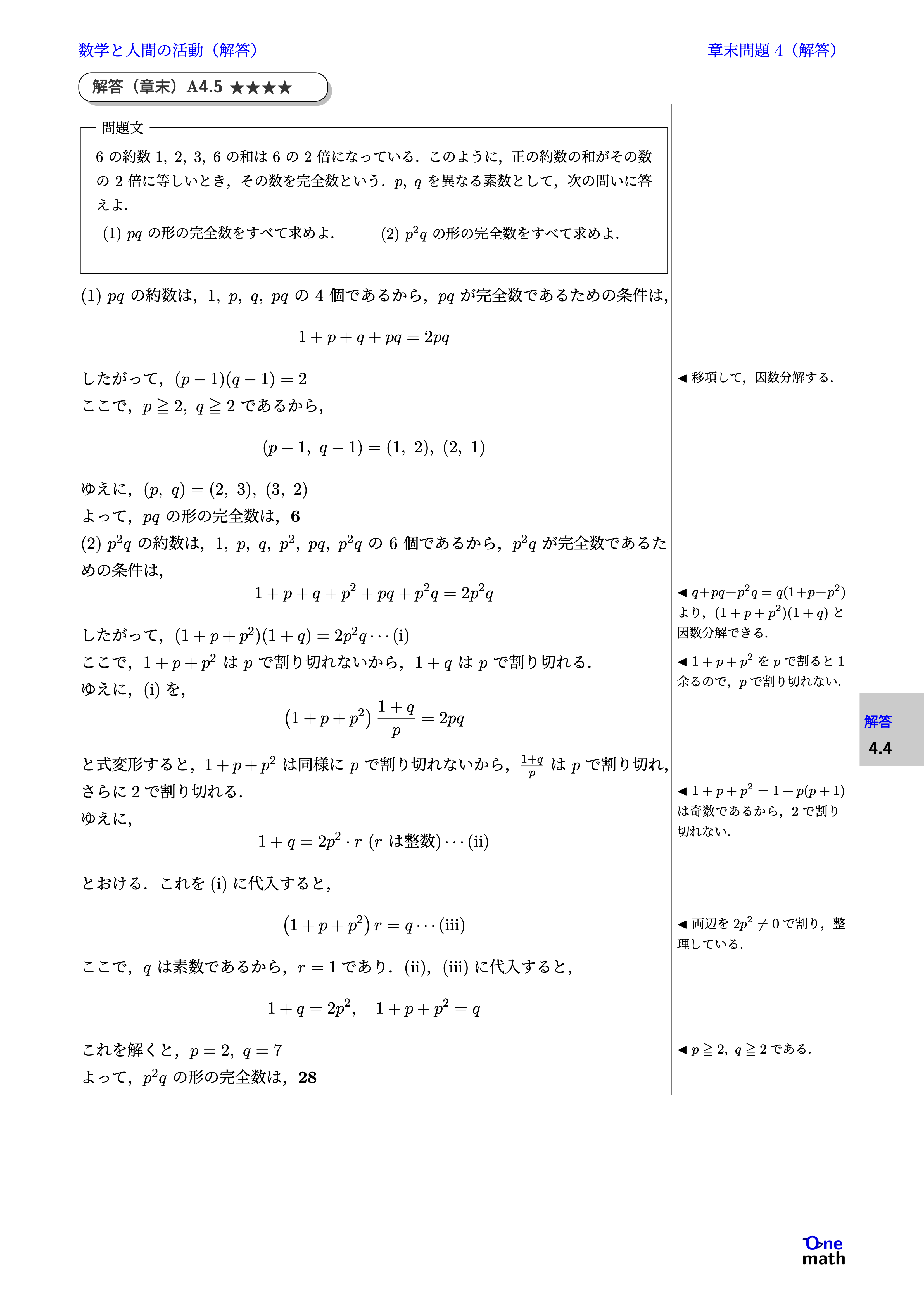 (1)$p q$の約数は,$1,p,q,p q$の4個であるから,$p q$が完全数であるための条件は, $$ 1 + p + q + p q = 2 p q $$ したがって,$(p-1)(q-1) = 2$ ここで,$p\geqq 2,q \geqq 2$であるから, $$ (p-1,q-1) = (1,2),(2,1) $$ ゆえに, $ (p,q) = (2,3),(3,2) $ よって,$p q$の形の完全数は,$6$ (2)$p^2 q$の約数は,$1,p,q,p^2,p q,p^2 q$の6個であるから,$p^2 q$が完全数であるための条件は, $$ 1 + p + q + p^2 + p q + p^2 q = 2 p^2 q $$ したがって,$(1 + p + p^2)(1 + q) = 2 p^2 q\cdots(\mathrm{i})$ ここで,$1 + p + p^2$は$p$で割り切れないから,$1 + q$は$p$で割り切れる. ゆえに,(i)を, $$ \left(1 + p + p^2\right) \frac{1 + q}{p} = 2 p q $$ と式変形すると,$1 + p + p^2$は同様に$p$で割り切れないから,$\frac{1 + q}{p}$は$p$で割り切れ,さらに2で割り切れる. ゆえに, $$ 1 + q = 2 p^2 \cdot r (r \text{ は整数})\cdots(\mathrm{ii}) $$ とおける.これを(i)に代入すると, $$ \left(1 + p + p^2\right) r = q\cdots(\mathrm{iii}) $$ ここで,$q$は素数であるから,$r = 1$であり.(ii),(iii)に代入すると, $$ 1 + q = 2 p^2,1 + p + p^2 = q $$ これを解くと,$p = 2,q = 7$ よって,$p^2 q$の形の完全数は,$28$