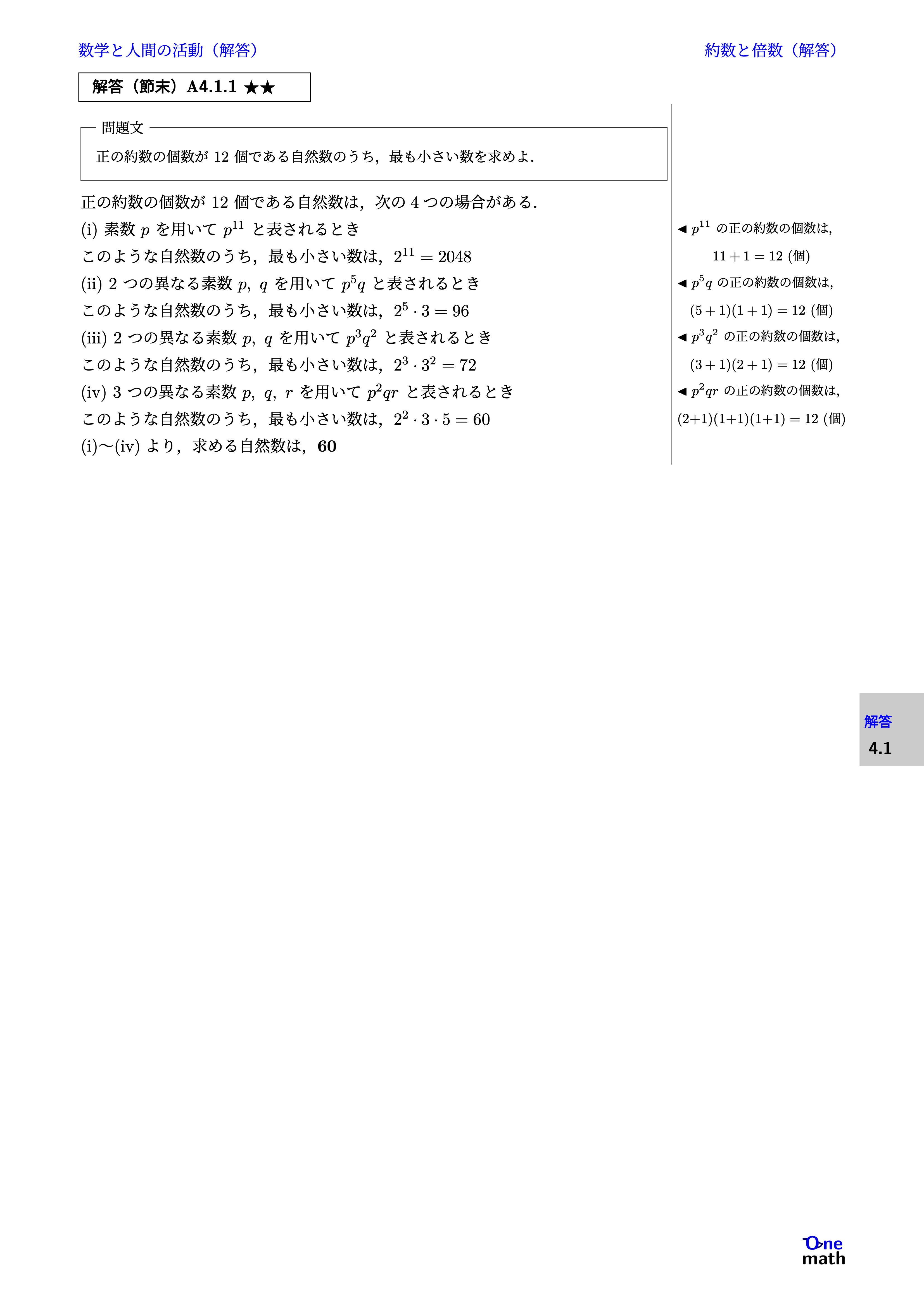 https://www.youtube.com/watch?v=tEacy_-IraM 問題の解答 検索用コード(LaTeX) % 例題A4.1.3:約数の個数と自然数 (One More)★★ (1)240の正の約数の個数と,正の約...