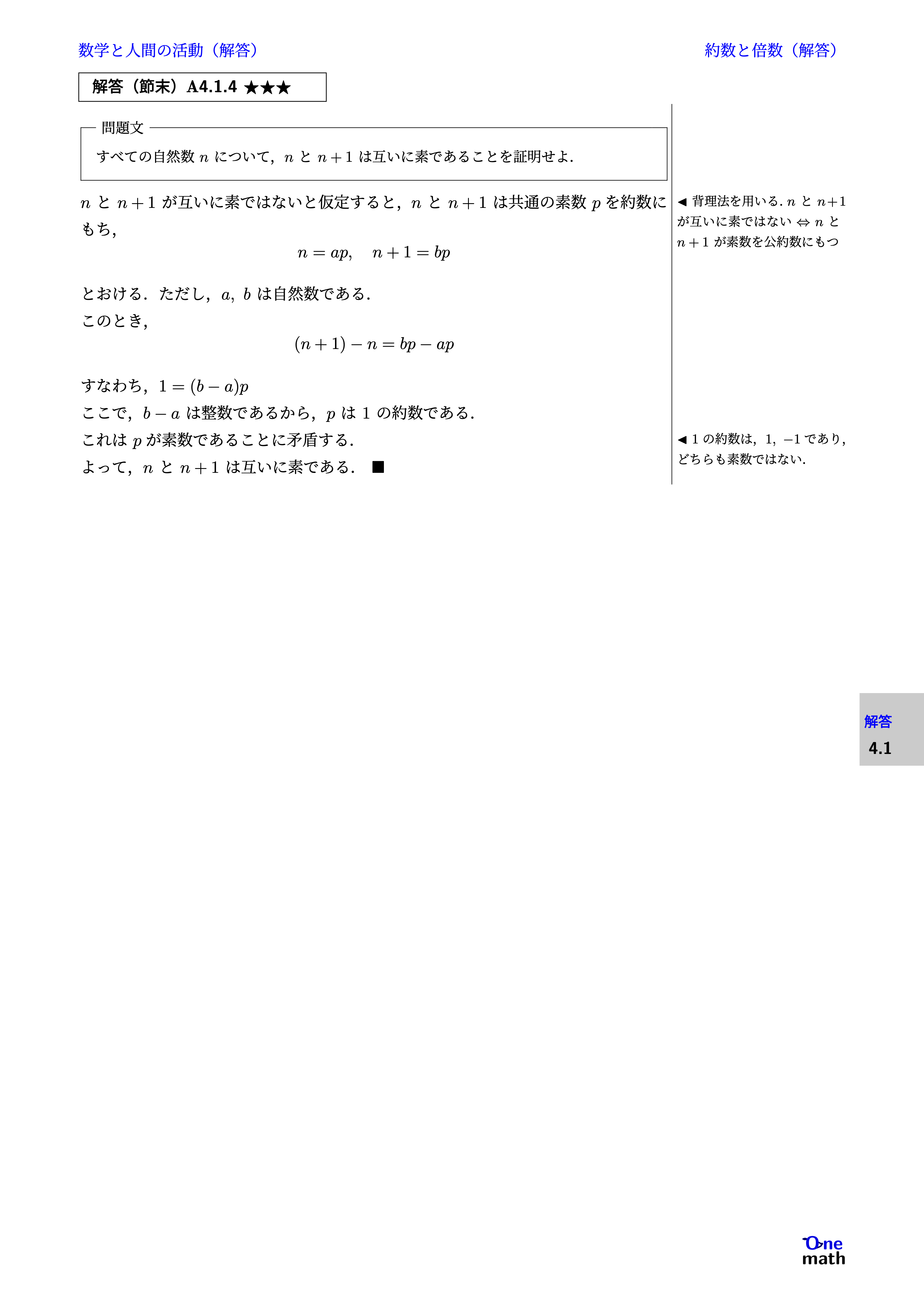 【数学A】例題4.1.7:互いに素に関する証明1(One More)★★