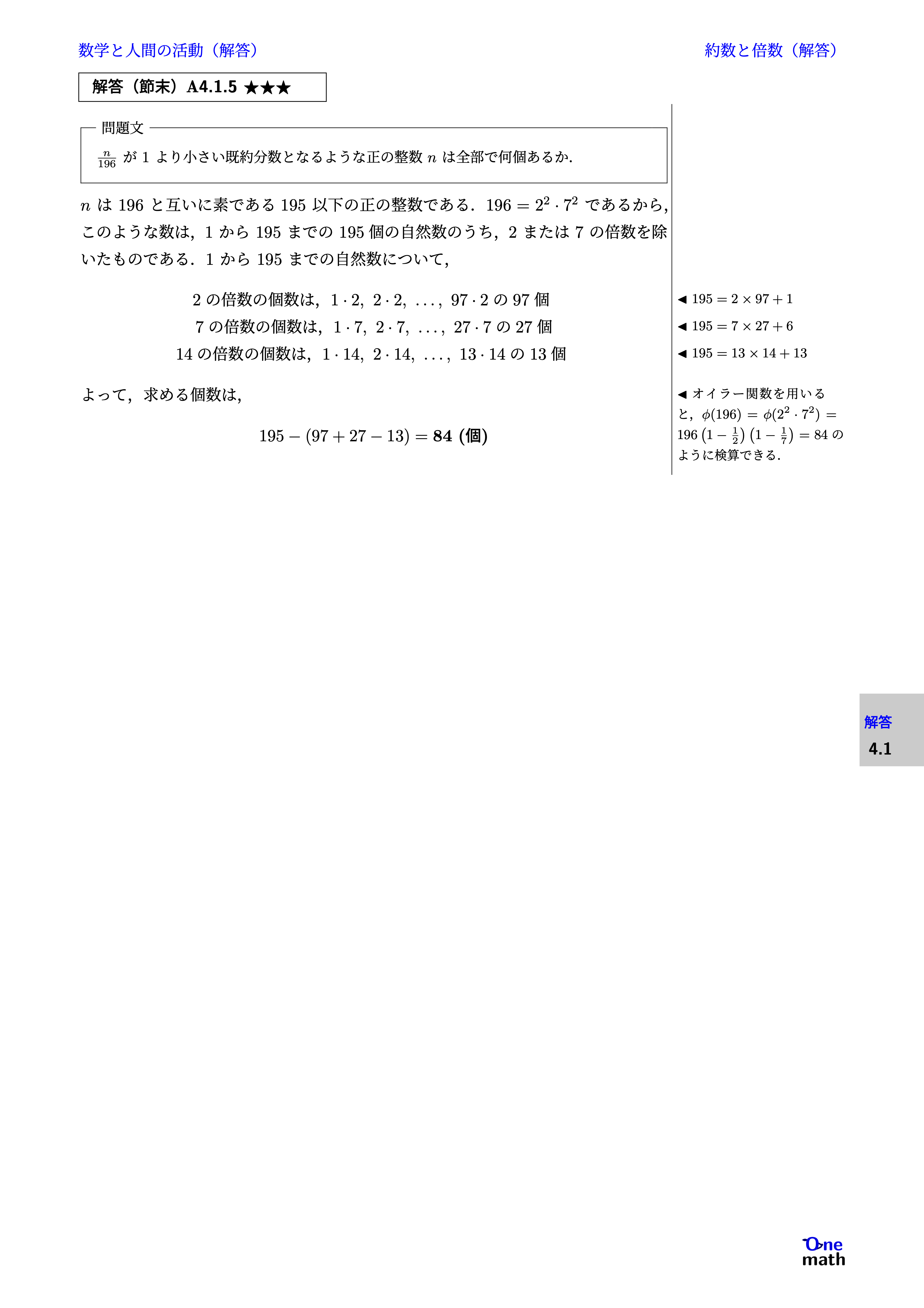 https://www.youtube.com/watch?v=MB7OL7iFd24 問題の解答 検索用コード(LaTeX) % 例題A4.1.9:互いに素な自然数の個数 (One More)★★★ $n$以下の自然数で,$n$と互い...
