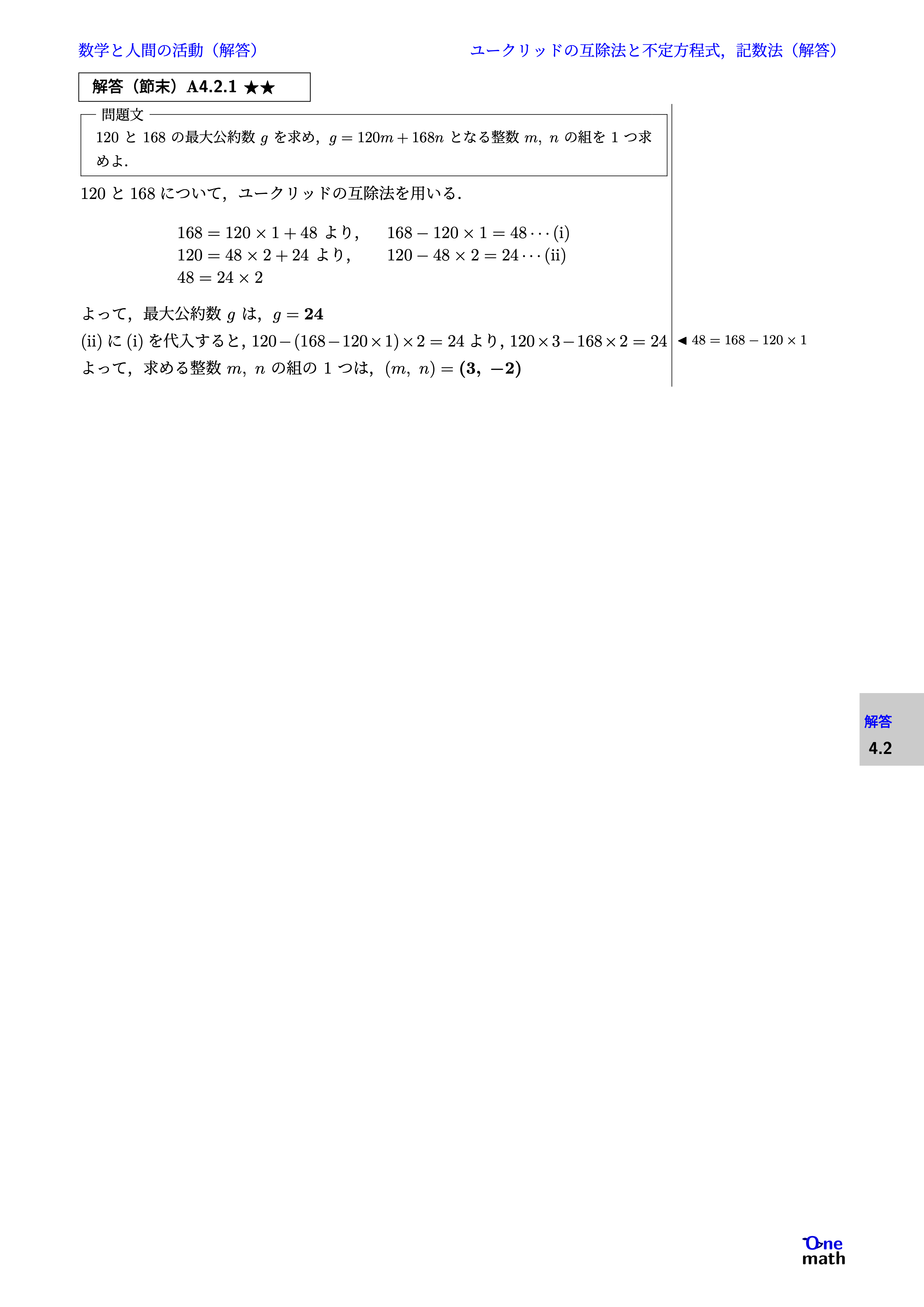 120と168について,ユークリッドの互除法を用いる. $$ \begin{array}{ll} 168 = 120 \times 1 + 48 \text{ より,} & 168 - 120 \times 1 = 48\cdots(\mathrm{i})\\ 120 = 48 \times 2 + 24 \text{より,} & 120 - 48 \times 2 = 24\cdots(\mathrm{ii})\\ 48 = 24 \times 2 & \end{array} $$ よって,最大公約数$g$は,$g = 24$ (ii)に(i)を代入すると,$120 - (168 - 120 \times 1) \times 2 = 24$より, $120 \times 3 - 168 \times 2 = 24$ よって,求める整数$m,n$の組の1つは, $(m,n) = (3,-2)$
