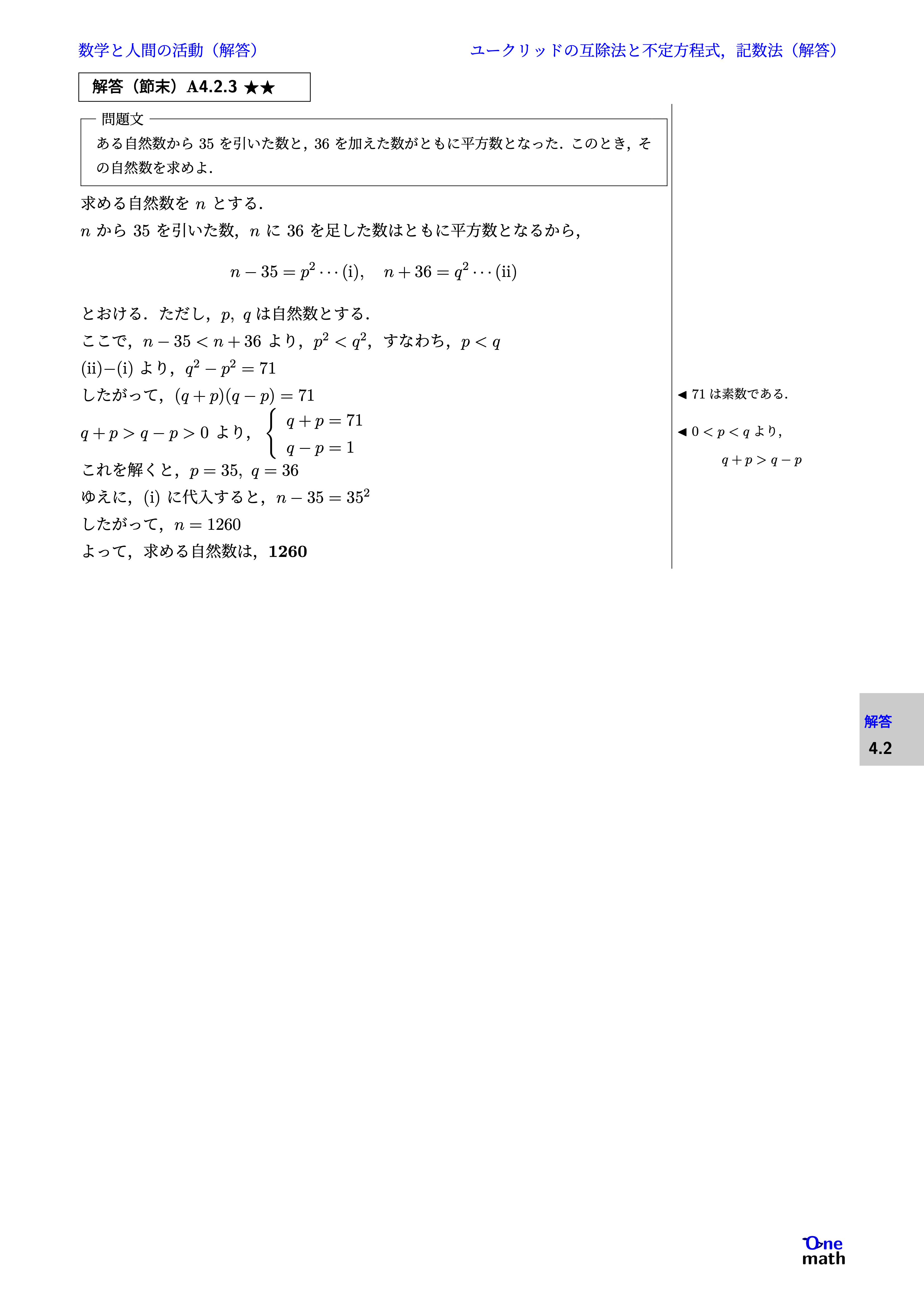 求める自然数を$n$とする. $n$から35を引いた数,$n$に36を足した数はともに平方数となるから, $$ n - 35 = p^2 \cdots(\mathrm{i}),n + 36 = q^2 \cdots(\mathrm{ii}) $$ とおける.ただし,$p,q$は自然数とする. ここで,$n - 35 < n + 36$より,$p^2 < q^2$,すなわち,$p < q$ (ii)$-$(i)より, $q^2 - p^2 = 71$ したがって, $(q + p)(q - p) = 71$ $q + p > q - p > 0$より, $\begin{aligned} &\left\{ \begin{array}{l} q + p = 71 \\ q - p = 1 \end{array} \right . \end{aligned}$ これを解くと, $p = 35,q = 36$ ゆえに,(i)に代入すると, $n - 35 = 35^2$ したがって, $n = 1260$ よって,求める自然数は,$1260$