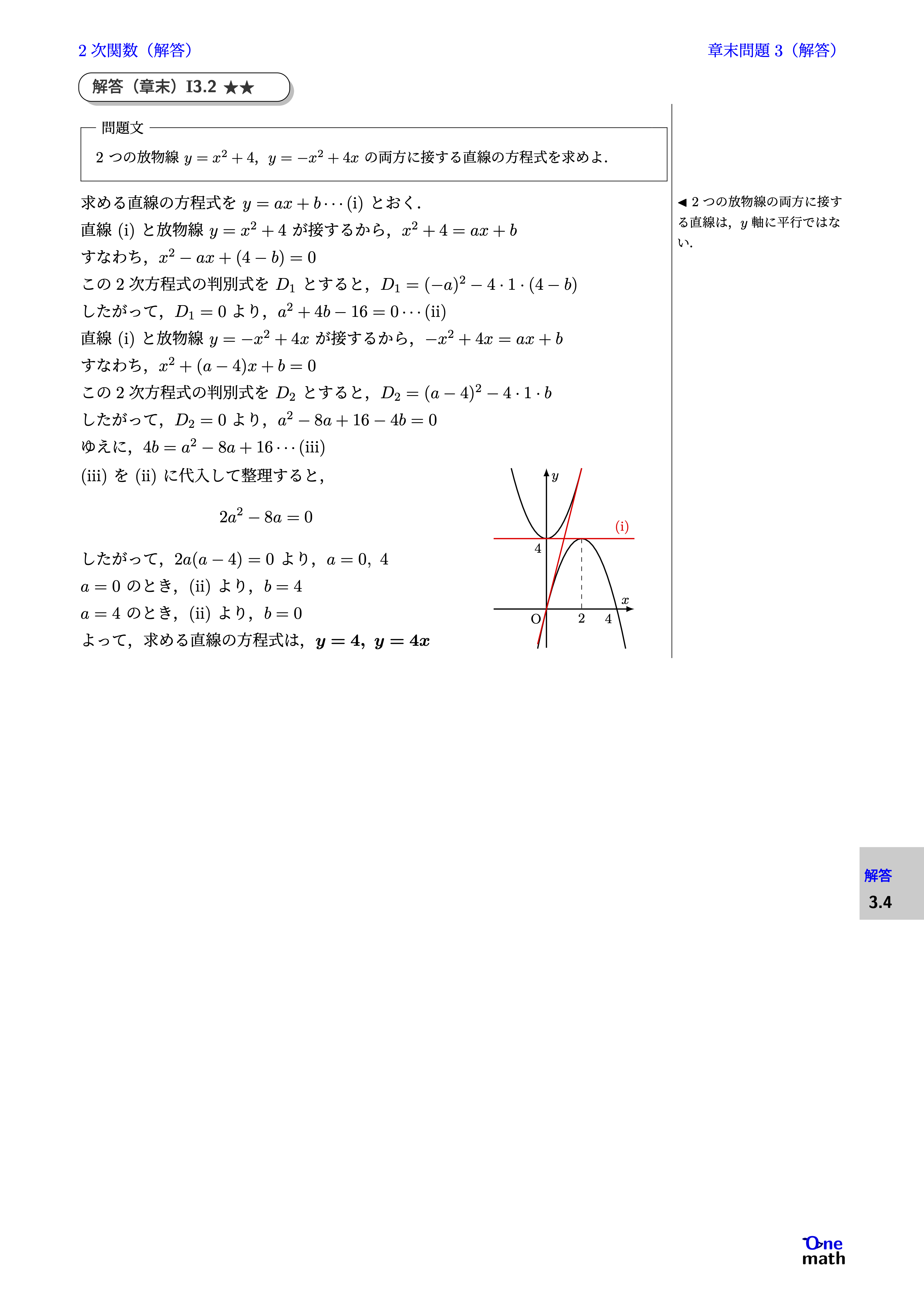 求める直線の方程式を$y=ax+b \cdots(\mathrm{i})$とおく. 直線(i)と放物線$y=x^2+4$が接するから, $ x^2+4=ax+b $ すなわち,$x^2-ax+(4-b)=0$ この2次方程式の判別式を$D_1$とすると, $ D_1=(-a)^2-4 \cdot 1 \cdot(4-b) $ したがって,$D_1=0$より,$a^2+4b-16=0 \cdots(\mathrm{ii})$ 直線(i)と放物線$y=-x^2+4x$が接するから, $ -x^2+4x=ax+b$ すなわち,$x^2+(a-4)x+b=0$ この2次方程式の判別式を$D_2$とすると, $ D_2=(a-4)^2-4 \cdot 1 \cdot b $ したがって,$D_2=0$より,$a^2-8a+16-4b=0$ ゆえに,$4b=a^2-8a+16 \cdots(\mathrm{iii})$ (iii)を(ii)に代入して整理すると, $$ 2a^2-8a=0 $$ したがって,$2a(a-4)=0$より,$a=0, 4$ $a=0$のとき,(ii)より,$b=4$ $a=4$のとき,(ii)より,$b=0$ よって,求める直線の方程式は,$y=4, y=4x$