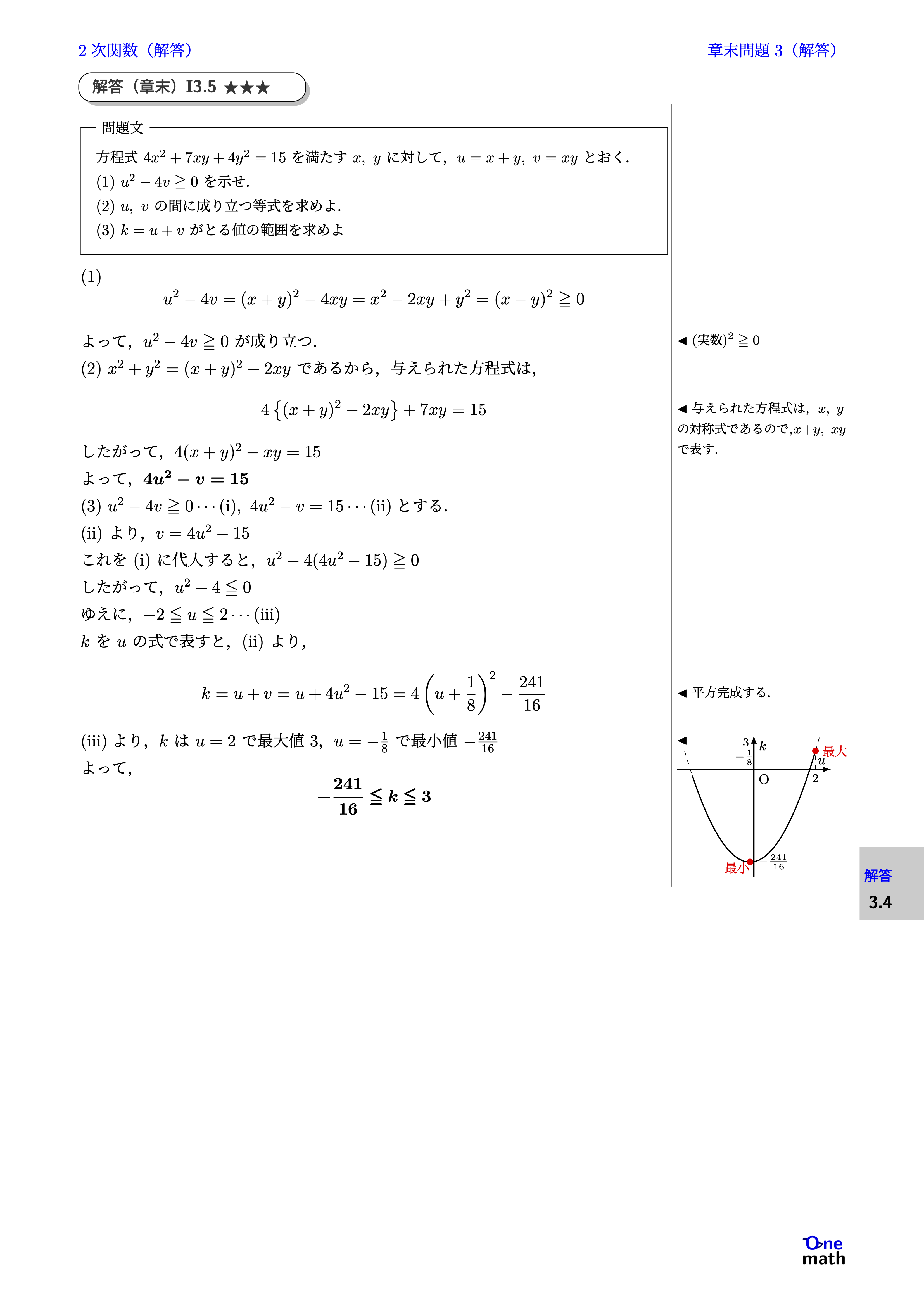 (1)$$u^2-4v=(x+y)^2-4xy=x^2-2xy+y^2=(x-y)^2 \geqq 0$$ よって,$u^2-4v \geqq 0$が成り立つ. (2)$x^2+y^2=(x+y)^2-2xy$であるから,与えられた方程式は, $$ 4\left\{(x+y)^2-2xy\right\}+7xy=15 $$ したがって,$4(x+y)^2-xy=15$ よって,$4u^2-v=15$ (3)$u^2-4v \geqq 0\cdots(\mathrm{i}), 4u^2-v=15\cdots(\mathrm{ii})$とする. (ii)より,$v=4u^2-15$ これを(i)に代入すると, $ u^2-4(4u^2-15) \geqq 0 $ したがって, $ u^2-4 \leqq 0 $ ゆえに,$-2 \leqq u \leqq 2\cdots(\mathrm{iii})$ $k$を$u$の式で表すと,(ii)より, $$ k=u+v=u+4u^2-15=4\left(u+\frac{1}{8}\right)^2-\frac{241}{16} $$ (iii)より,$k$は$u=2$で最大値$3$,$u=-\frac{1}{8}$で最小値$-\frac{241}{16}$ よって,$$-\frac{241}{16} \leqq k \leqq 3$$