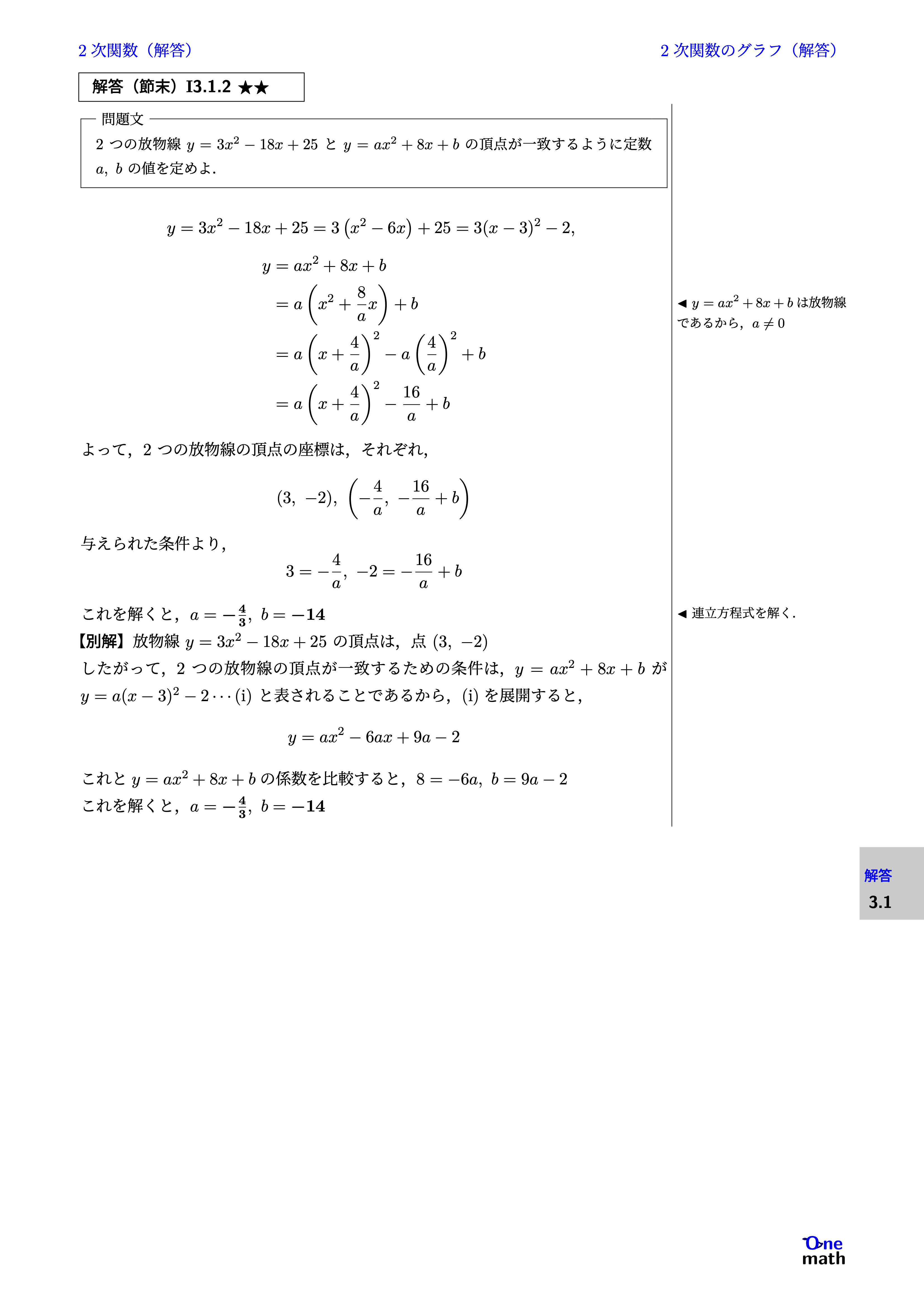 $$y=3x^2-18x+25=3\left(x^2-6x\right)+25 =3(x-3)^2-2, $$ $$ \begin{aligned} y &=ax^2+8x+b \\ &=a\left(x^2+\frac{8}{a}x\right)+b \\ &=a\left(x+\frac{4}{a}\right)^2-a\left(\frac{4}{a}\right)^2+b \\ &=a\left(x+\frac{4}{a}\right)^2-\frac{16}{a}+b \end{aligned} $$ よって,2つの放物線の頂点の座標は,それぞれ, $$ (3,-2), \left(-\frac{4}{a},-\frac{16}{a}+b\right) $$ 与えられた条件より, $$ 3=-\frac{4}{a},-2=-\frac{16}{a}+b $$ これを解くと,$a=-\frac{4}{3}, b=-14$ 別解:放物線$y=3x^2-18x+25$の頂点は,点$(3,-2)$ したがって,2つの放物線の頂点が一致するための条件は,$y=ax^2+8x+b$が$y=a(x-3)^2-2\cdots(\mathrm{i})$と表されることであるから,(i)を展開すると, $$ y=ax^2-6ax+9a-2 $$ これと$y=ax^2+8x+b$の係数を比較すると, $ 8=-6a, b=9a-2$ これを解くと,$a=-\frac{4}{3}, b=-14$
