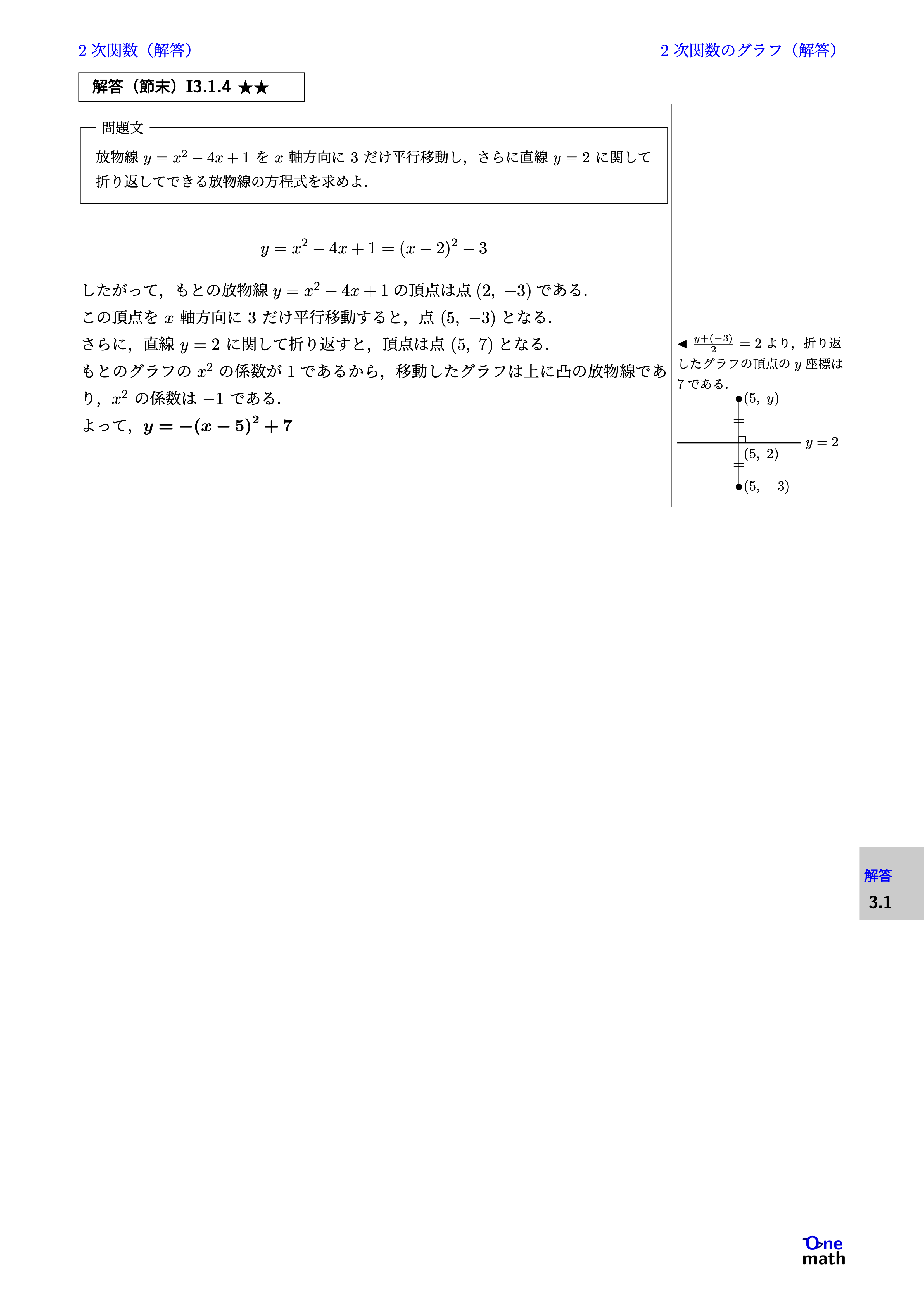 $$ y=x^2-4x+1=(x-2)^2-3 $$ したがって,もとの放物線$y=x^2-4x+1$の頂点は点$(2,-3)$である. この頂点を$x$軸方向に3だけ平行移動すると,点$(5,-3)$となる. さらに,直線$y=2$に関して折り返すと,頂点は点$(5, 7)$となる. もとのグラフの$x^2$の係数が$1$であるから,移動したグラフは上に凸の放物線であり,$x^2$の係数は$-1$である. よって,$y=-(x-5)^2+7$