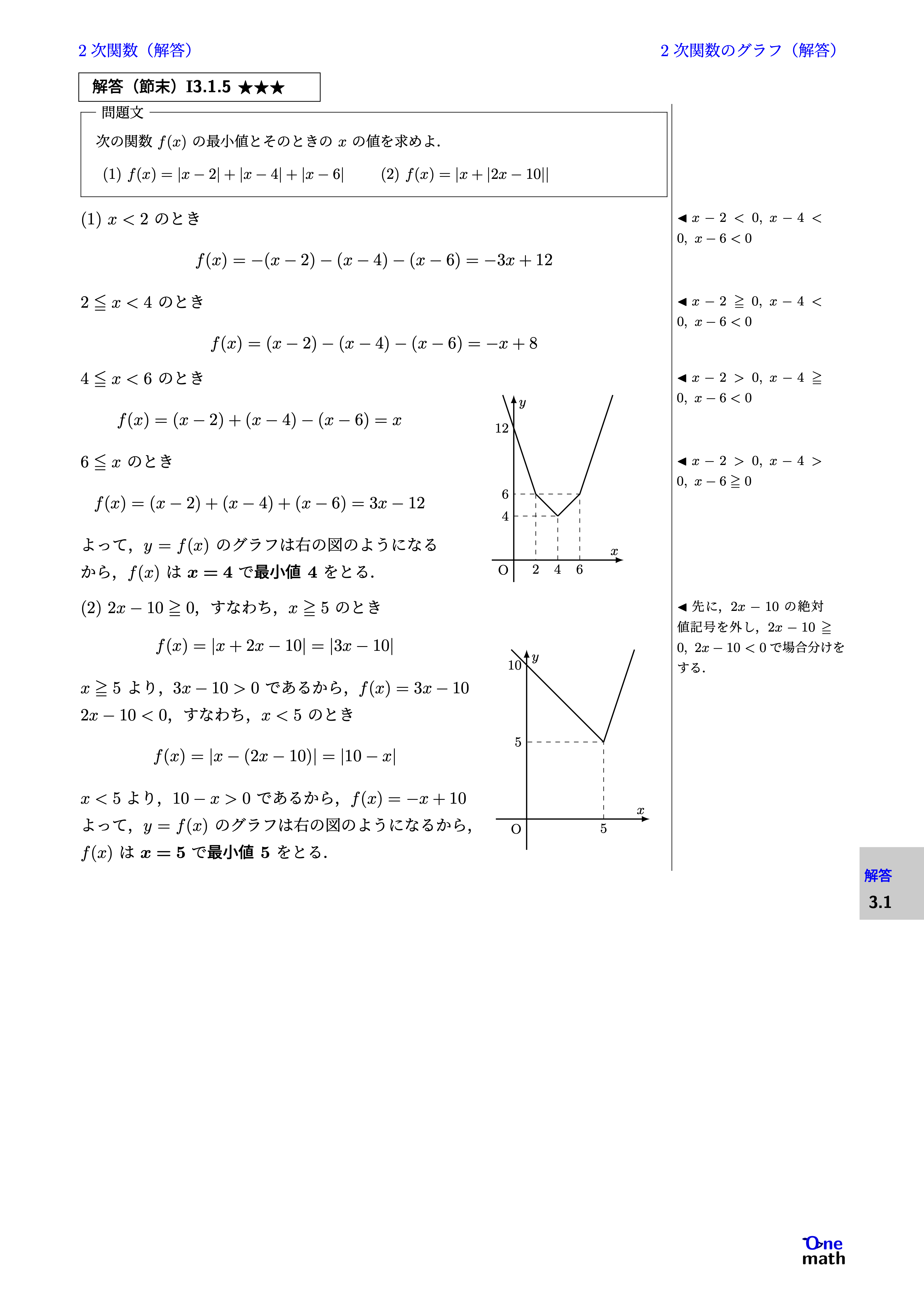 (1)$x<2$のとき $$ f(x)=-(x-2)-(x-4)-(x-6)=-3x+12 $$ $2 \leqq x<4$のとき $$ f(x)=(x-2)-(x-4)-(x-6)=-x+8 $$ $4 \leqq x<6$のとき $$ f(x)=(x-2)+(x-4)-(x-6)=x $$ $6 \leqq x$のとき $$ f(x)=(x-2)+(x-4)+(x-6)=3x-12 $$ よって,$y=f(x)$のグラフは右の図の ようになるから,$f(x)$は $x=4$で最小値4をとる. (2)$2x-10 \geqq 0$,すなわち,$x \geqq 5$のとき $$ f(x)=|x+2x-10|=|3x-10| $$ $x \geqq 5$より,$3x-10>0$であるから,$f(x)=3x-10$ $2x-10<0$,すなわち,$x<5$のとき $$ f(x)=|x-(2x-10)| =|10-x| $$ $x<5$より,$10-x>0$であるから, $ f(x)=-x+10 $ よって,$y=f(x)$のグラフは右の図のようになるから,$f(x)$は $x=5$で最小値5をとる.
