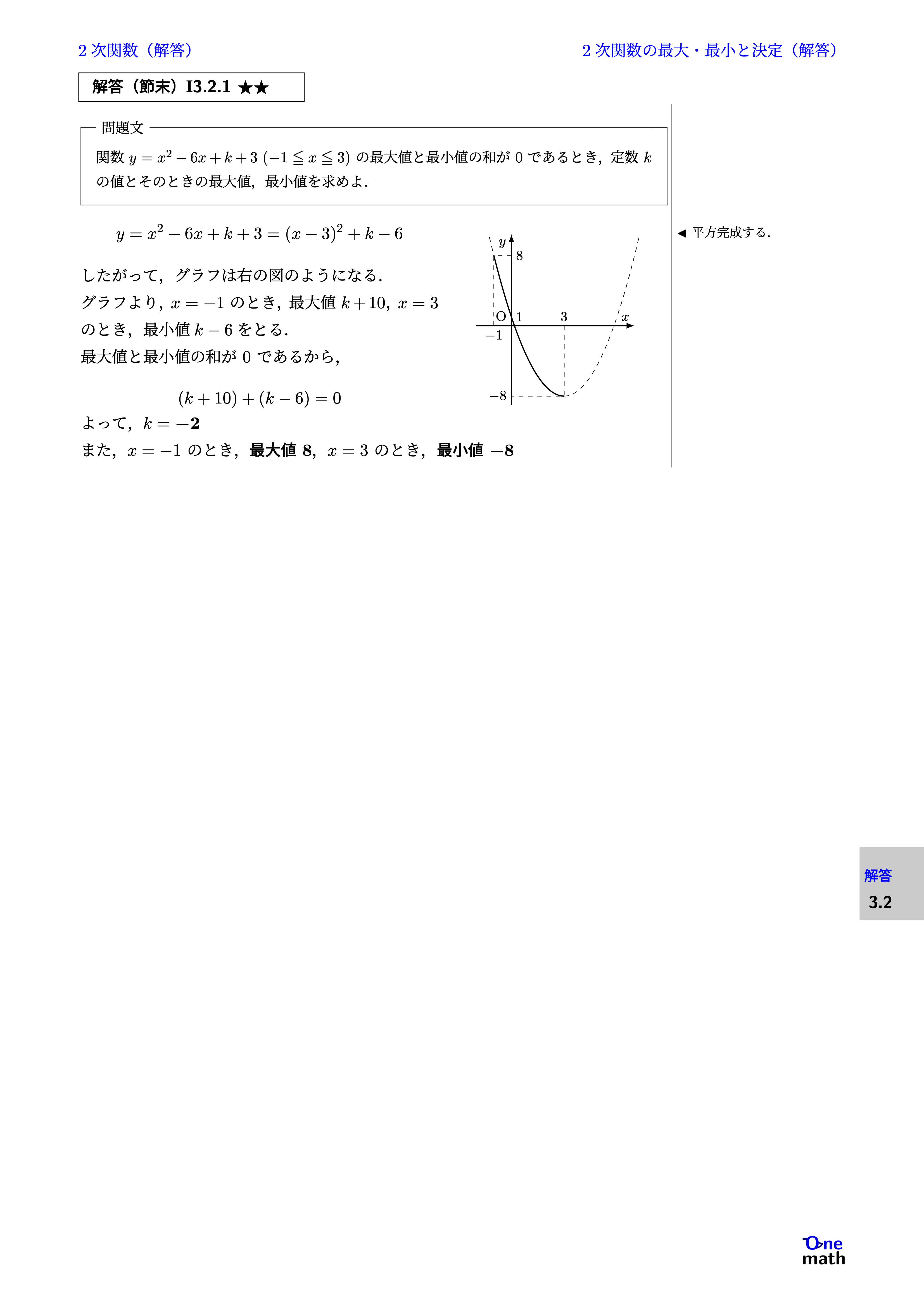 $$ y=x^2-6x+k+3 =(x-3)^2+k-6 $$ したがって,グラフは右の図のようになる. グラフより,$x=-1$のとき,最大値$k+10$,$x=3$のとき,最小値$k-6$をとる. 最大値と最小値の和が$0$であるから, $$ (k+10)+(k-6)=0 $$ よって,$k=-2$ また,$x=-1$のとき,最大値$8$,$x=3$のとき,最小値$-8$