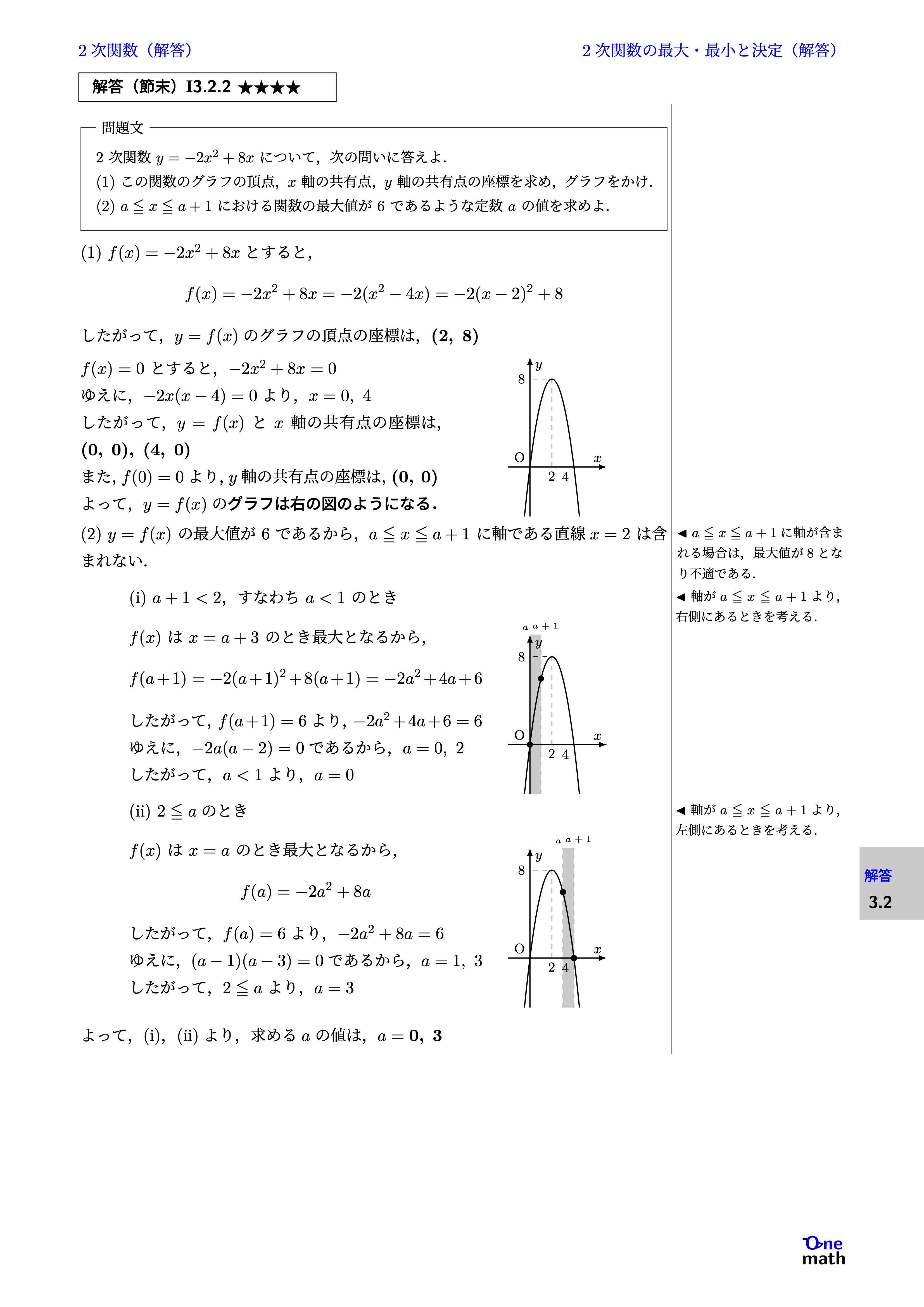 【数学I】例題3.2.6:定義域が変化するときの最大・最小(One More)★★★ https://www.youtube.com/watch?v=VgjJwNB7Zbk 問題の解答 検索用コード(LaTeX) % 例題I3.2.6:定義域が変化するときの最大・最小 (One More)★★★ 関数$f(x)=x^2-2 x...
