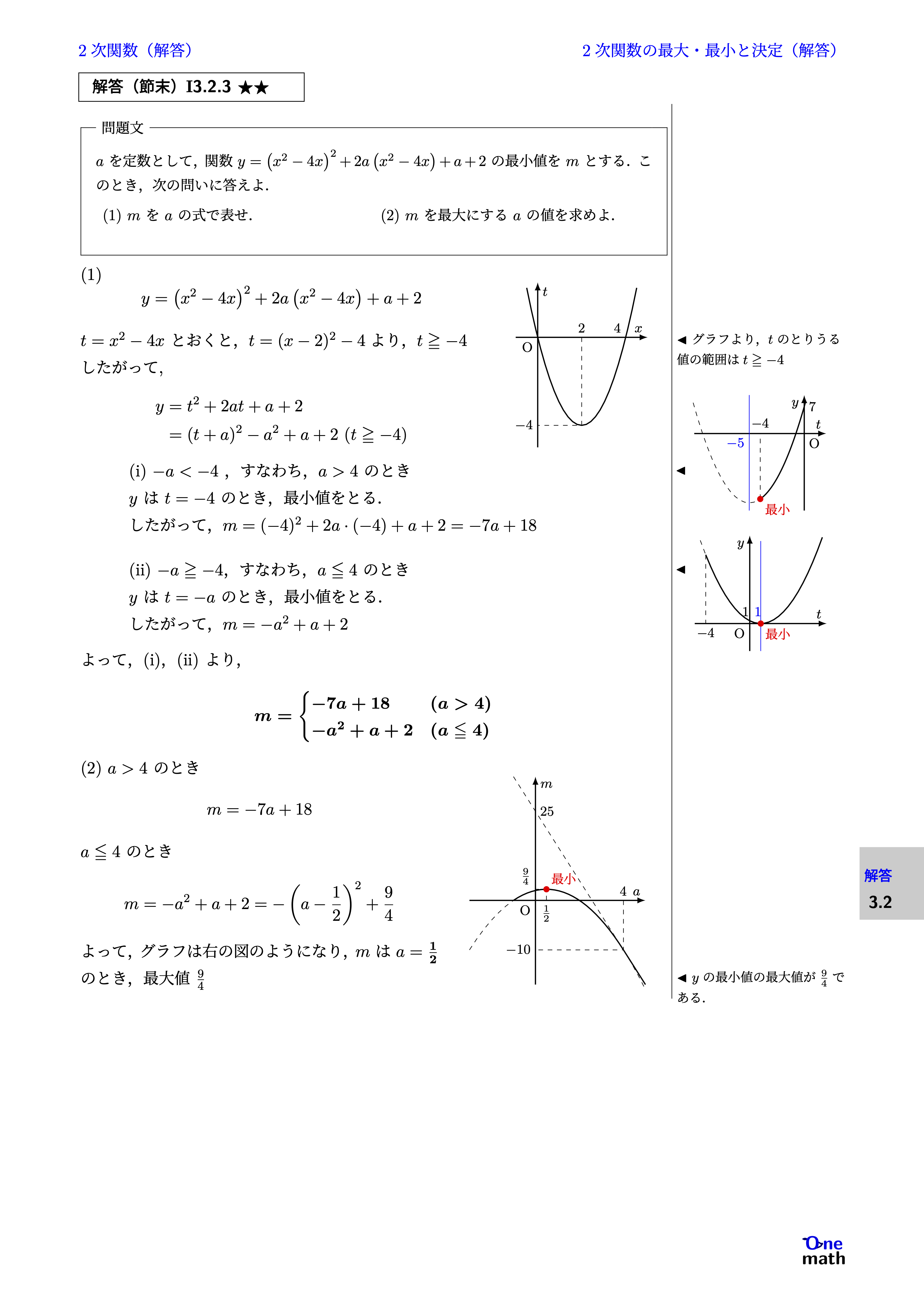 (1) $$ y=\left(x^2-4x\right)^2+2a\left(x^2-4x\right)+a+2$$ $t=x^2-4x$とおくと, $t=(x-2)^2-4$より,$t \geqq -4$ したがって, $$ \begin{aligned} y &=t^2+2at+a+2 \\ &=(t+a)^2-a^2+a+2(t \geqq -4) \end{aligned} $$ (i)$-a<-4$,すなわち,$a>4$のとき $y$は$t=-4$のとき,最小値をとる. したがって,$m=(-4)^2+2a\cdot(-4)+a+2=-7a+18$ (ii)$-a \geqq -4$,すなわち,$a \leqq 4$のとき $y$は$t=-a$のとき,最小値をとる. したがって,$m=-a^2+a+2$ よって,(i),(ii)より, $$ m=\begin{cases}-7a+18 &(a>4)\\-a^2+a+2 &(a \leqq 4)\end{cases} $$ (2)$a>4$のとき $$ m=-7a+18 $$ $a \leqq 4$のとき $$ m=-a^2+a+2=-\left(a-\frac{1}{2}\right)^2+\frac{9}{4} $$ よって,グラフは右の図のようになり,$m$は$a=\frac{1}{2}$のとき,最大値$\frac{9}{4}$