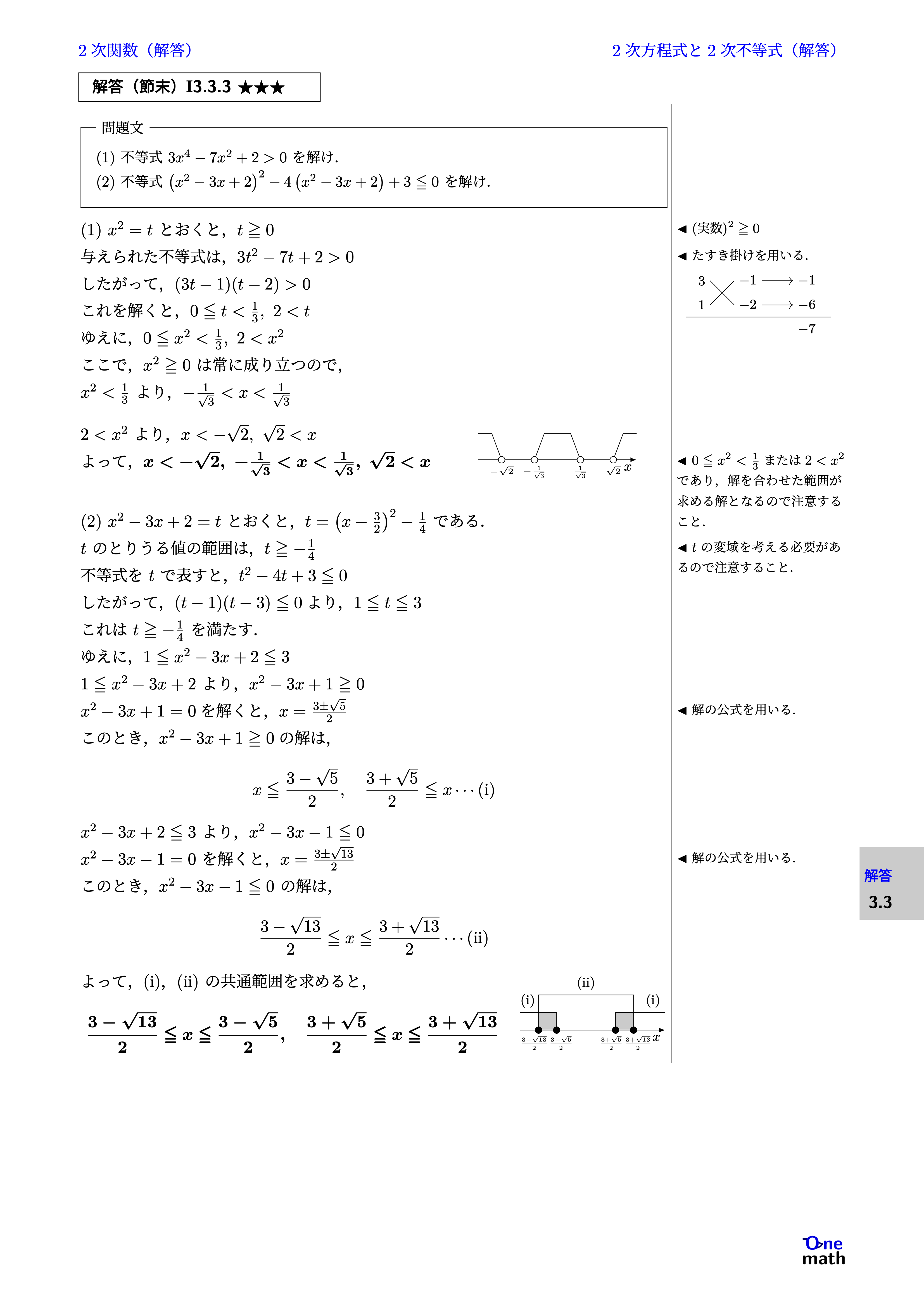 (1)$x^2=t$とおくと,$t \geqq 0$ 与えられた不等式は,$3t^2-7t+2>0$ したがって,$(3t-1)(t-2)>0$ これを解くと,$0 \leqq t<\frac{1}{3}, 2<t$ ゆえに,$0 \leqq x^2<\frac{1}{3}, 2<x^2$ ここで,$x^2 \geqq 0$は常に成り立つので, $x^2<\frac{1}{3}$より,$-\frac{1}{\sqrt{3}}<x<\frac{1}{\sqrt{3}}$ $2<x^2$より,$x<-\sqrt{2}, \sqrt{2}<x$ よって,$x<-\sqrt{2},-\frac{1}{\sqrt{3}}<x<\frac{1}{\sqrt{3}}, \sqrt{2}<x$ (2)$x^2-3x+2=t$とおくと,$t=\left(x-\frac{3}{2}\right)^2-\frac{1}{4}$である. $t$のとりうる値の範囲は,$t \geqq -\frac{1}{4}$ 不等式を$t$で表すと,$t^2-4t+3 \leqq 0$ したがって,$(t-1)(t-3) \leqq 0$より,$1 \leqq t \leqq 3$ これは$t \geqq -\frac{1}{4}$を満たす. ゆえに,$1 \leqq x^2-3x+2 \leqq 3$ $1 \leqq x^2-3x+2$より,$x^2-3x+1 \geqq 0$ $x^2-3x+1=0$を解くと,$x=\frac{3\pm \sqrt{5}}{2}$ このとき,$x^2-3x+1 \geqq 0$の解は, $$x \leqq \frac{3-\sqrt{5}}{2}, \frac{3+\sqrt{5}}{2} \leqq x\cdots(\mathrm{i})$$ $x^2-3x+2 \leqq 3$より,$x^2-3x-1 \leqq 0$ $x^2-3x-1=0$を解くと,$x=\frac{3 \pm \sqrt{13}}{2}$ このとき,$x^2-3x-1 \leqq 0$の解は, $$ \frac{3-\sqrt{13}}{2} \leqq x \leqq \frac{3+\sqrt{13}}{2}\cdots(\mathrm{ii}) $$ よって,(i),(ii)の共通範囲を求めると, $$ \frac{3-\sqrt{13}}{2} \leqq x \leqq \frac{3-\sqrt{5}}{2}, \frac{3+\sqrt{5}}{2} \leqq x \leqq \frac{3+\sqrt{13}}{2} $$