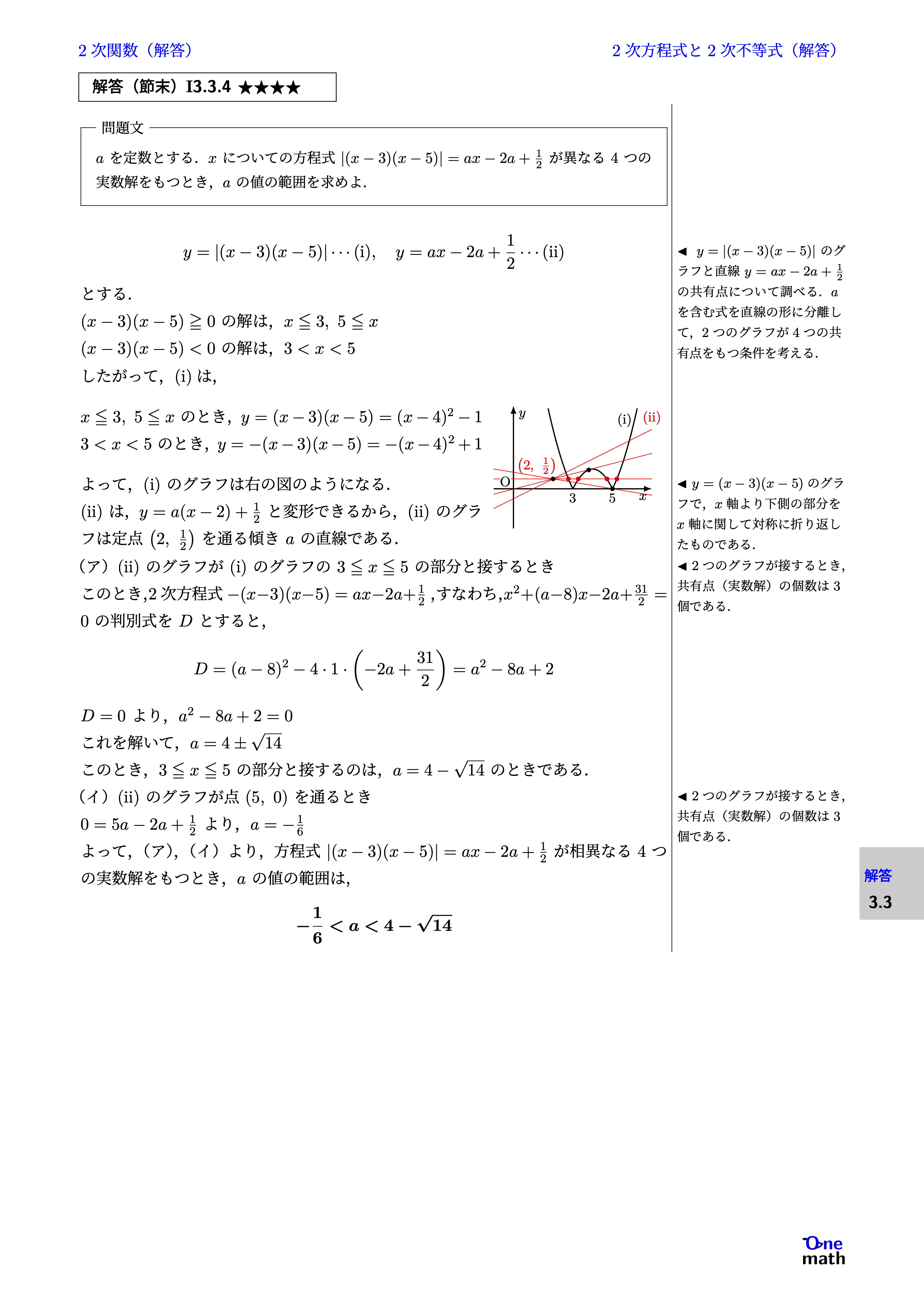 $$ y=|(x-3)(x-5)| \cdots(\mathrm{i}) , y=ax-2a+\frac{1}{2} \cdots(\mathrm{ii}) $$ とする. $(x-3)(x-5) \geqq 0$の解は,$x \leqq 3, 5 \leqq x$ $(x-3)(x-5)<0$の解は,$3<x<5$ したがって,(i)は, $x \leqq 3, 5 \leqq x$のとき,$y=(x-3)(x-5)=(x-4)^2-1$ $3<x<5$のとき,$y=-(x-3)(x-5)=-(x-4)^2+1$ よって,(i)のグラフは右の図のようになる. (ii)は,$y=a(x-2)+\frac{1}{2}$と変形できるから,(ii)のグラフは定点$\left(2, \frac{1}{2}\right)$を通る傾き$a$の直線である. (ア)(ii)のグラフが(i)のグラフの$3 \leqq x \leqq 5$の部分と接するとき このとき,2次方程式$-(x-3)(x-5)=ax-2a+\frac{1}{2}$,すなわち,$x^2+(a-8)x-2a+\frac{31}{2}=0$の判別式を$D$とすると, $$ D=(a-8)^2-4\cdot 1\cdot \left(-2a+\frac{31}{2}\right)=a^2-8a+2 $$ $D=0$より,$a^2-8a+2=0$ これを解いて,$a=4\pm \sqrt{14}$ このとき,$3 \leqq x \leqq 5$の部分と接するのは,$a=4-\sqrt{14}$のときである. (イ)(ii)のグラフが点$(5, 0)$を通るとき $0=5a-2a+\frac{1}{2}$より,$a=-\frac{1}{6}$ よって,(ア),(イ)より,方程式$|(x-3)(x-5)|=ax-2a+\frac{1}{2}$が相異なる4つの実数解をもつとき,$a$の値の範囲は, $$ -\frac{1}{6}<a<4-\sqrt{14} $$