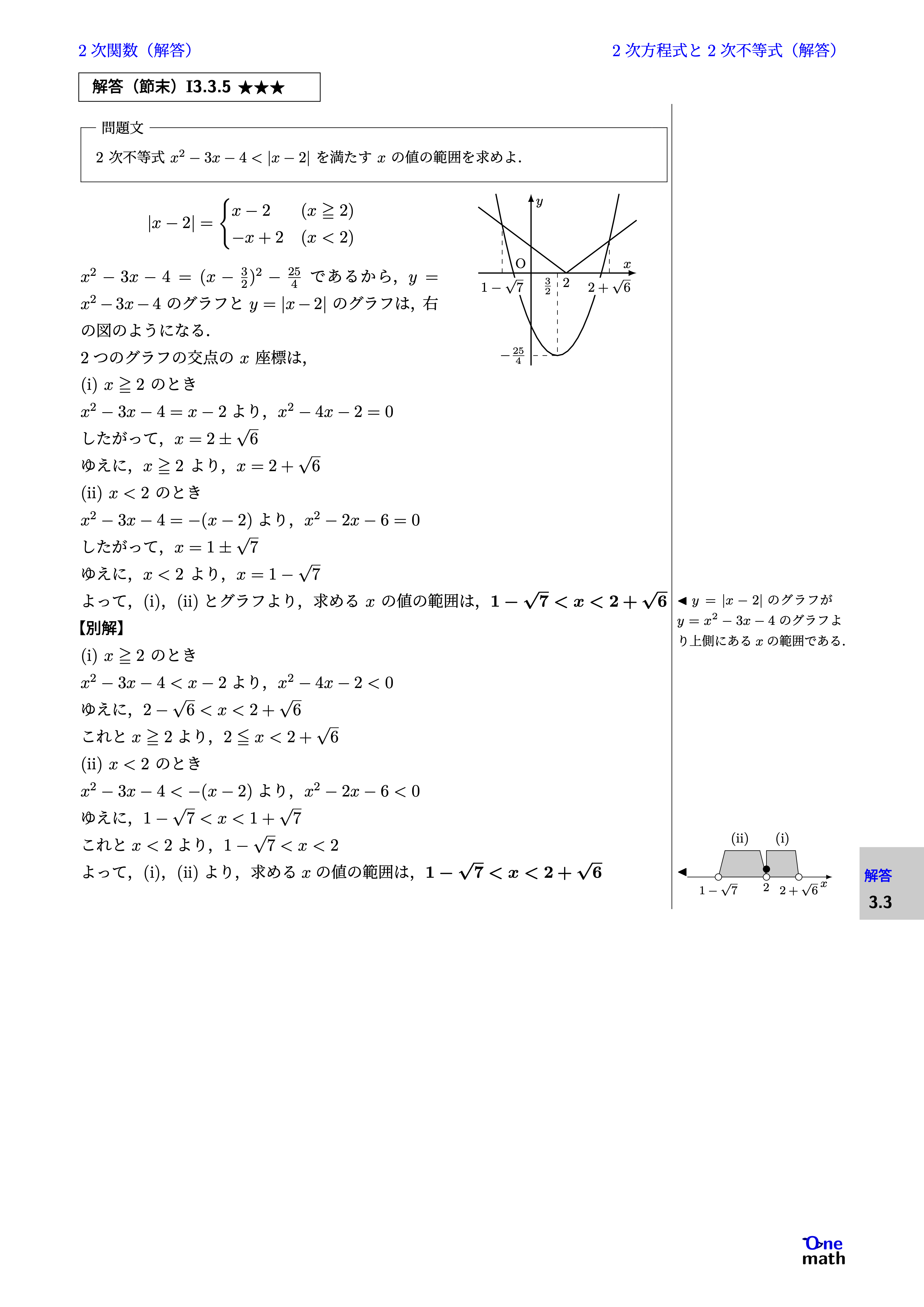 $$ \begin{aligned} |x-2| &=\begin{cases} x-2 &(x \geqq 2)\\ -x+2 &(x<2) \end{cases} \end{aligned} $$ $x^2-3x-4=(x-\frac{3}{2})^2-\frac{25}{4}$であるから,$y=x^2-3x-4$のグラフと$y=|x-2|$のグラフは,右の図のようになる. 2つのグラフの交点の$x$座標は, (i)$x \geqq 2$のとき $x^2-3x-4=x-2$より,$x^2-4x-2=0$ したがって,$x=2 \pm \sqrt{6}$ ゆえに,$x \geqq 2$より,$x=2+\sqrt{6}$ (ii)$x<2$のとき $x^2-3x-4=-(x-2)$より,$x^2-2x-6=0 $ したがって,$x=1 \pm \sqrt{7}$ ゆえに,$x<2$より,$x=1-\sqrt{7}$ よって,(i),(ii)とグラフより,求める$x$の値の範囲は,$1-\sqrt{7}<x<2+\sqrt{6}$ 別解: (i)$x \geqq 2$のとき $x^2-3x-4<x-2 $より,$x^2-4x-2<0 $ ゆえに,$2-\sqrt{6}<x<2+\sqrt{6}$ これと$x \geqq 2$より,$2 \leqq x<2+\sqrt{6}$ (ii)$x<2$のとき $x^2-3x-4<-(x-2)$より,$x^2-2x-6<0 $ ゆえに,$1-\sqrt{7}<x<1+\sqrt{7}$ これと$x<2$より,$ 1-\sqrt{7}<x<2 $ よって,(i),(ii)より,求める$x$の値の範囲は,$1-\sqrt{7}<x<2+\sqrt{6}$